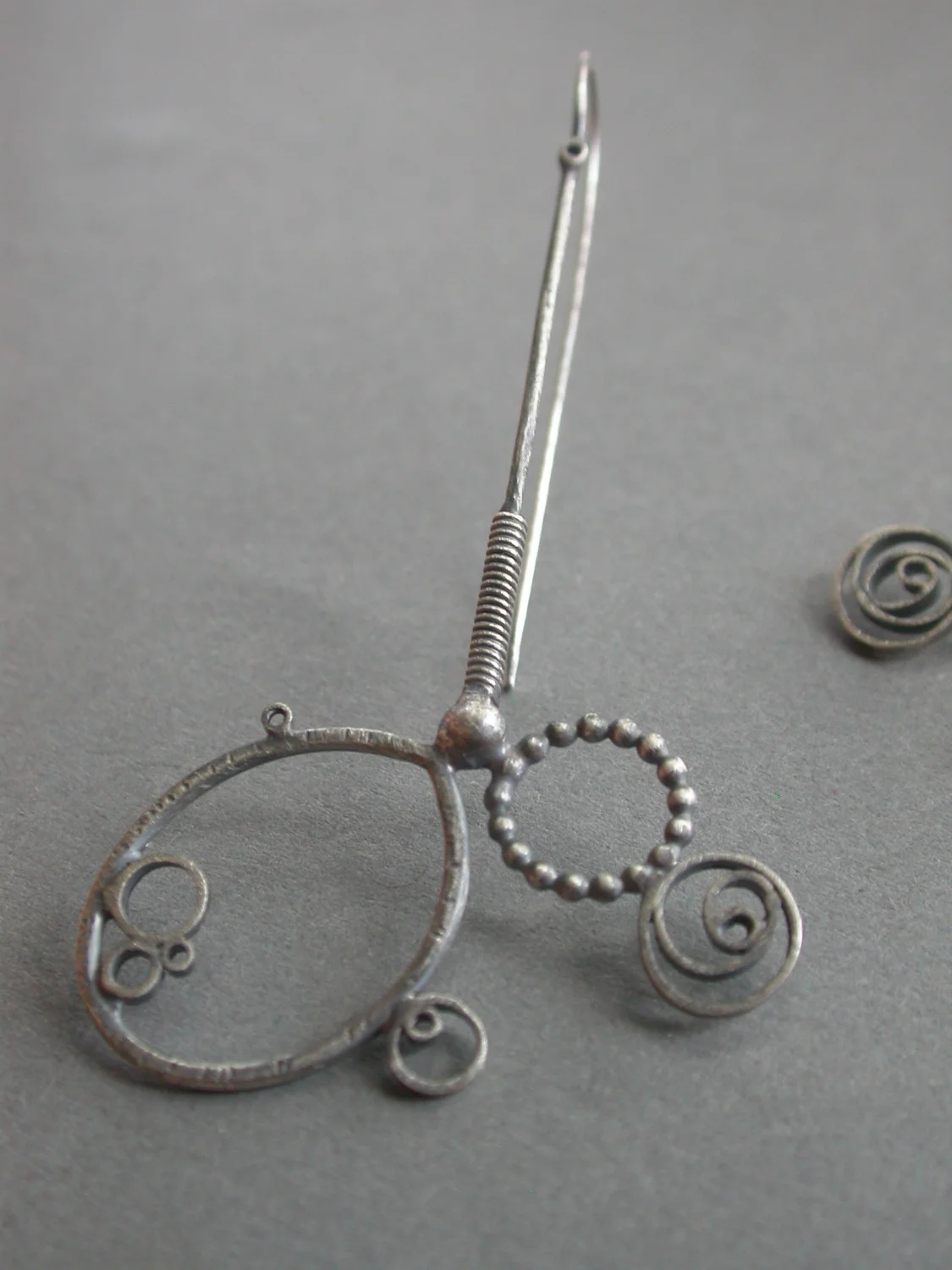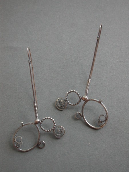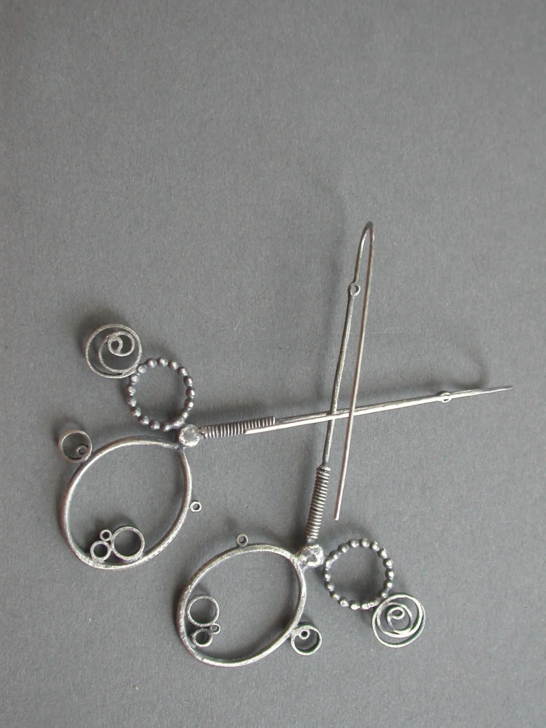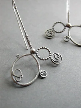 these earrings are all hand fabricated by me in my studio in austin, tx. they are made of sterling wire and sheet metal that is manipulated, soldered, sanded, oxidized & sanded again to bring out back some of the sterling to the surface