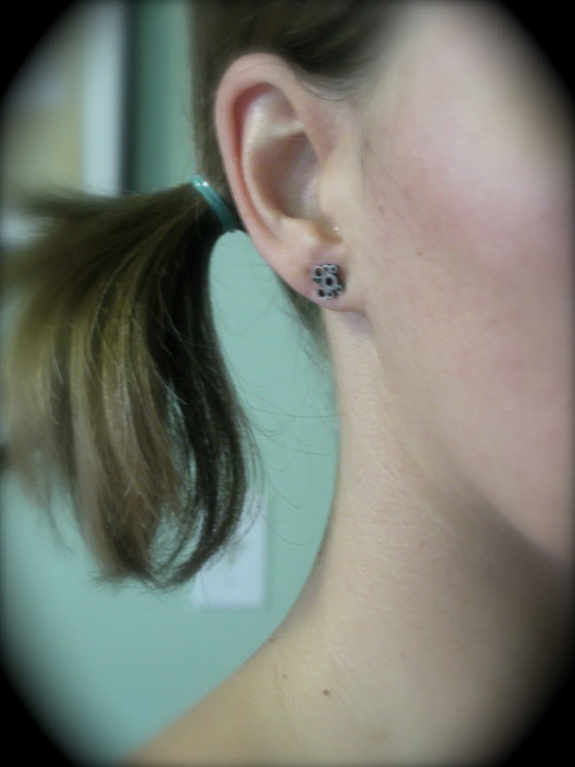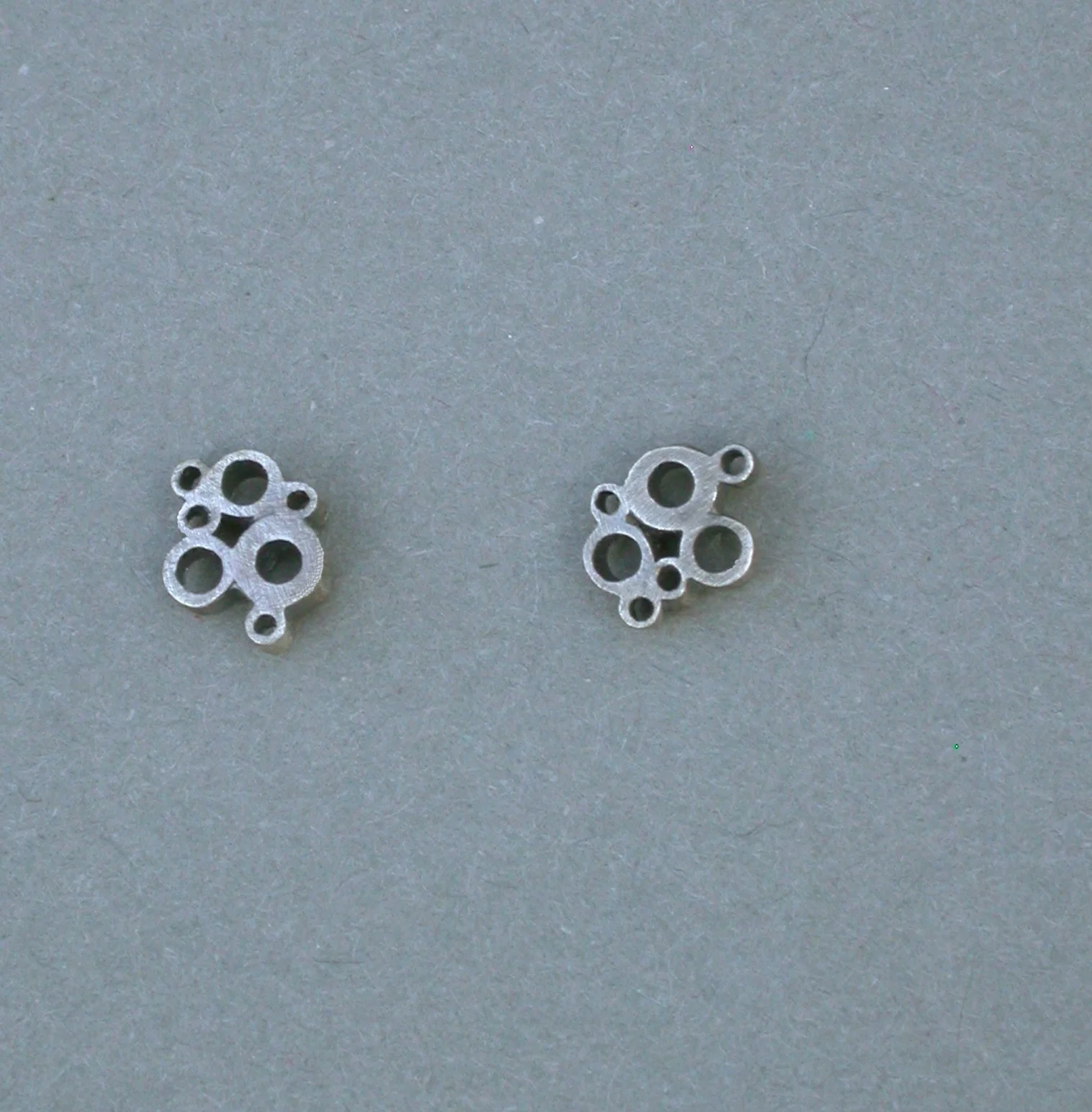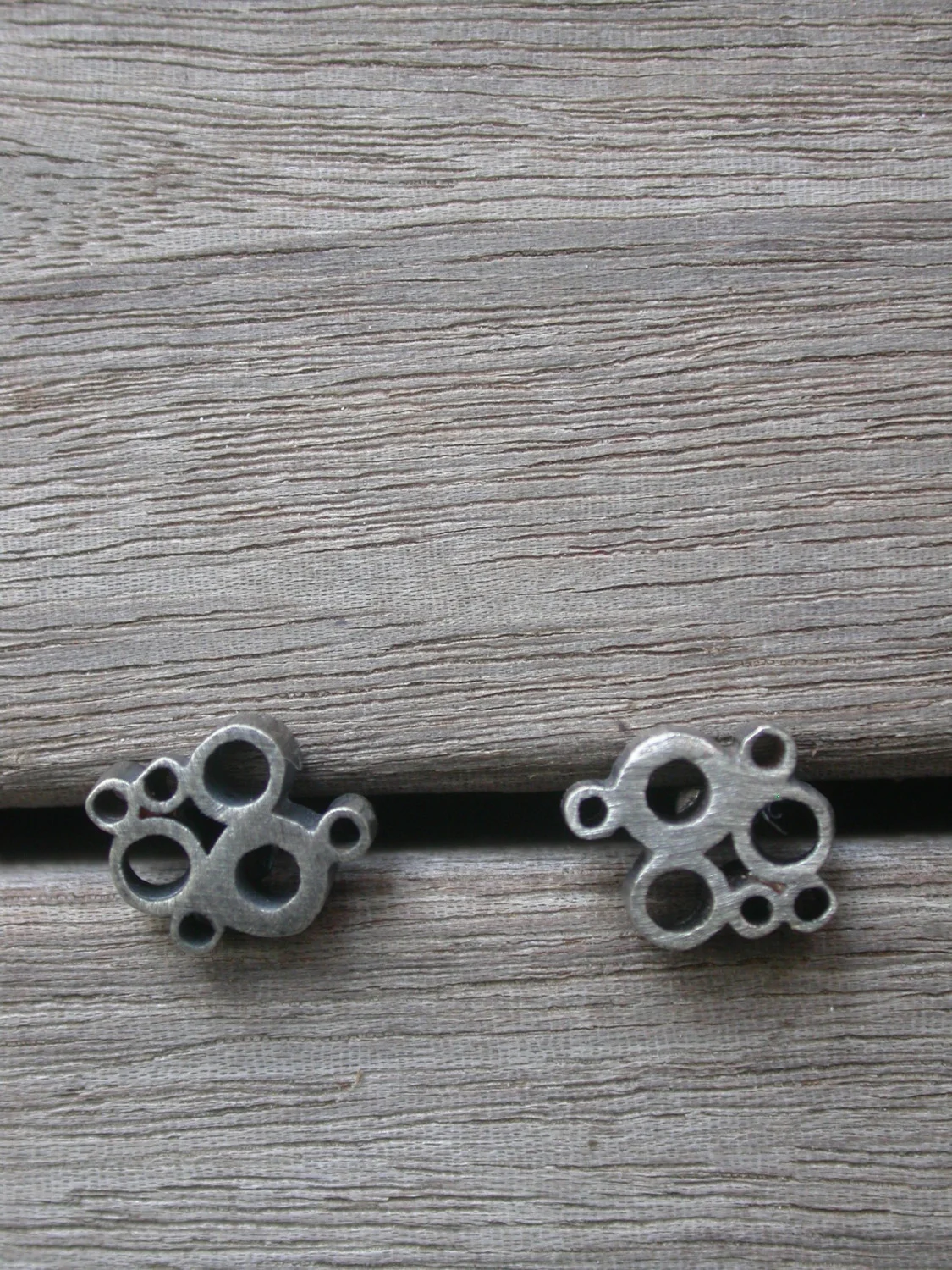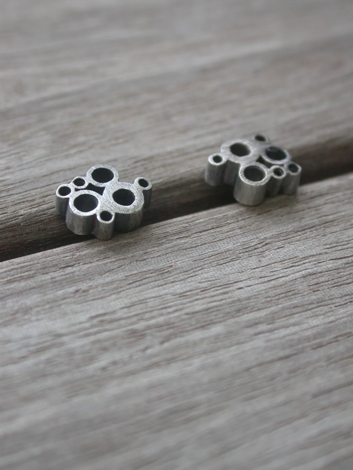 these "bubble earrings" are made of oxidized sterling silver, all hand cut tubing, individually soldered together, sanded, oxidized, then lightly sanded again to finish.