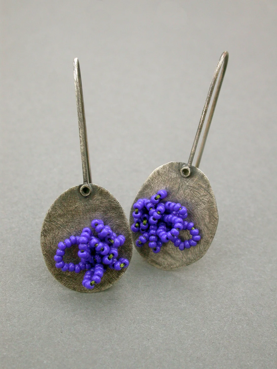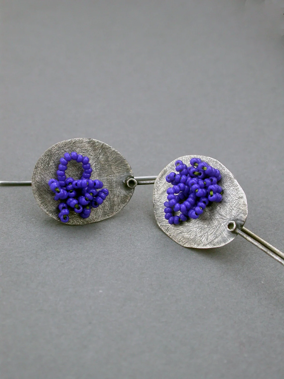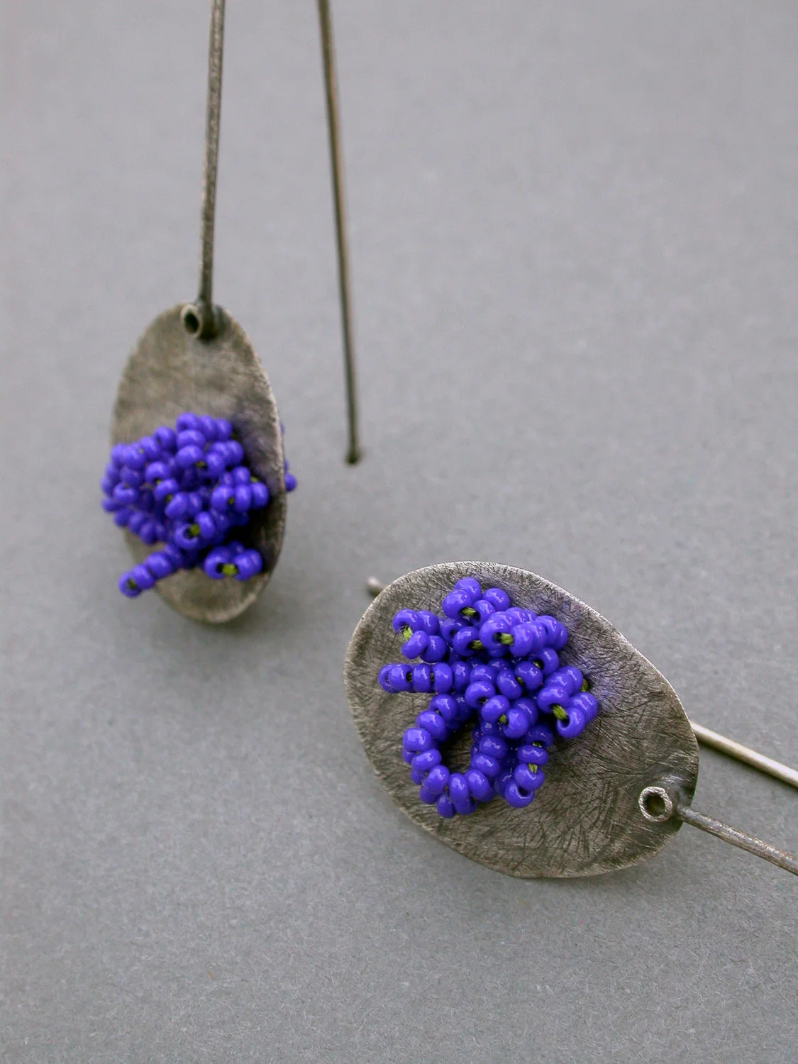 these cobalt grow.paddle earrings are all hand fabricated by me in my studio in austin, tx. they are made of sterling wire and sheet metal that is manipulated, soldered, sanded, oxidized & sanded again to bring back some of the sterling to the surface and finally sewn with wee 15/0 little seed beads.
