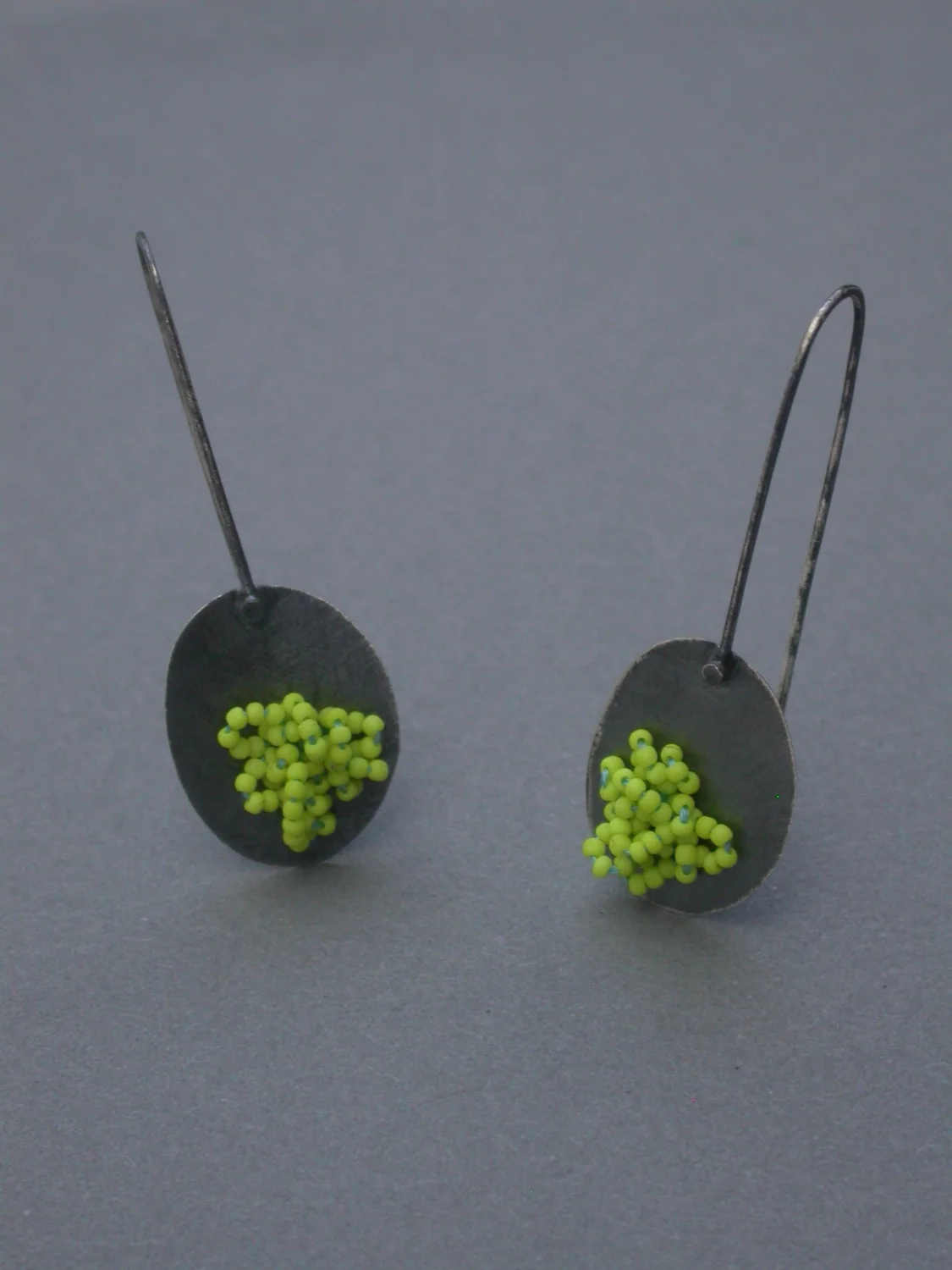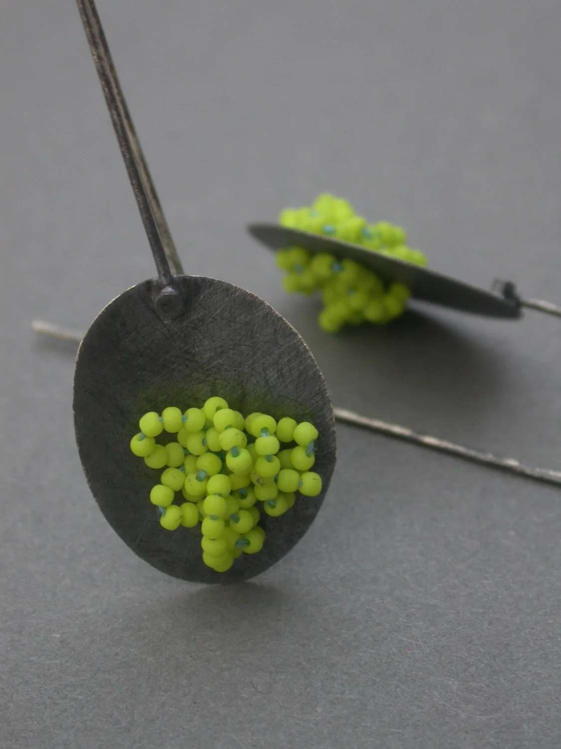 the lemon lime grow.paddle earrings are a new design i created using tiny glass seed beads, thread and oxidized sterling silver. these sweet, yet sleek earrings will add a little sass and modern style to any outfit. the lemon lime color reminds me of sprinkles on a cake. i am thrilled with this new design. the sewn seed beads remind me of colonies of things that grow: algea, sea anenome.