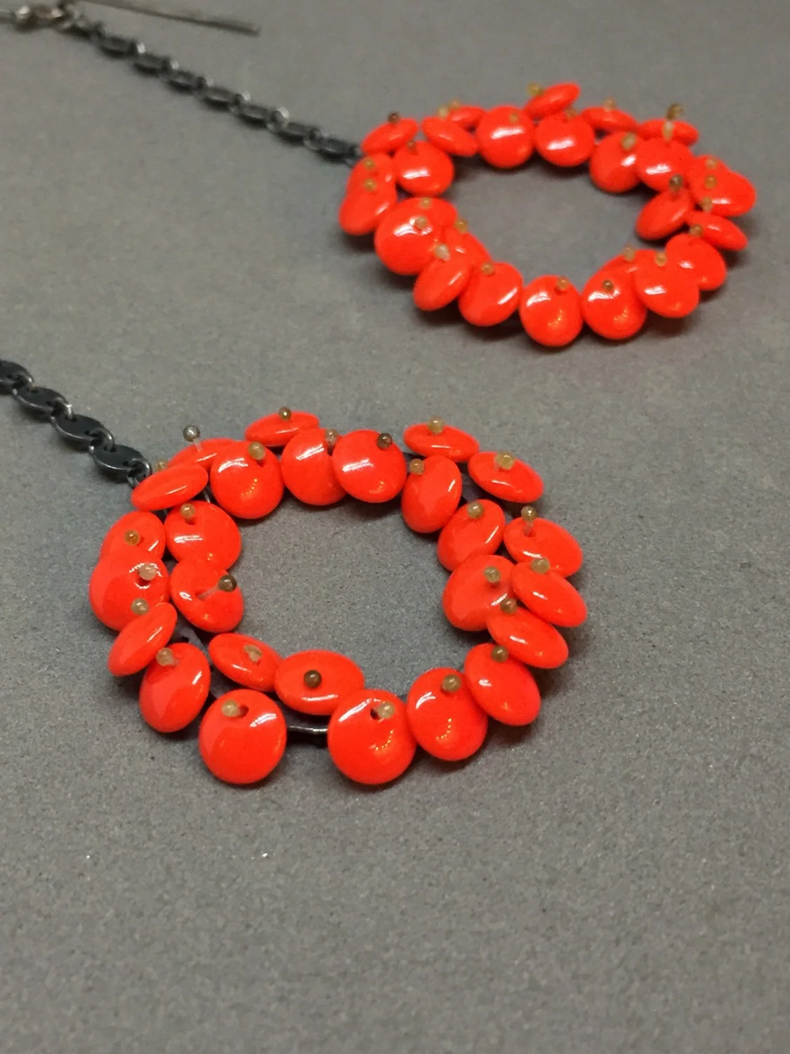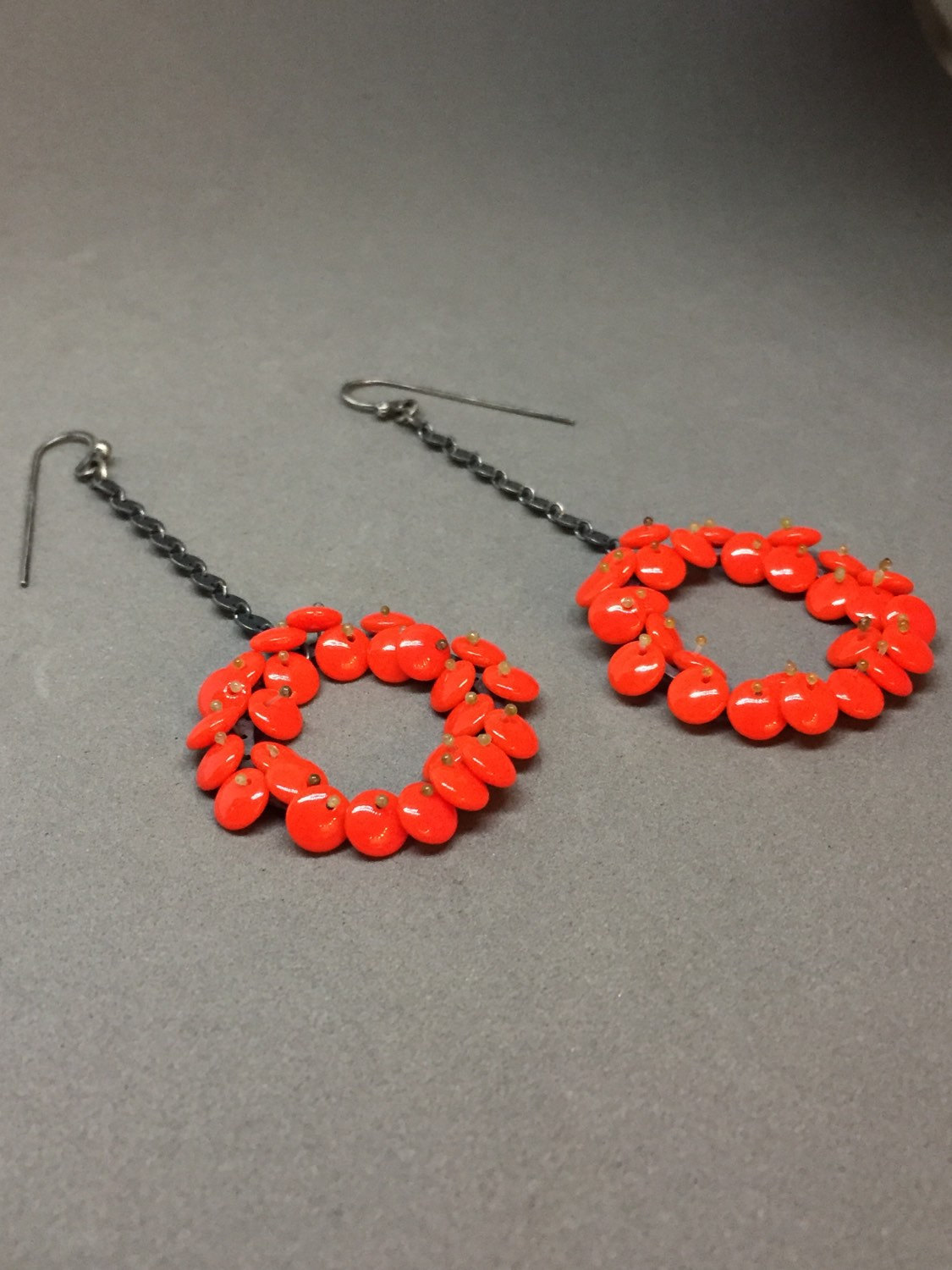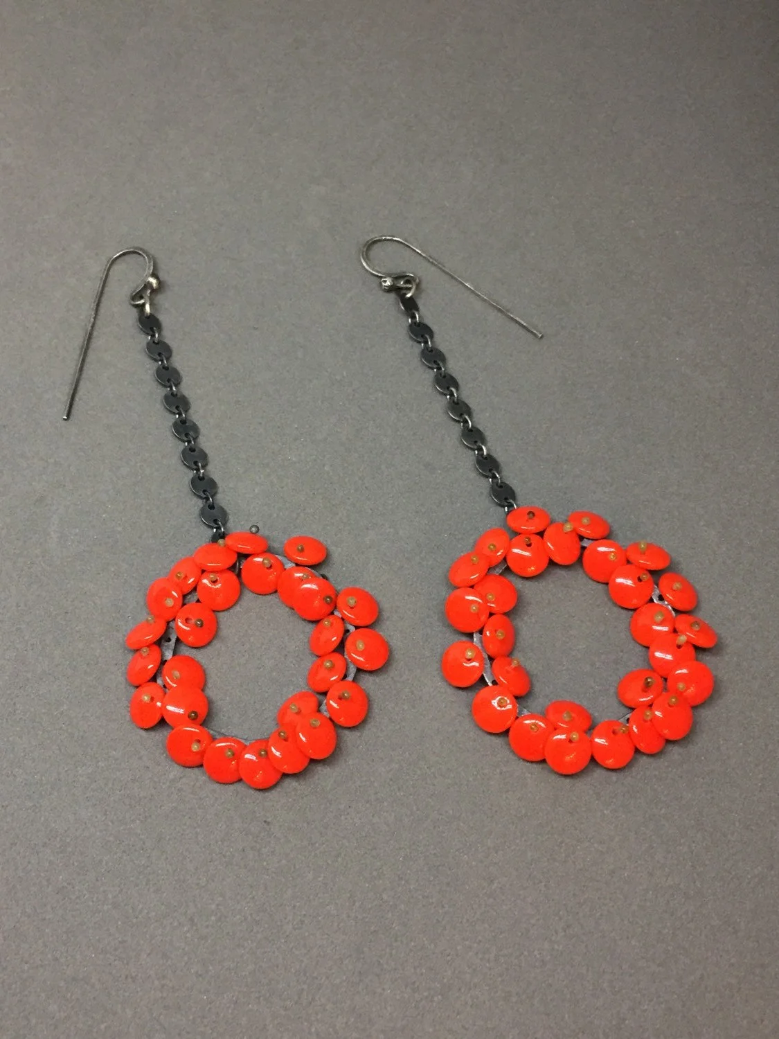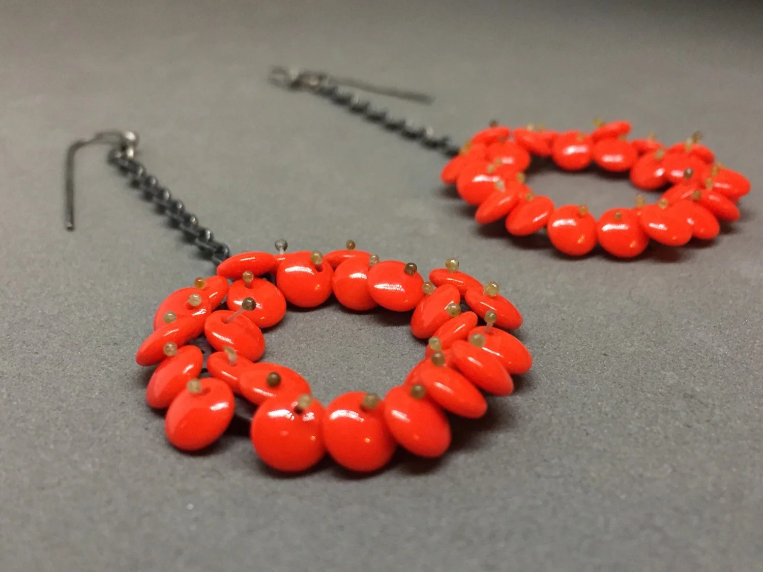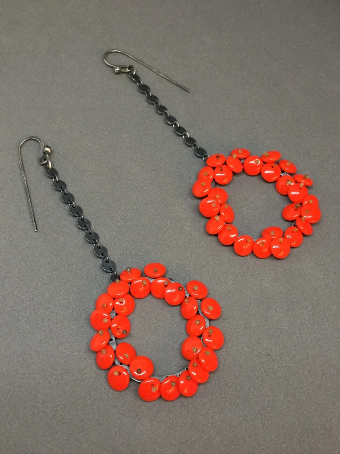 long bloom drop earrings in bright lipstick red. the lentil beads are free moving and wiggle a bit giving them a nice kinetic, life-like quality, and are held in place with monofilament. these are finished in oxidized sterling silver.