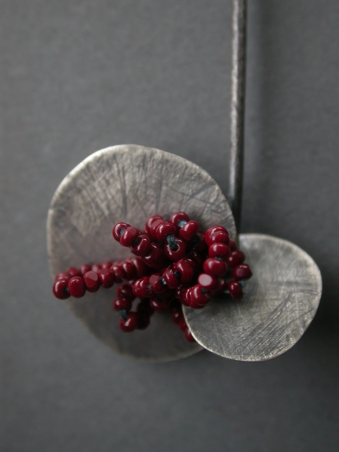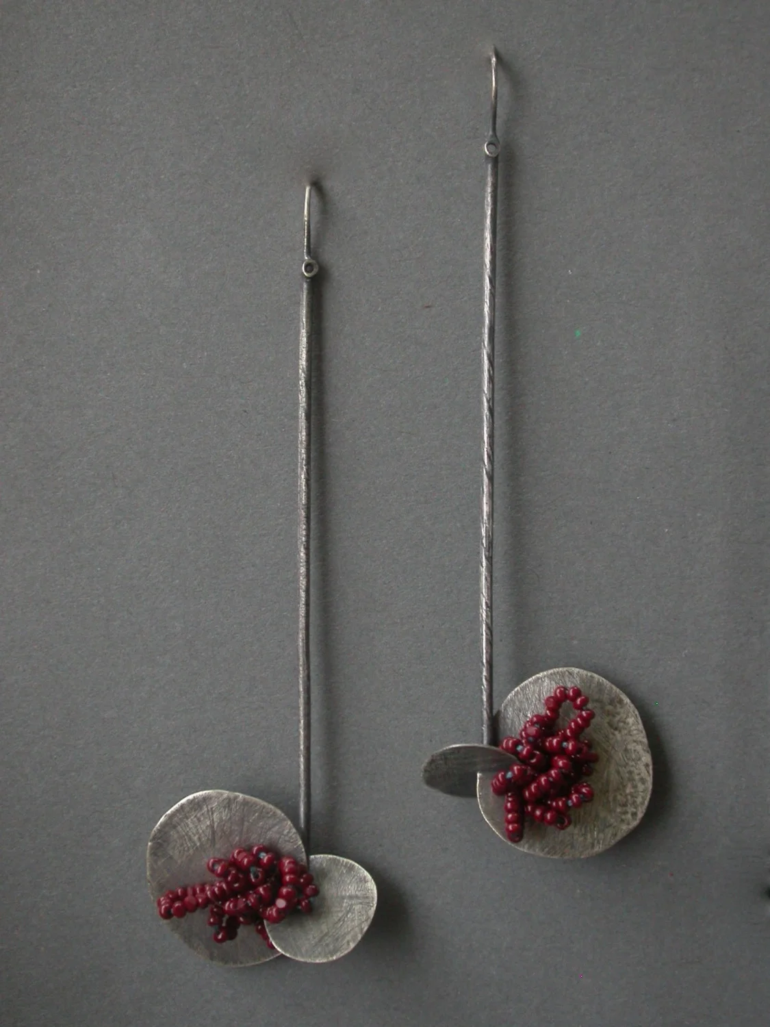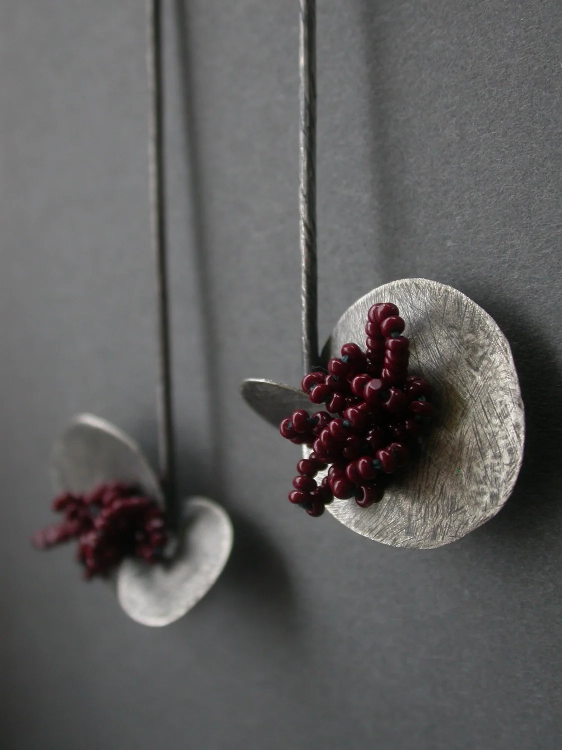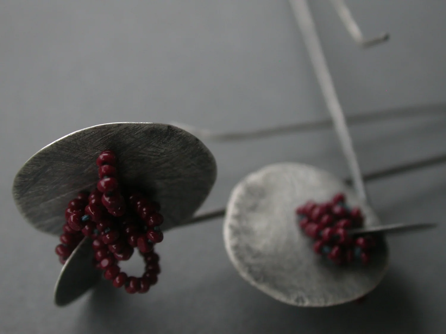 these plum cocoa earrings are all hand fabricated by me in my studio in austin, tx. they are made of sterling wire and sheet metal that is manipulated, soldered, sanded, oxidized & sanded again to bring back some of the sterling to the surface and finally sewn with wee 15/0 little seed beads.