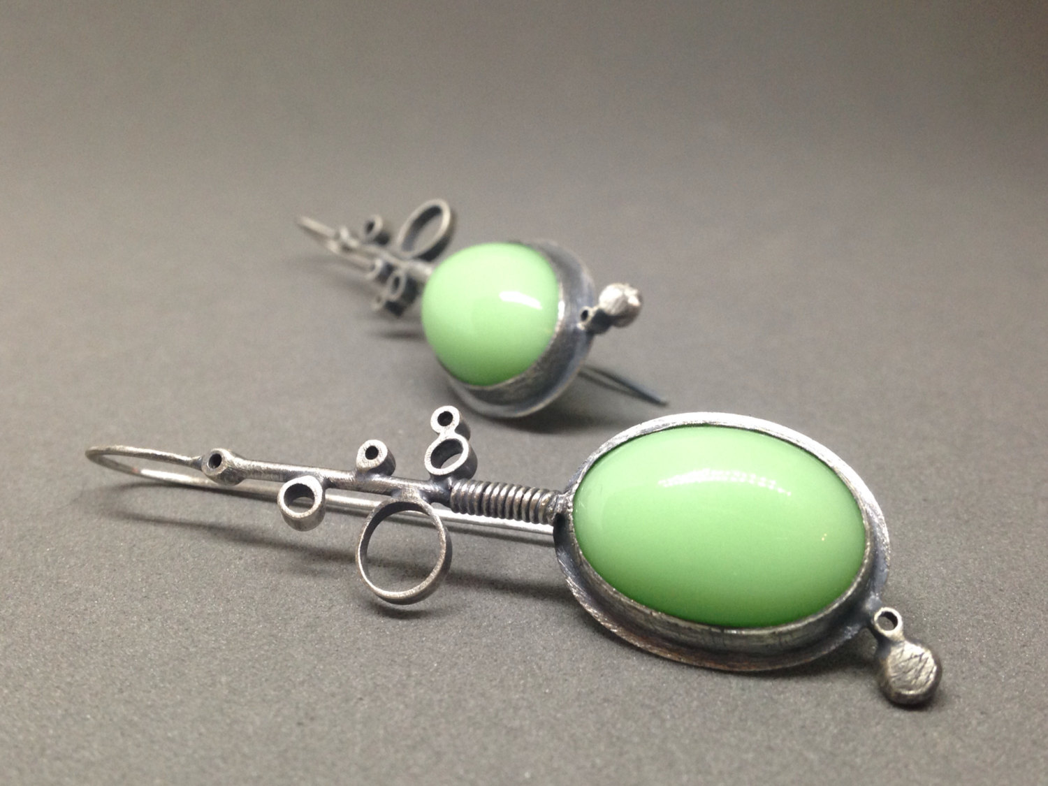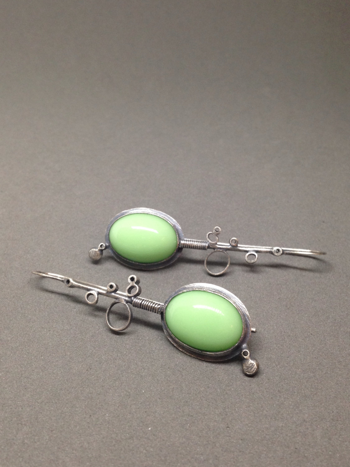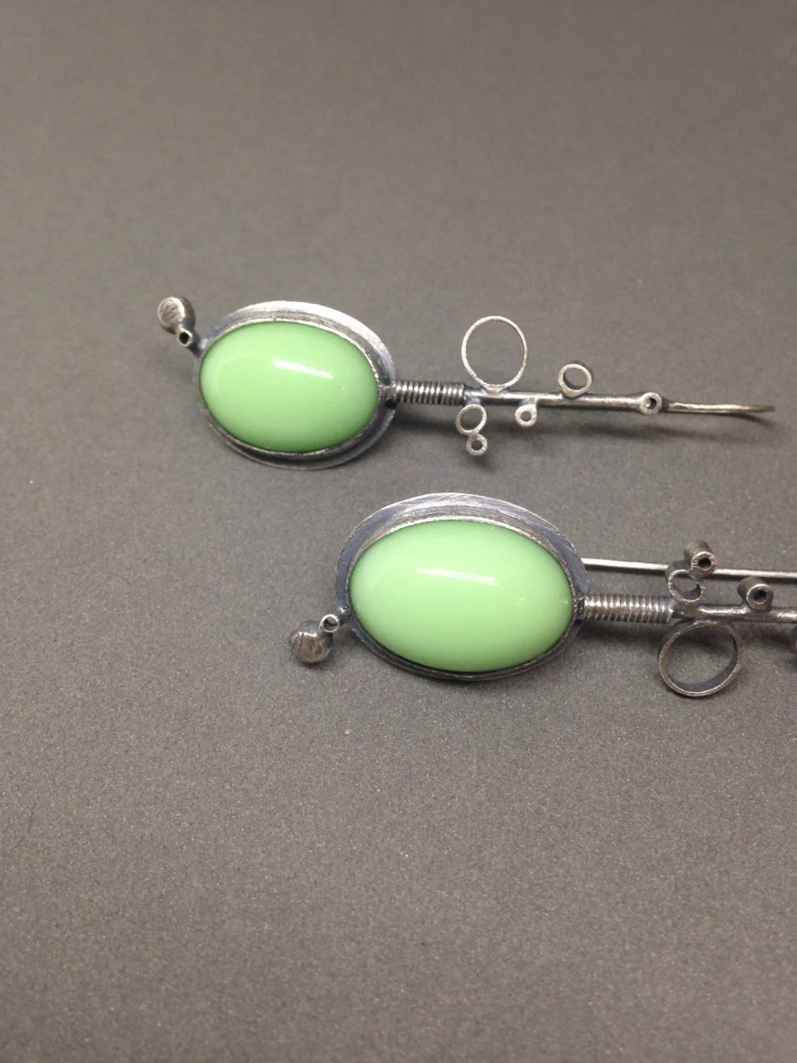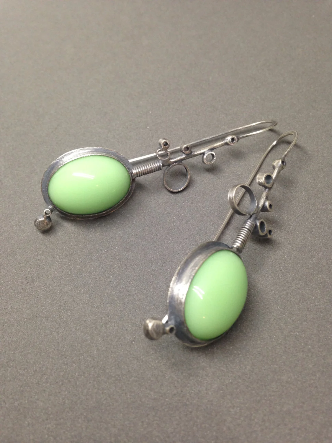 these mint drop bubble dangle earrings are made with oxidized sterling silver and a delicious pistachio green colored vintage glass. these earrings will add flare and pizazz to any outfit. wear these to dress up your unique and funky style. make a statement!!