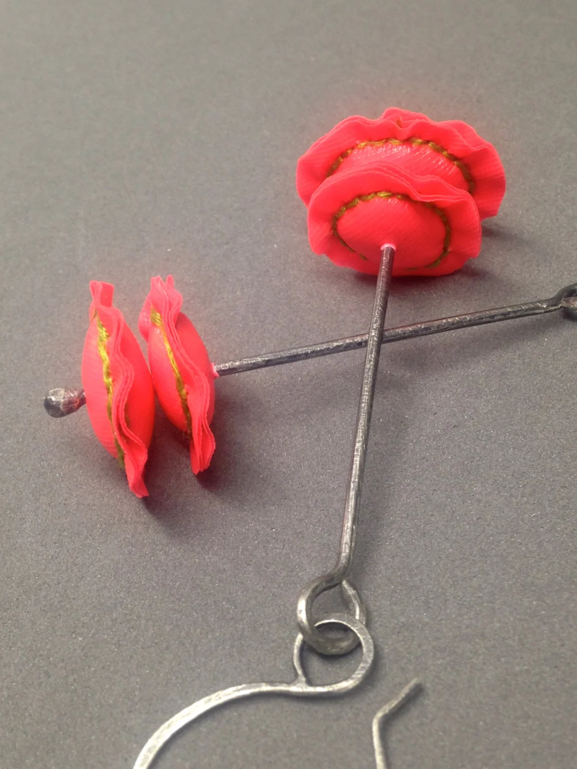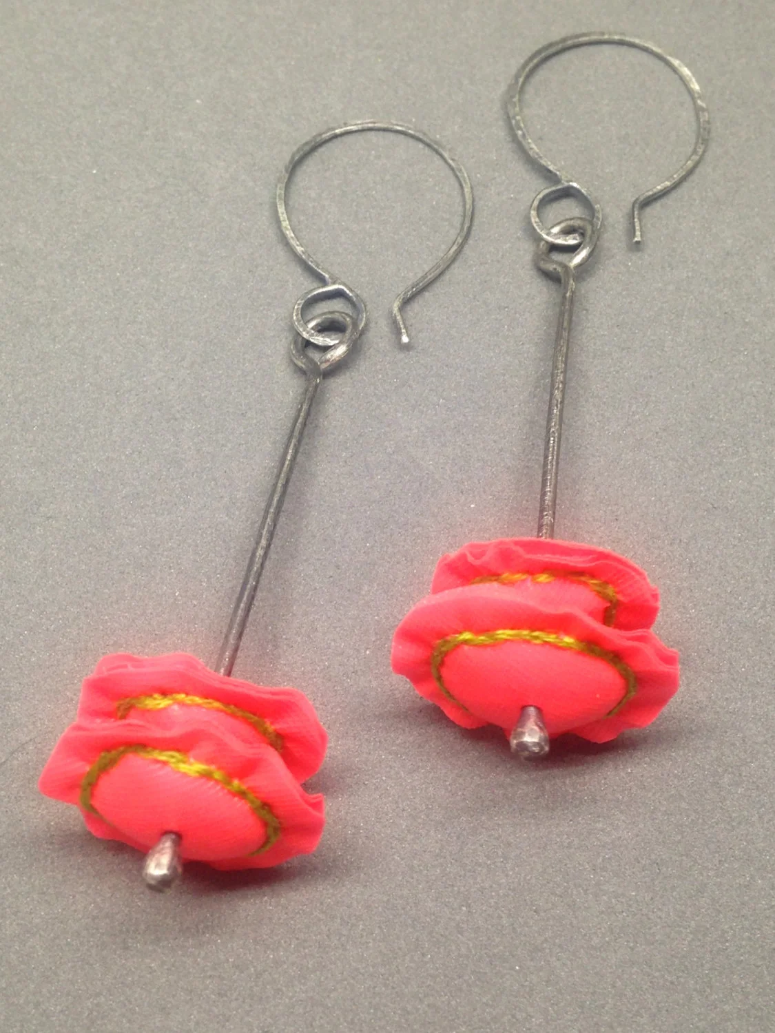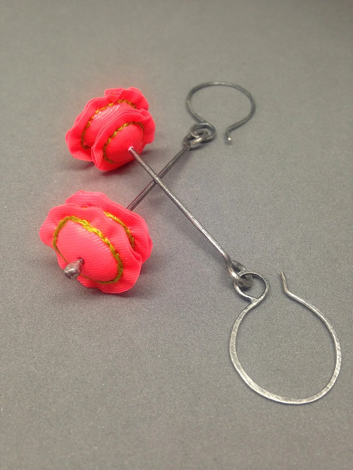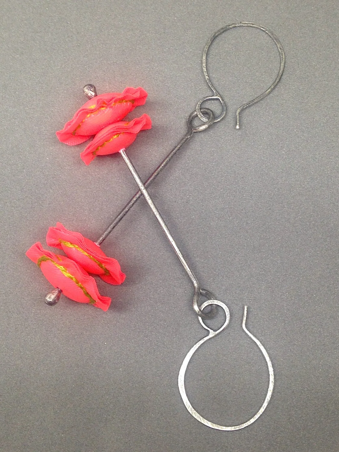 neon strawberry fruit punch neon pink orange dayglo sewn dangle earrings oxidized sterling sculptural art jewelry jaime jo fisher