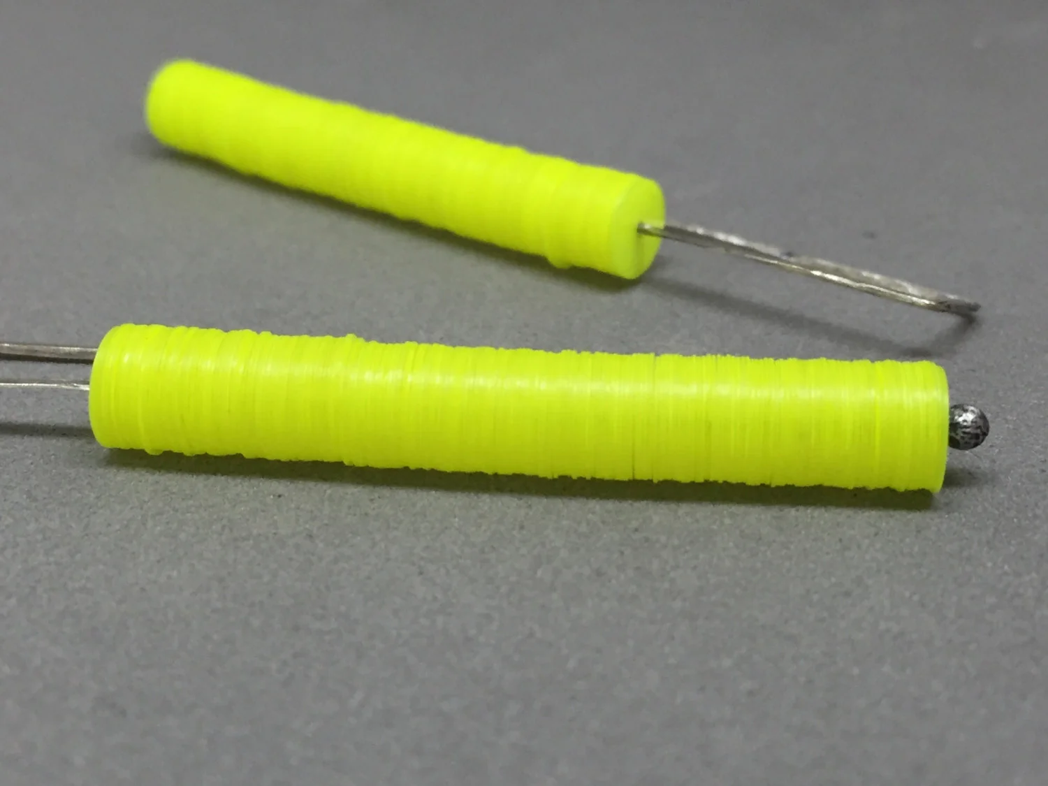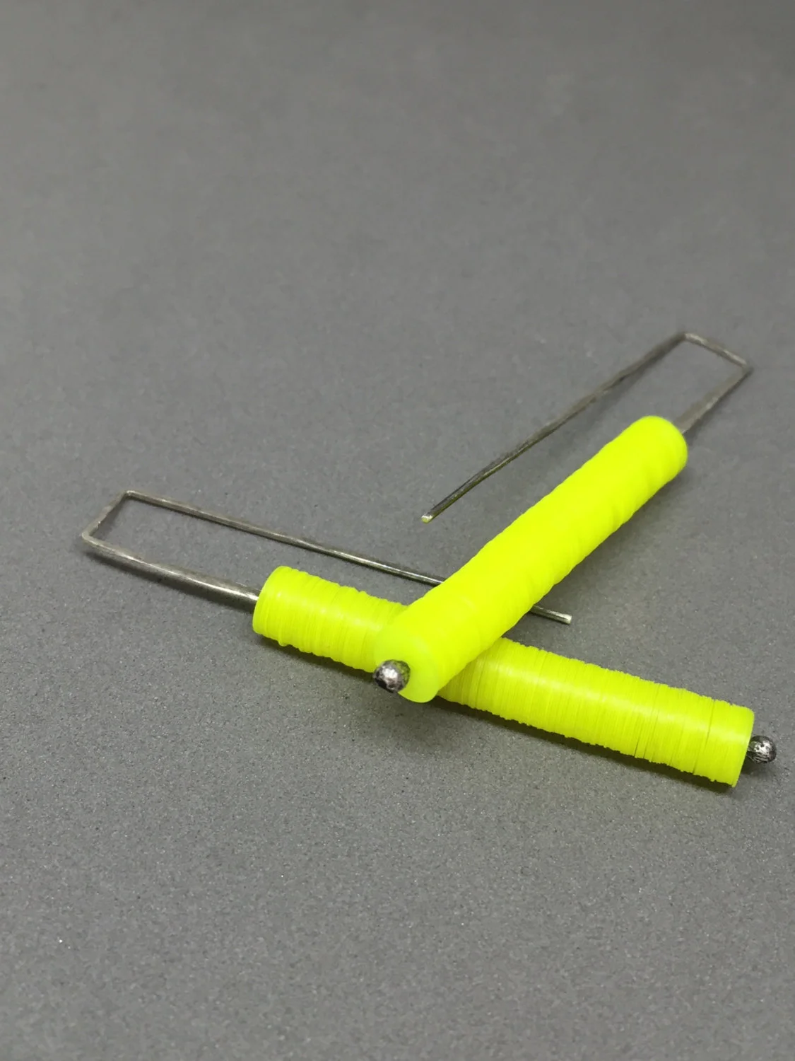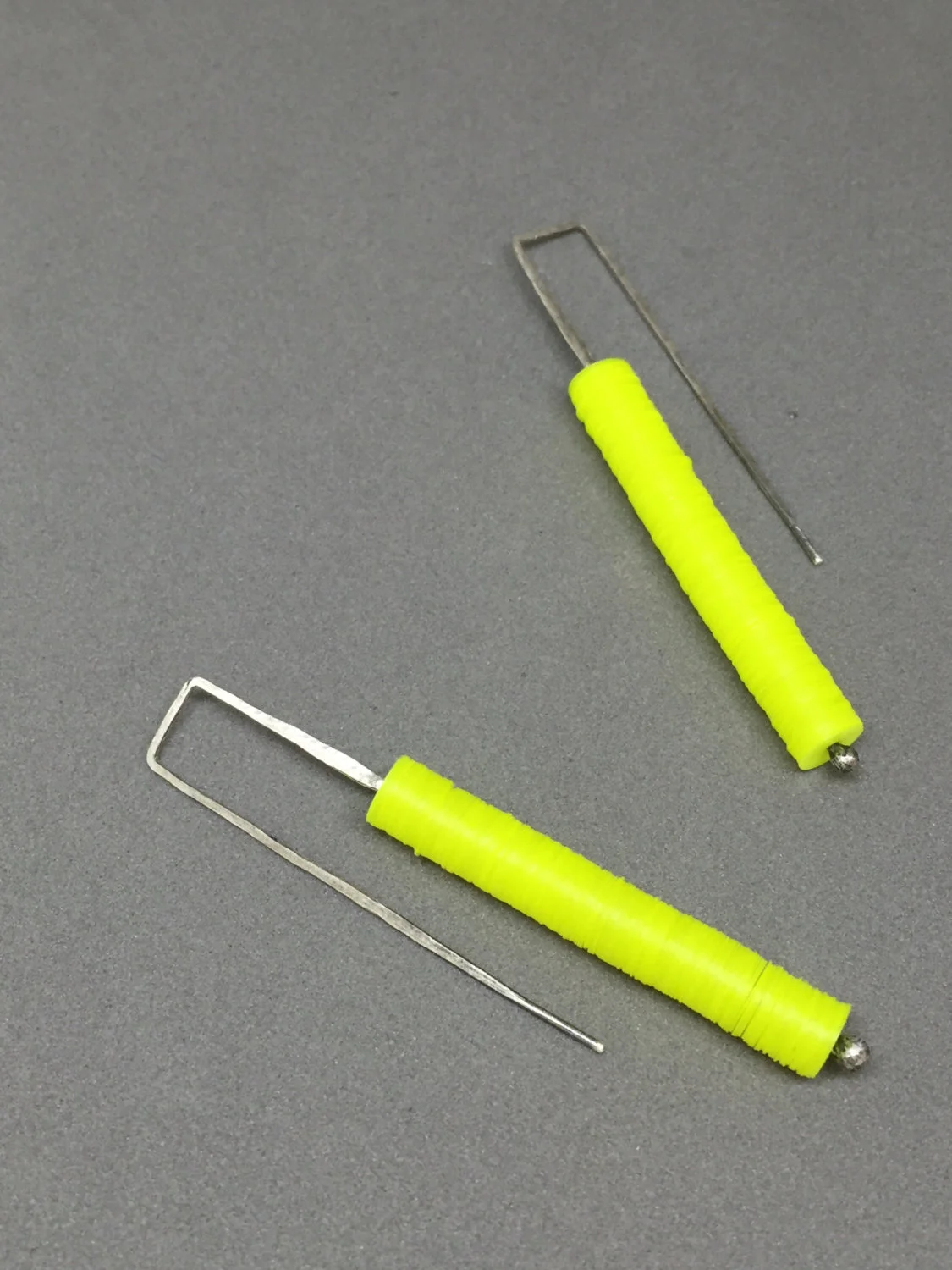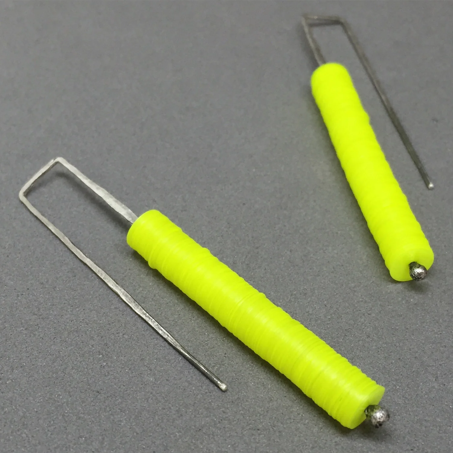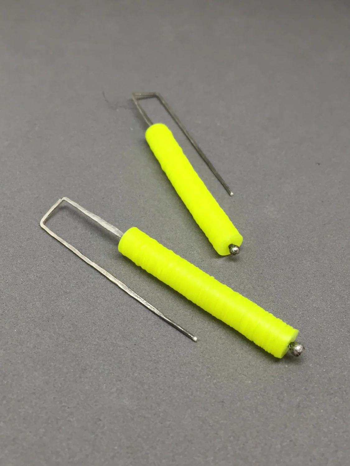 the "neon yellow candy stick earrings" are all hand fabricated by me in my studio in austin, tx. they are made of sterling wire that is heated, melted, manipulated, sanded, hammered, oxidized & sanded again to bring back some of the sterling to the surface.
