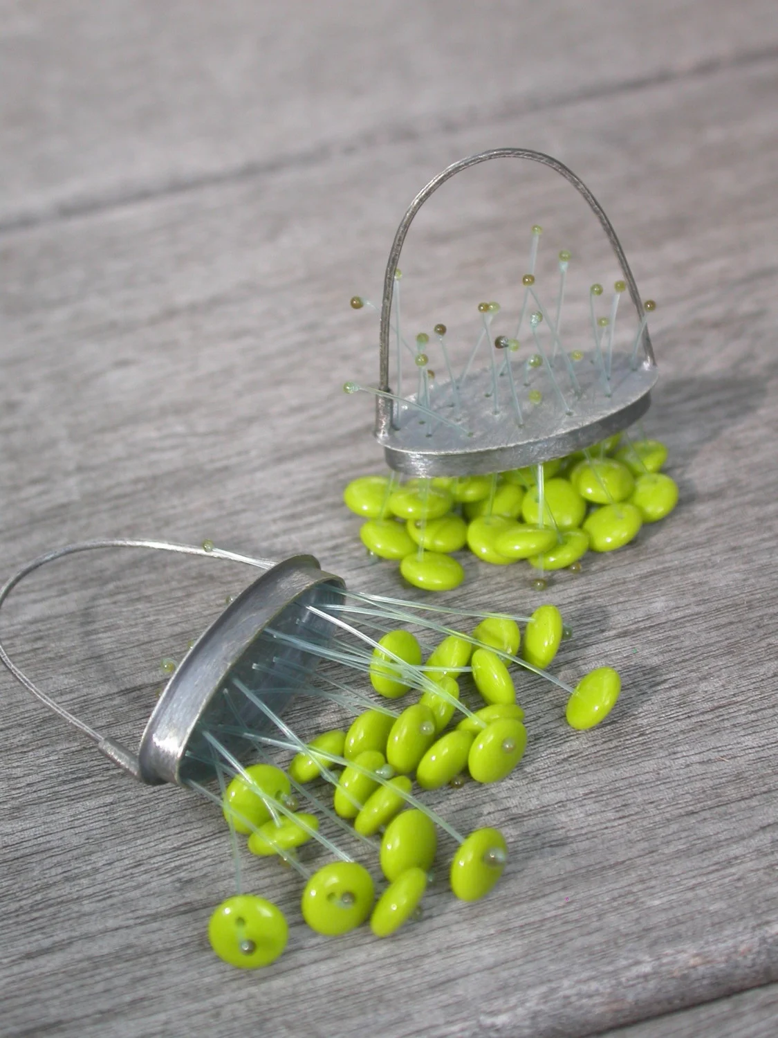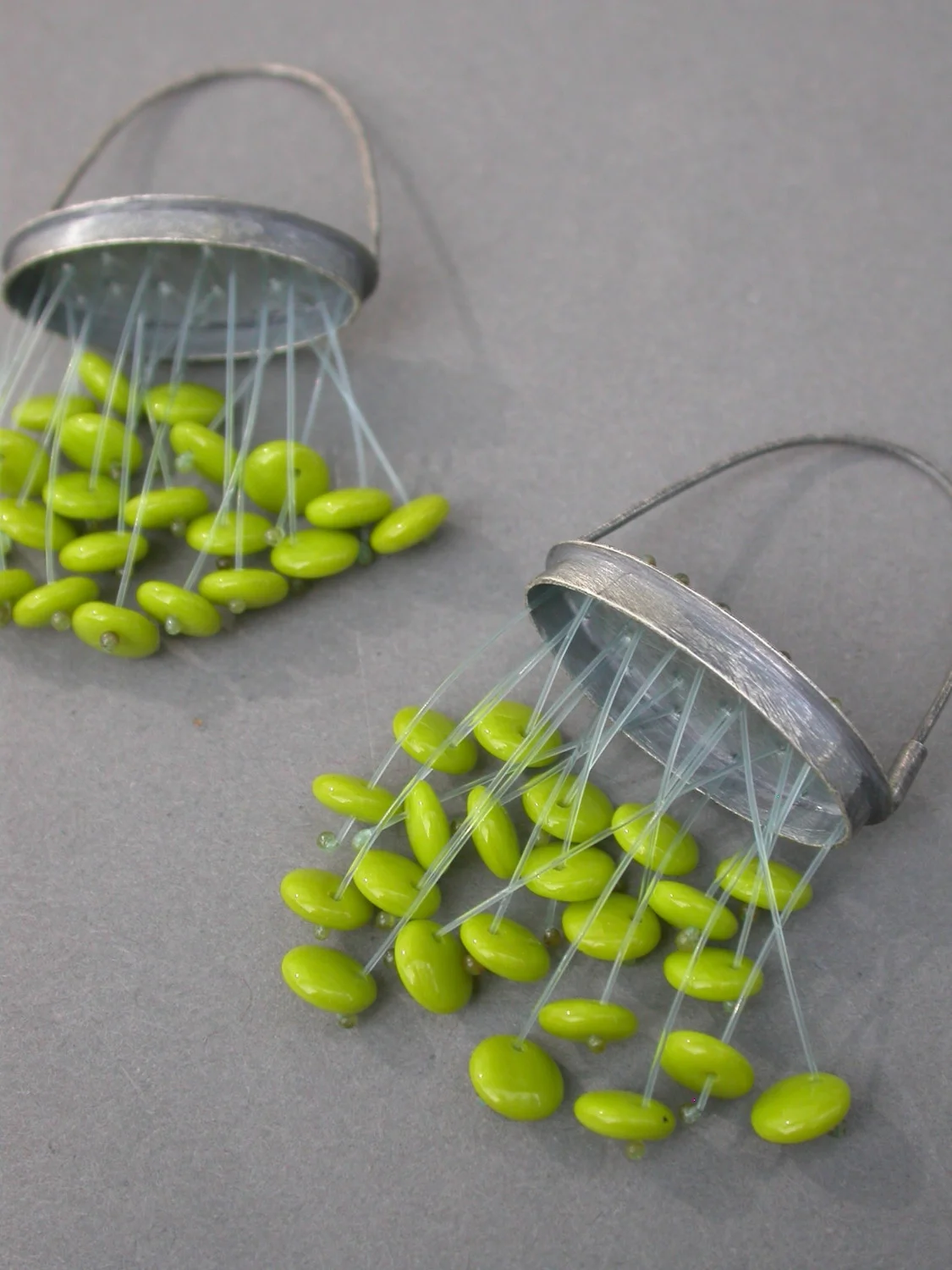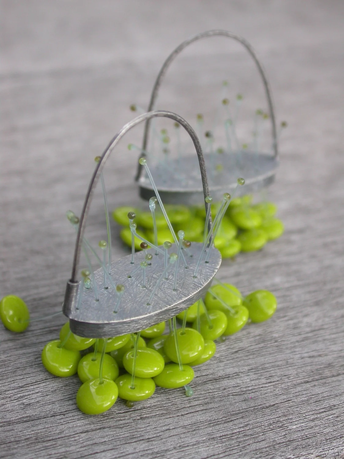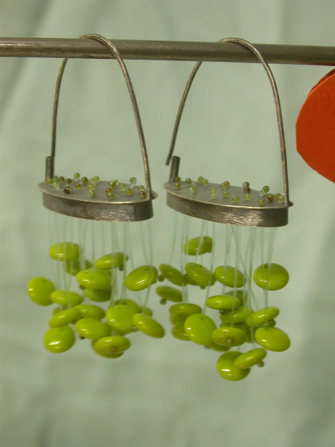 the "ovoid acid green polyp earrings" are made with oxidized sterling silver, glass beads and filament. the glass beads are acid green in color. the polyp earrings are a take on the idea of wearable and modern version of a chandelier. the movement of these while wearing is such a beautiful thing. the truly special functional aspect of these earrings is the catch for the earwire. the earwire ends just where it should right in down into a small piece of tubing opposite of where the wire begins. the ear wire is work hardened so they can be put on and off by gently moving the wire in and out of the tubing without distorting the shape. these are just right in every way and are one of my favorites.