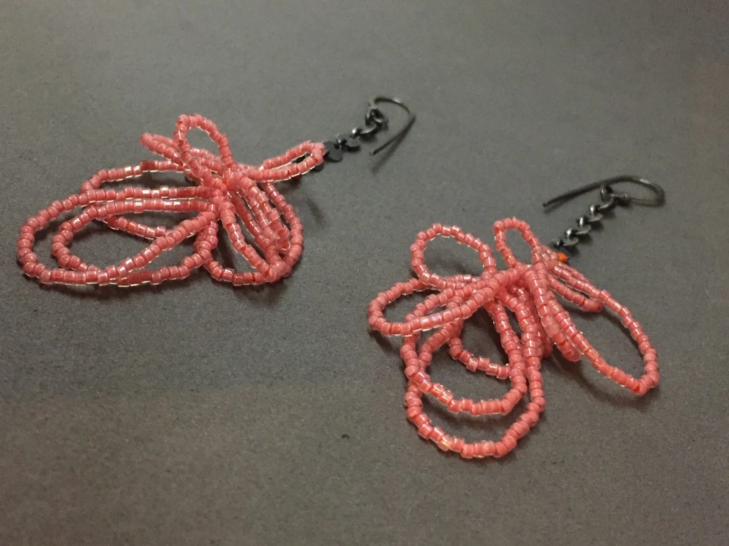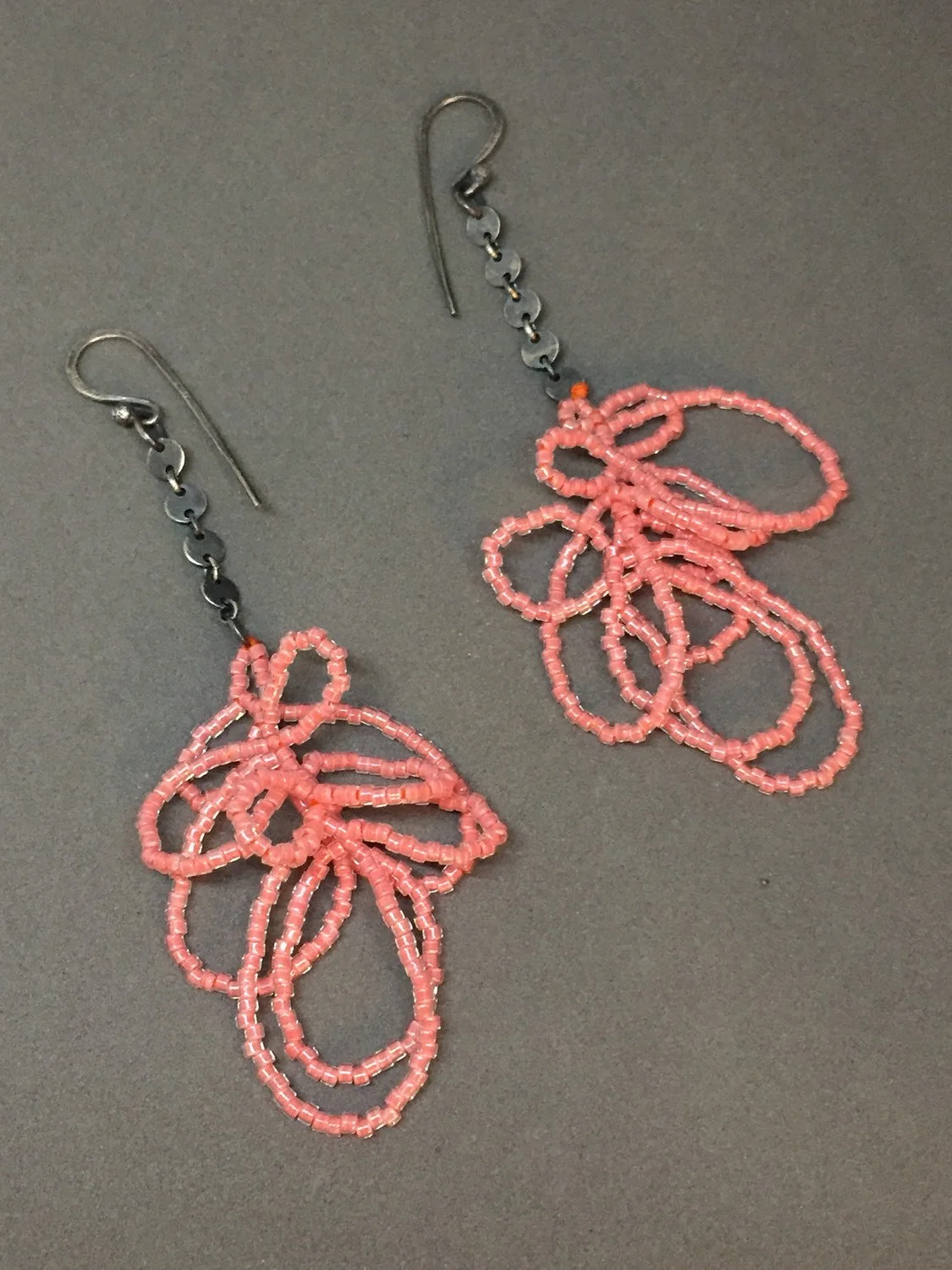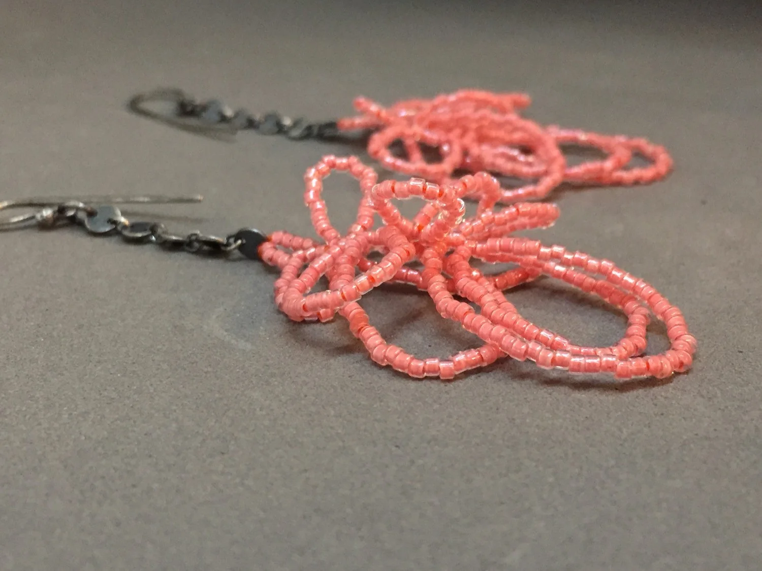 Killer coral flamingo pink "scribble earrings" made of delica seed beads thread and sterling silver.