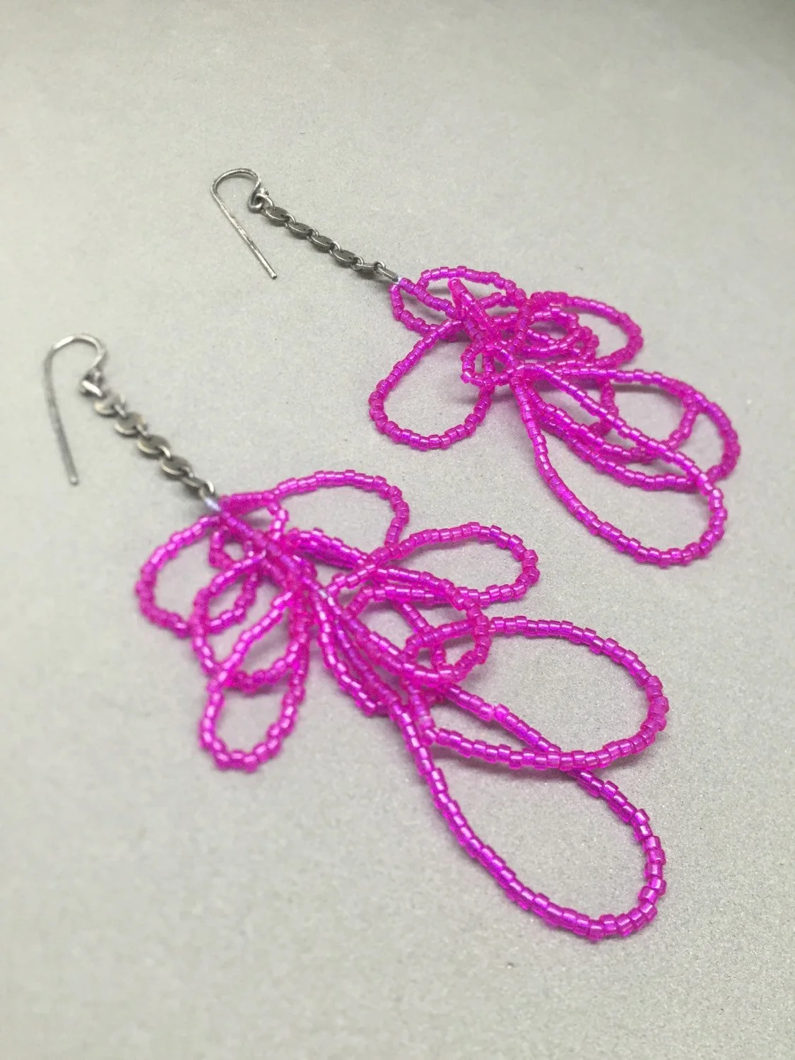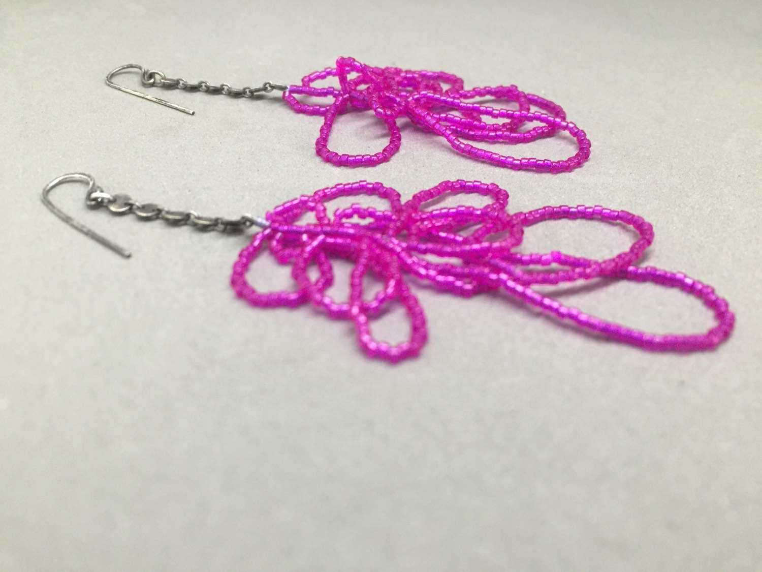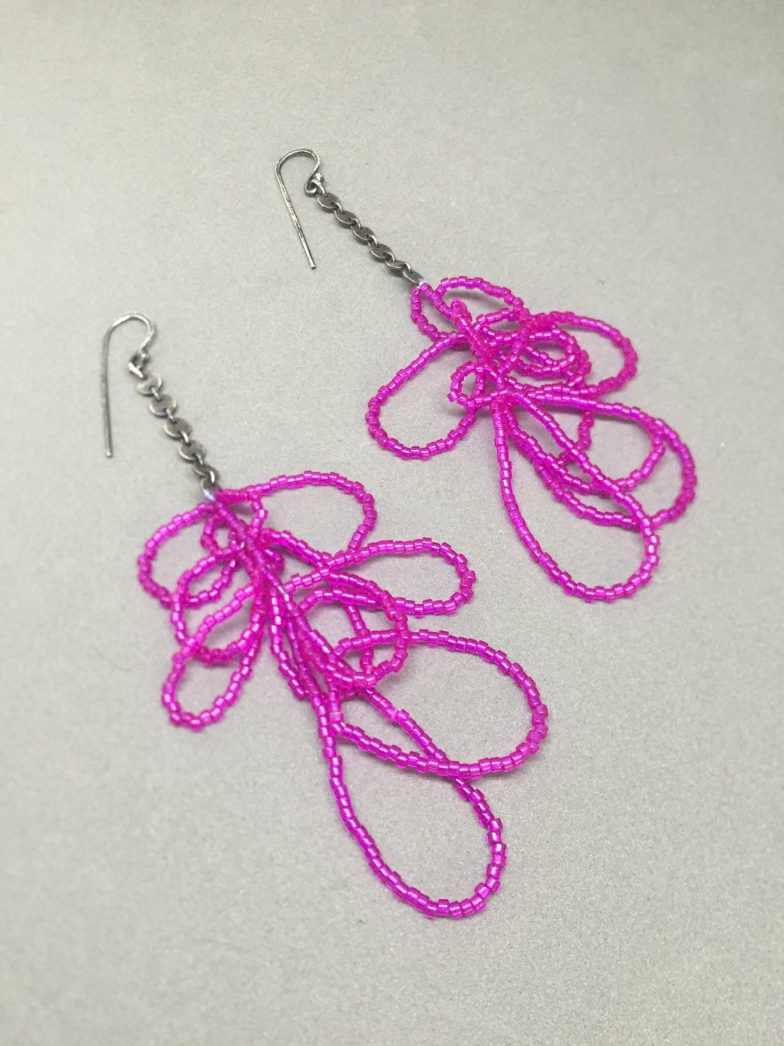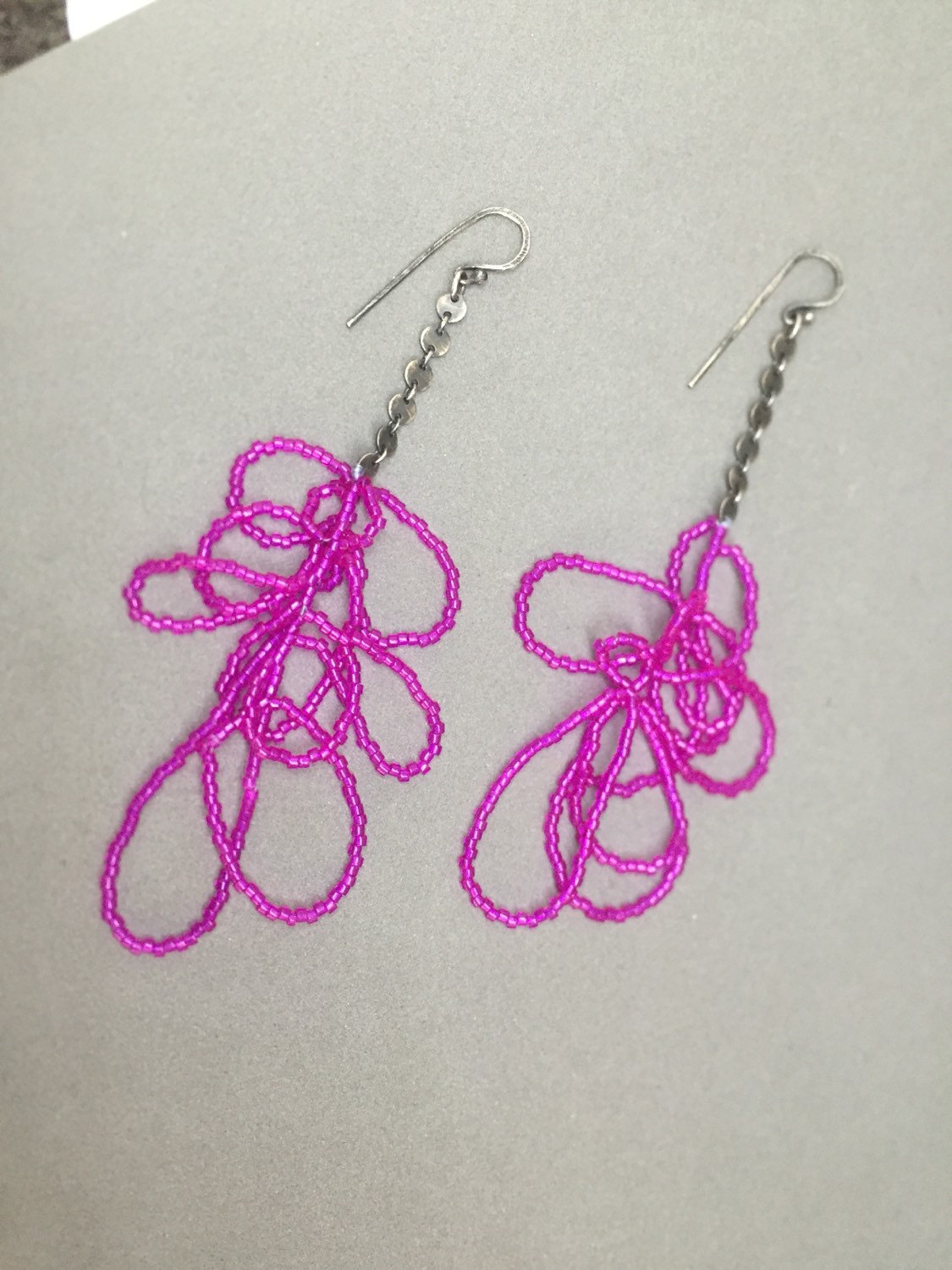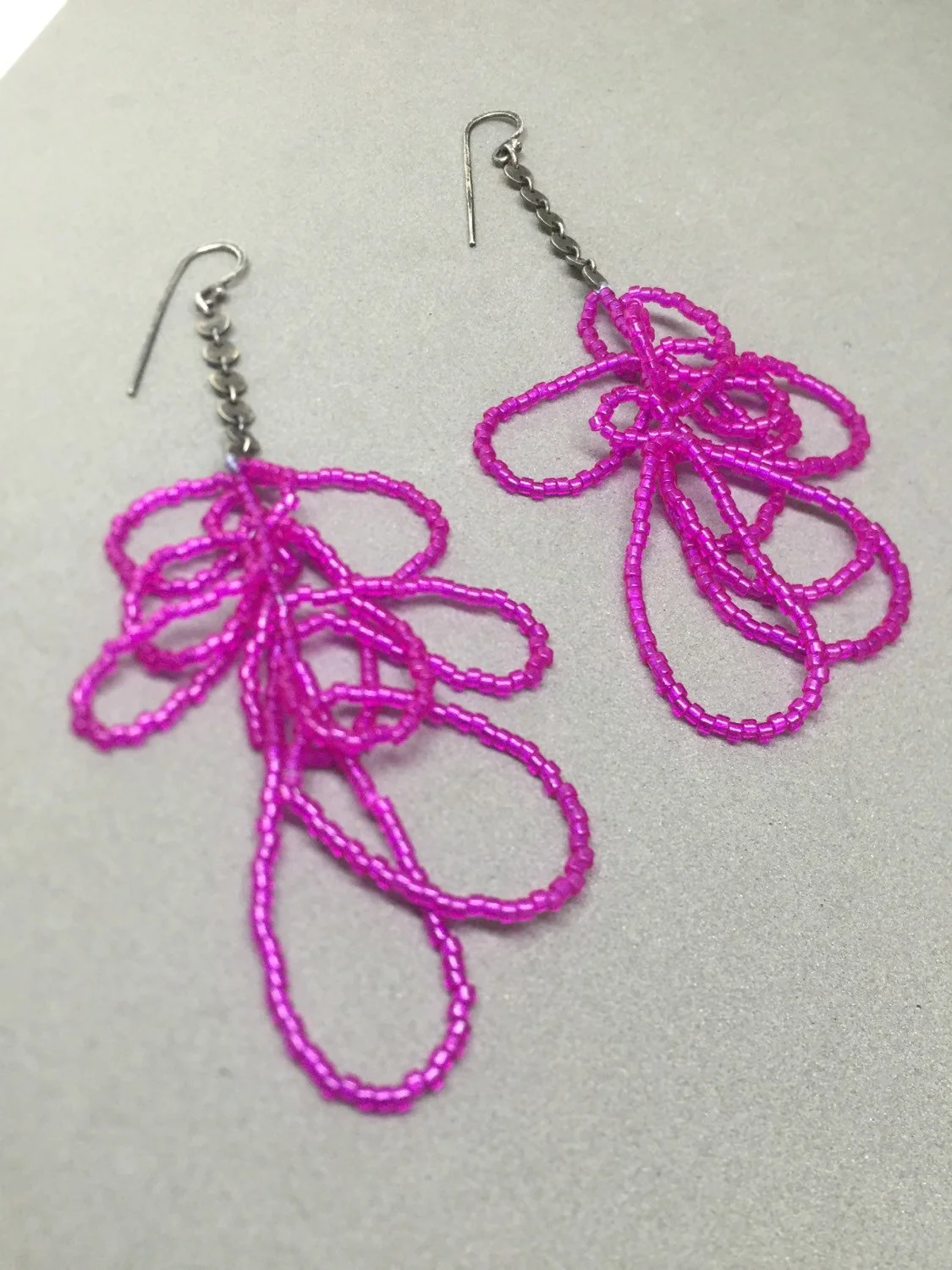 Killer magenta "scribble earrings" made of delica seed beads thread and sterling silver.