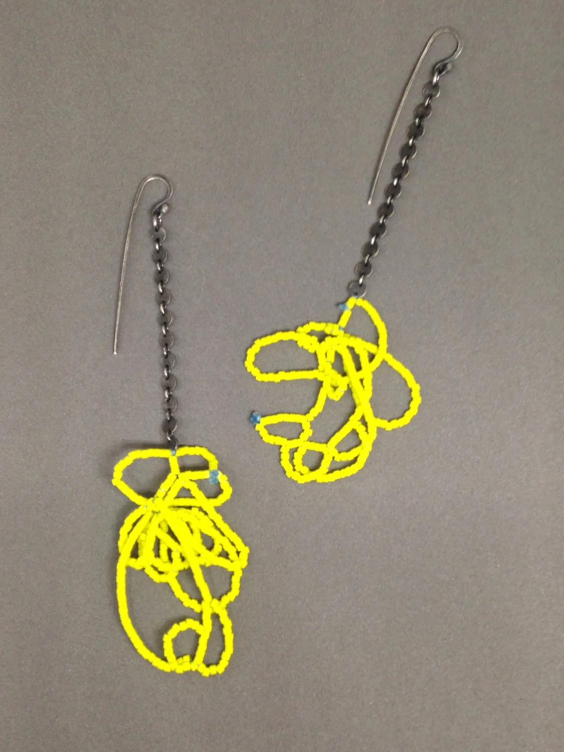 Scribble earrings in neon yellow beaded dangle chandelier earrings oxidized sterling art earrings sculptural art jewelry jaime jo fisher