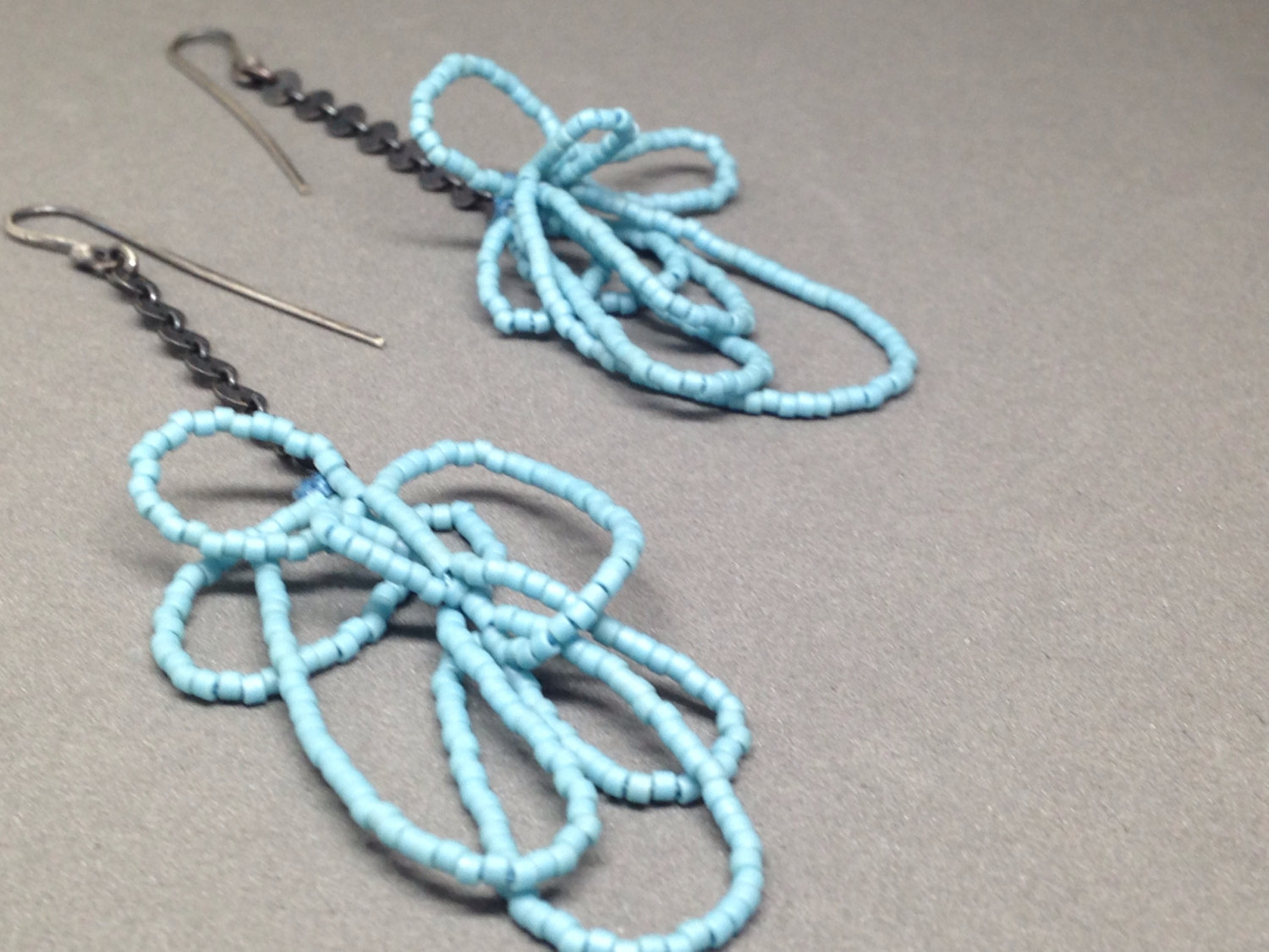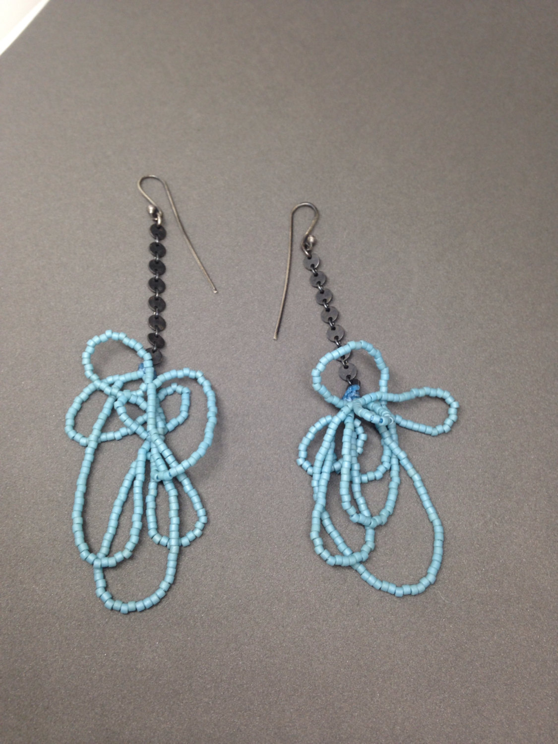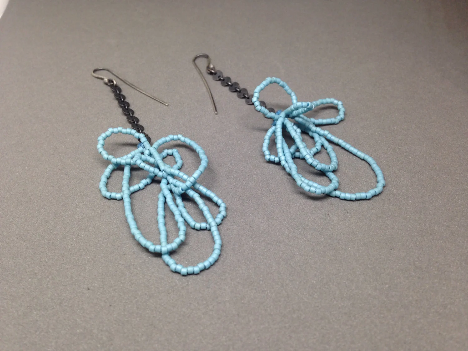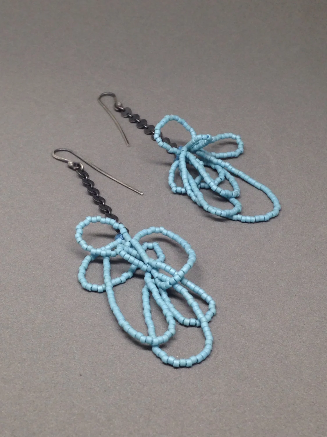 Killer seafoam green "scribble earrings" made of delica seed beads thread and sterling silver.