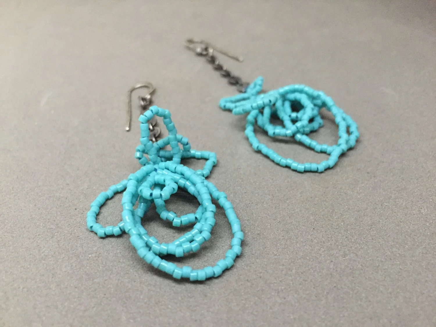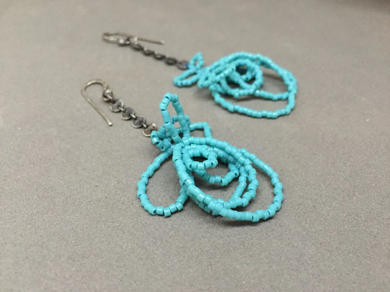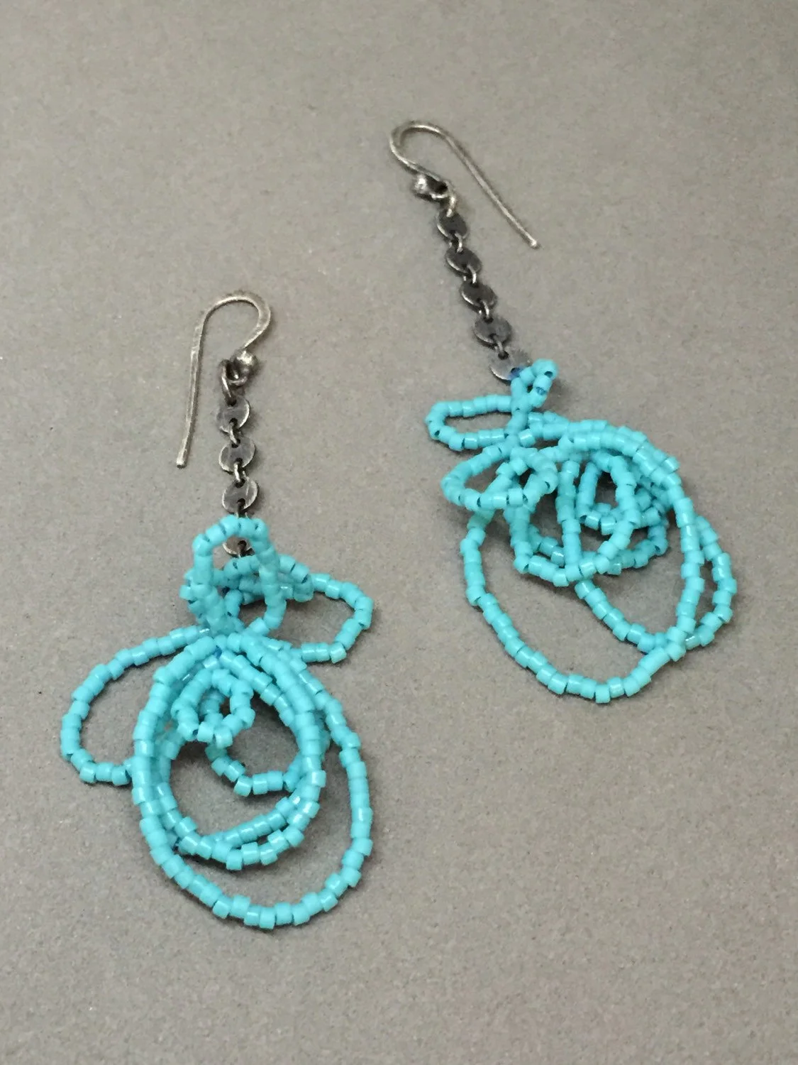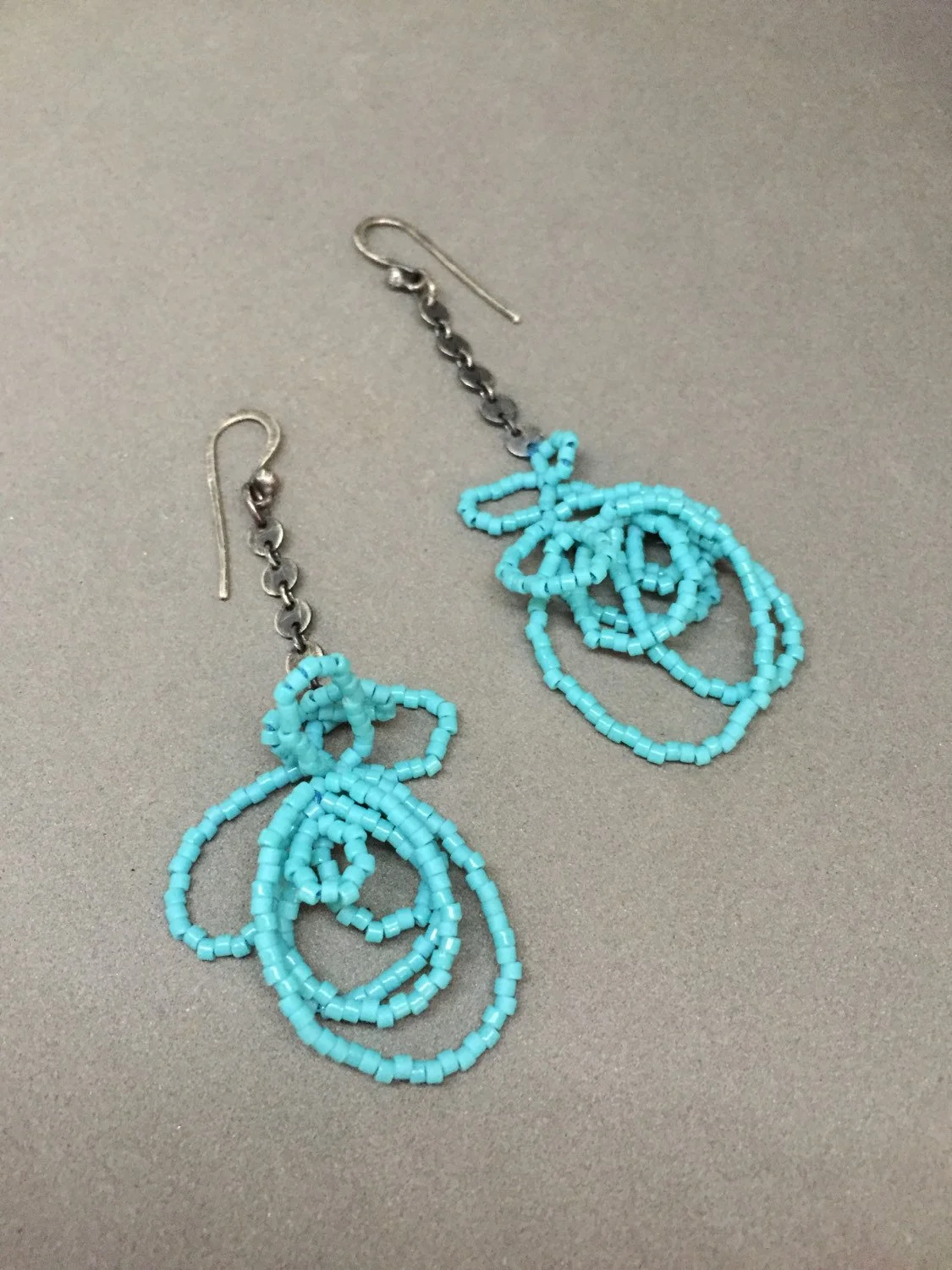 Killer turquoise "scribble earrings" made of delica seed beads, thread and sterling silver.