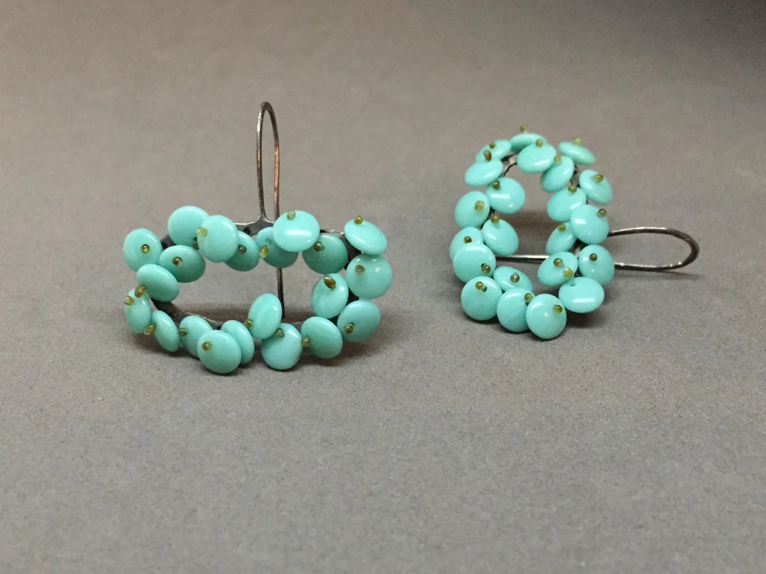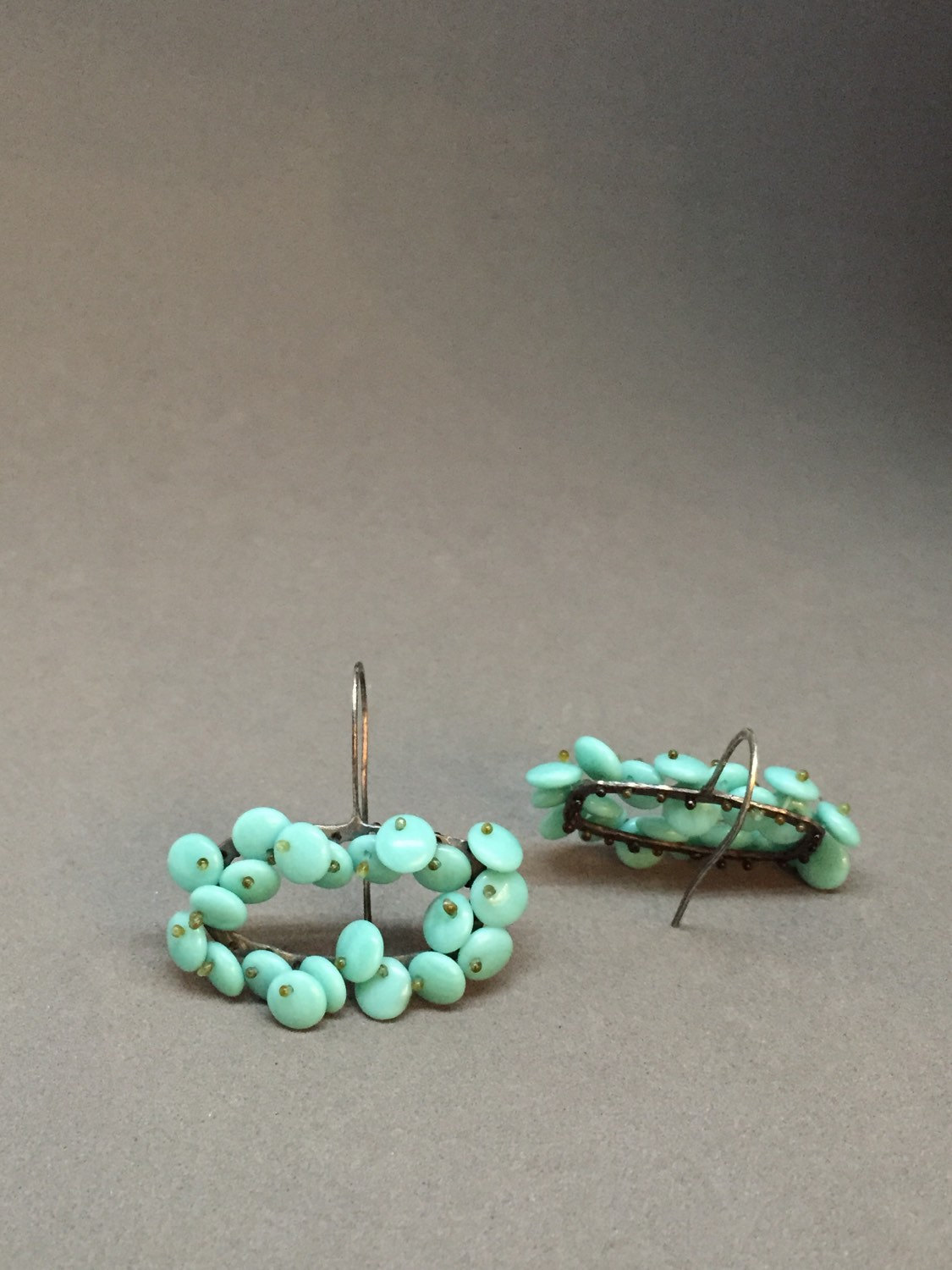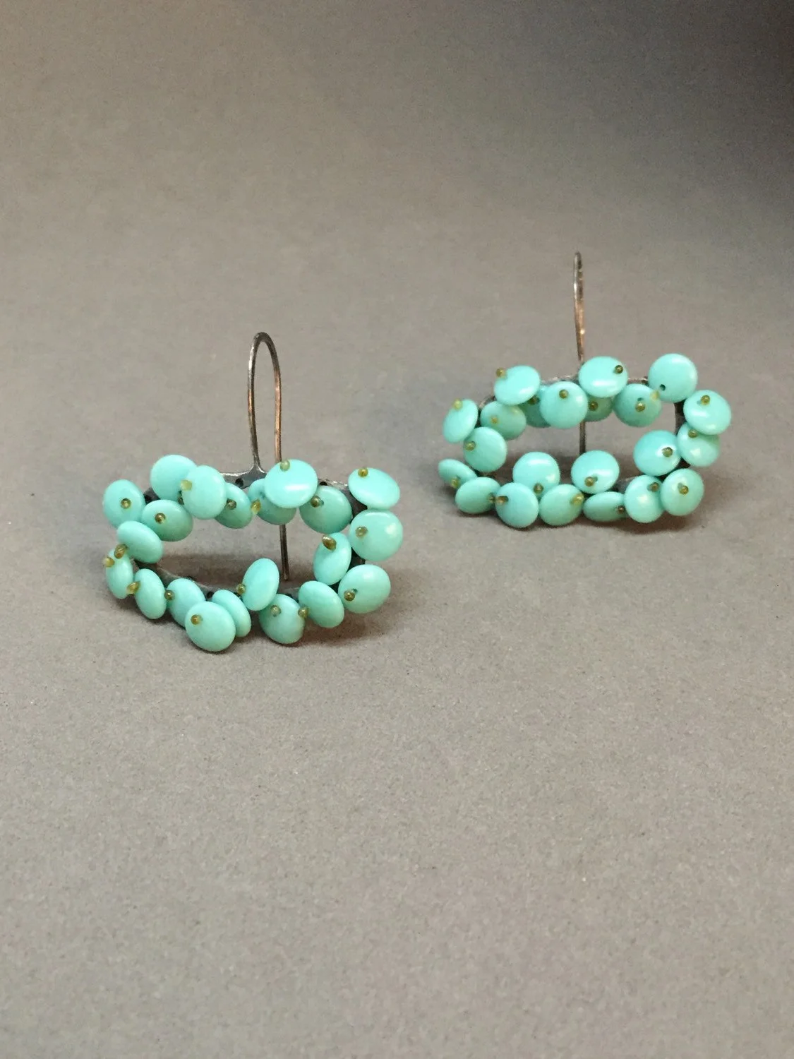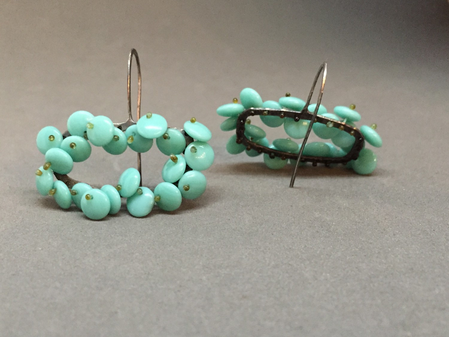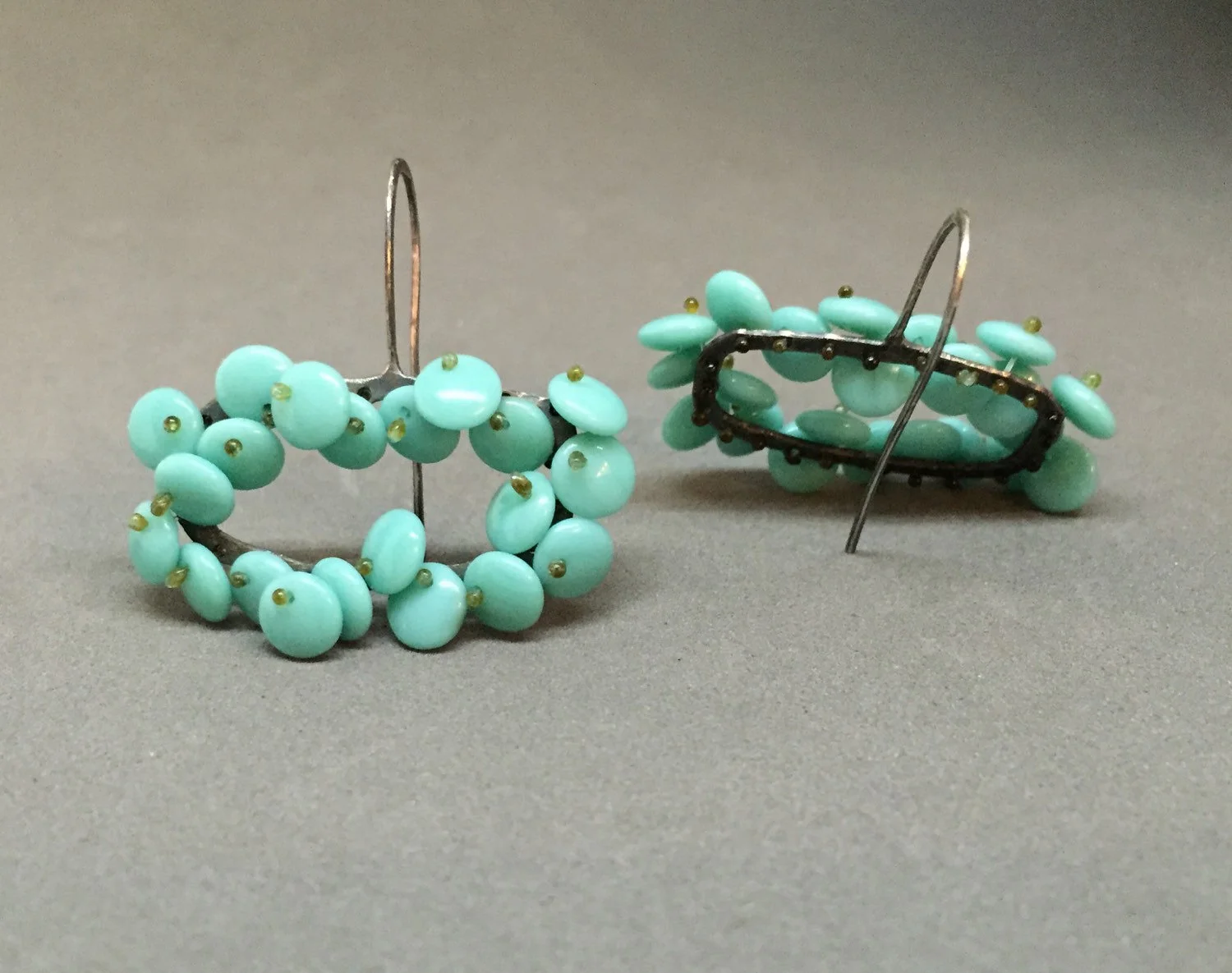 rectangular organic short drop bloom earrings in a luscious aqua turquoise color. the lentil beads are free moving and wiggle a bit giving them a nice kinetic, life-like quality, and are held in place with monofilament. these are finished in oxidized sterling silver.