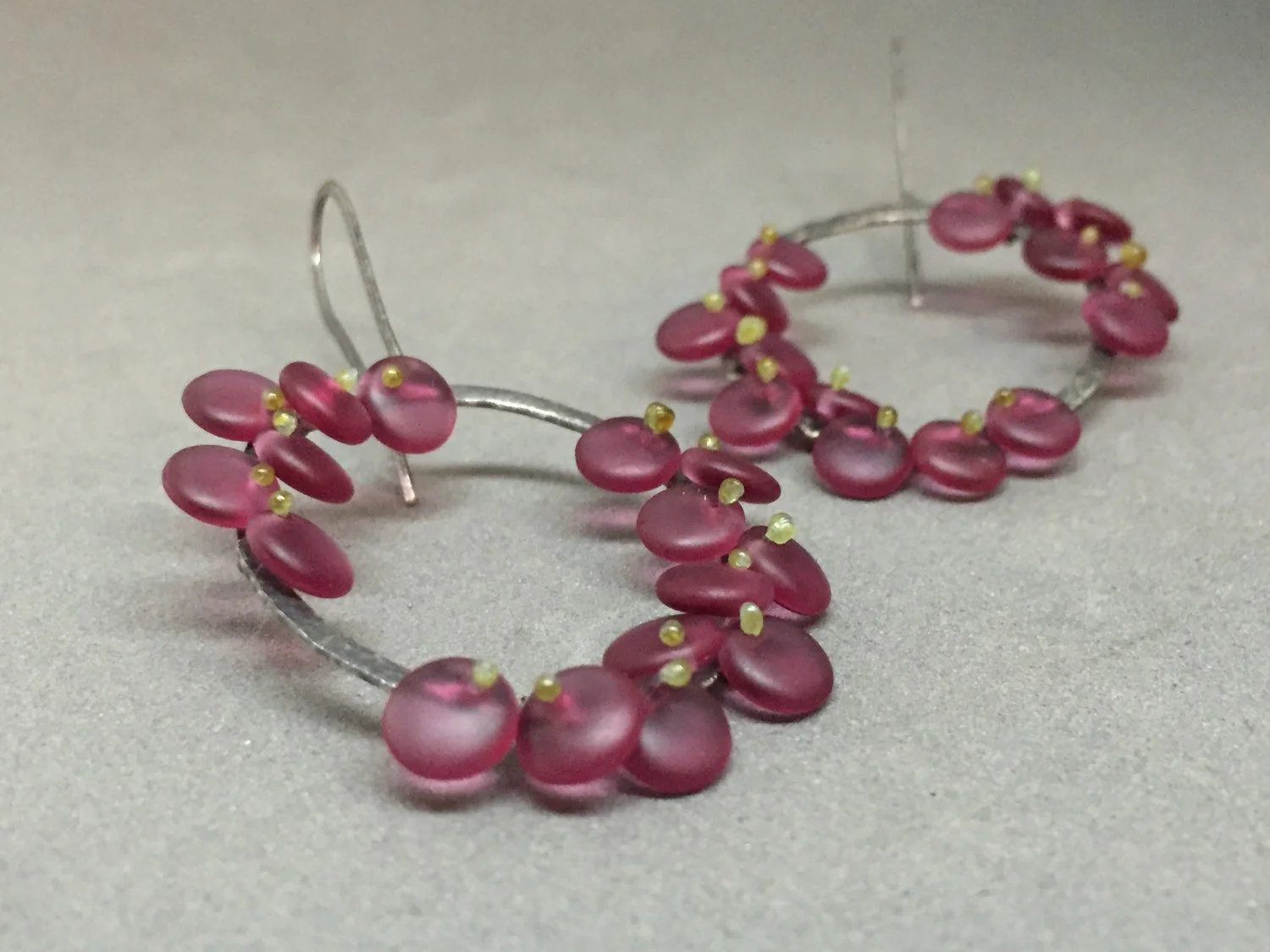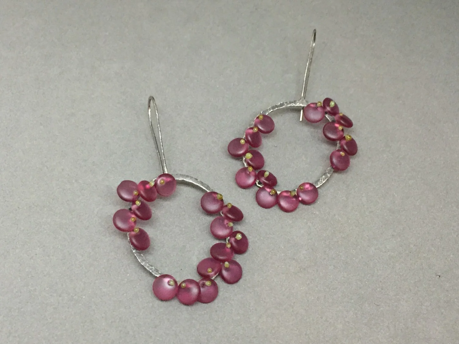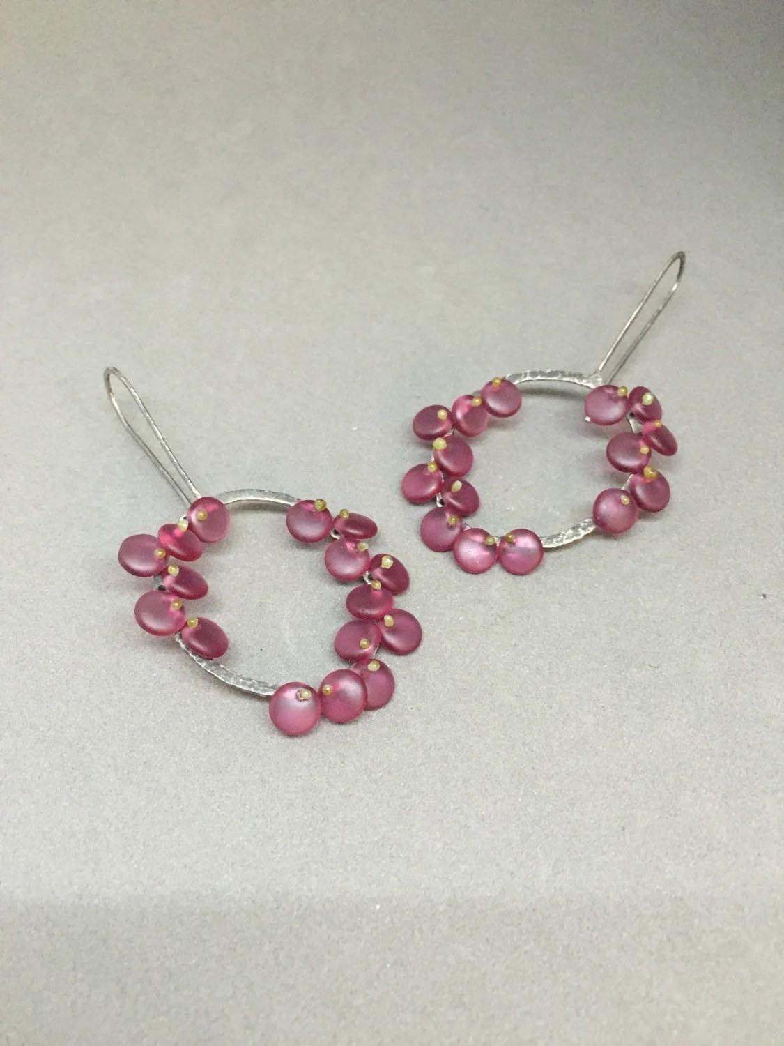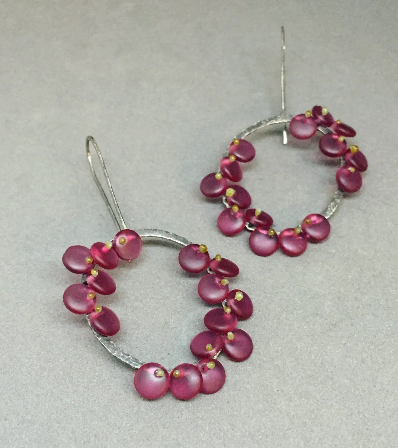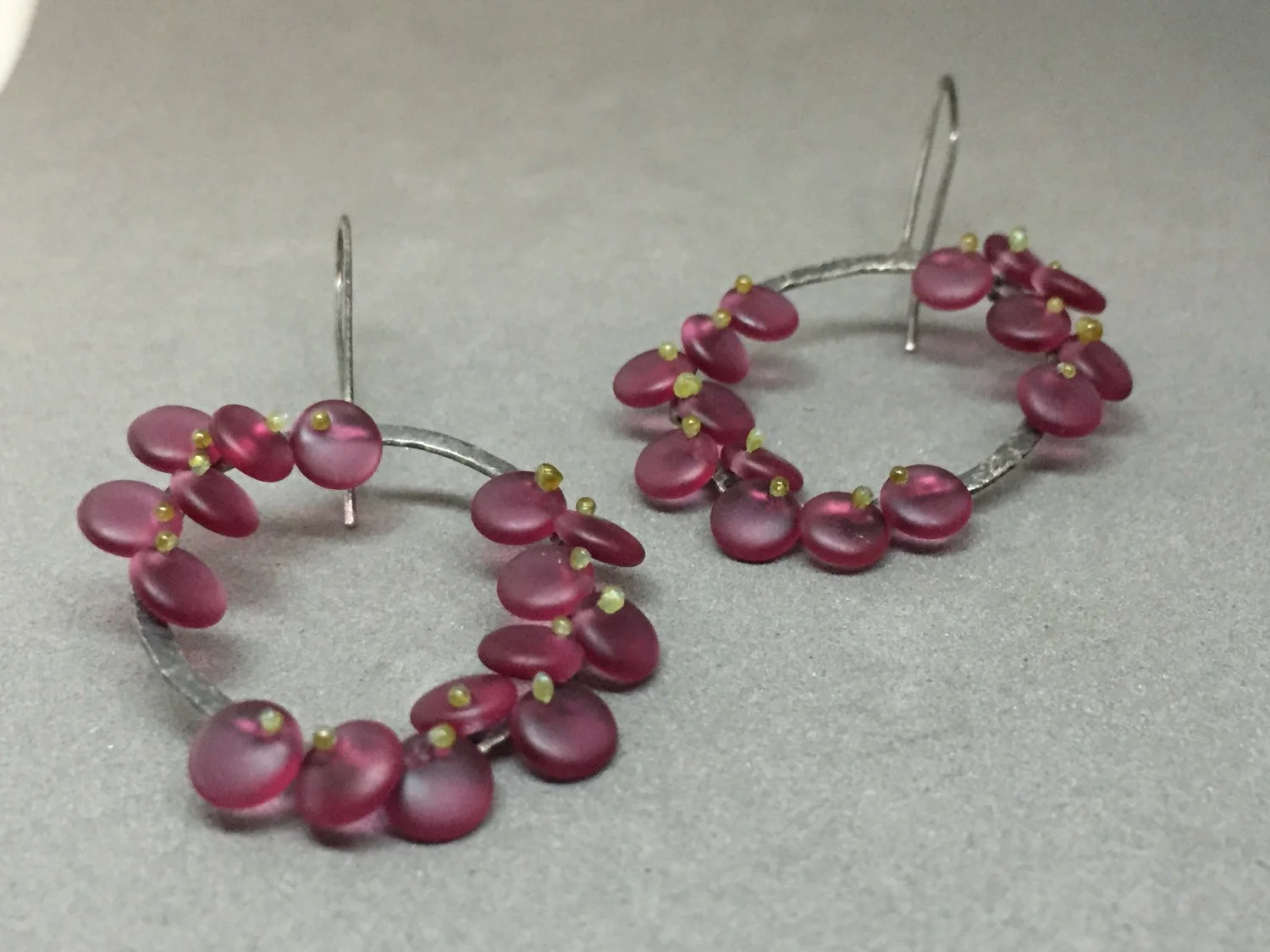 organic orb bloom earrings in a luscious berry wine color. the lentil beads are free moving and wiggle a bit giving them a nice kinetic, life-like quality, and are held in place with monofilament. these are finished in oxidized sterling silver.
