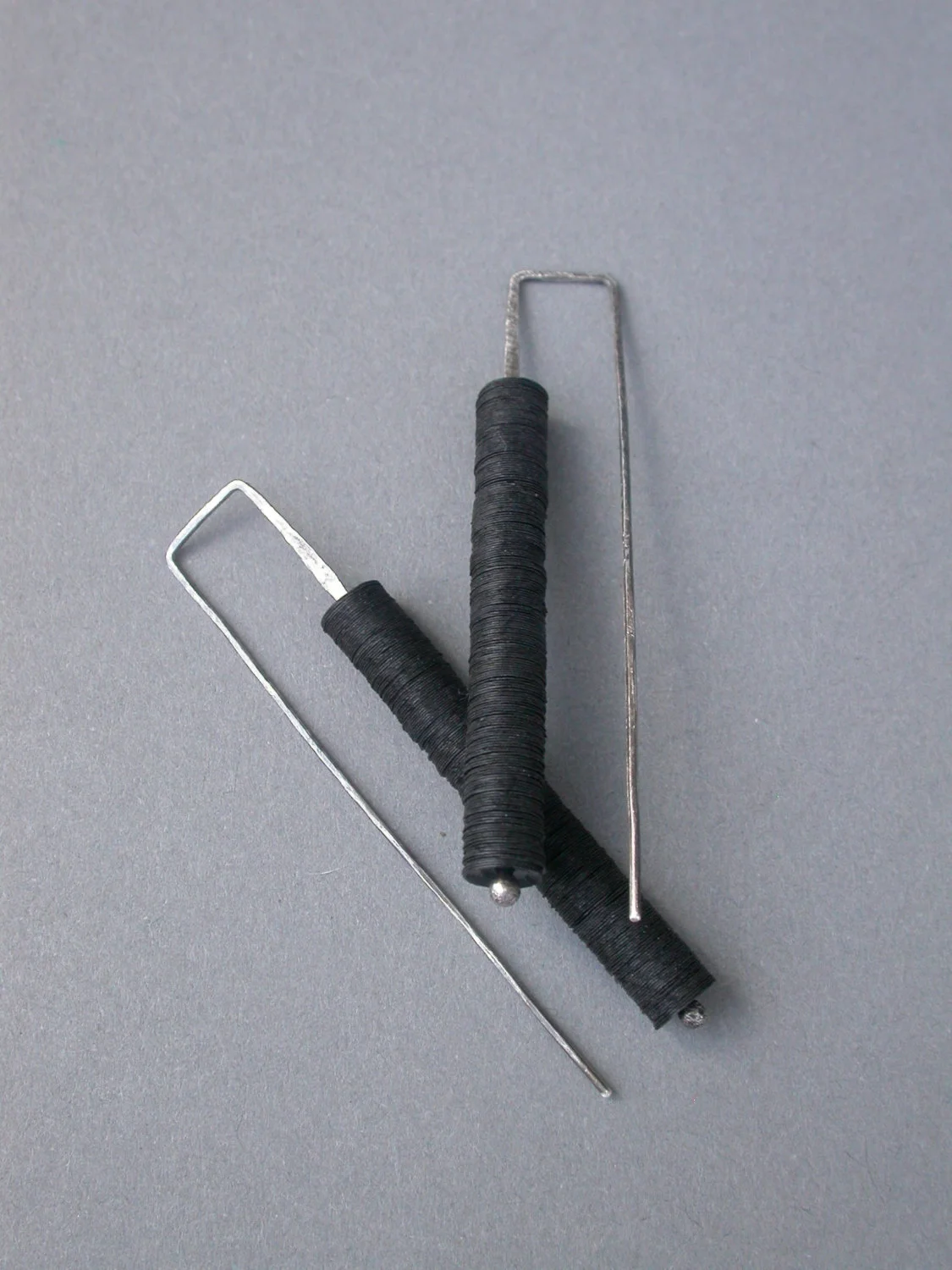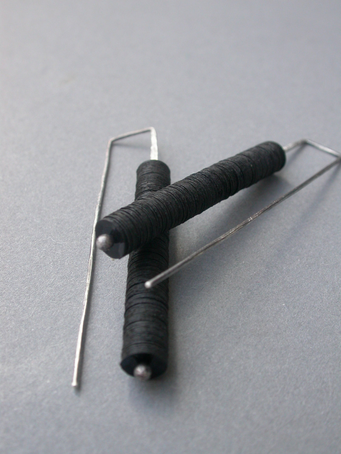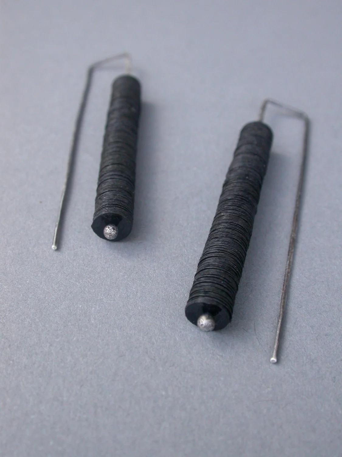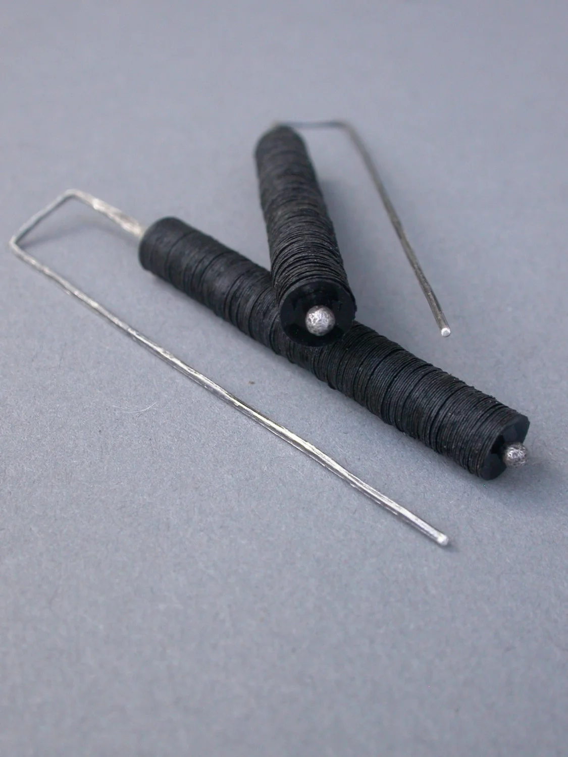 these earrings are all hand fabricated by me in my studio in austin, tx. they are made of sterling wire and sheet metal that is manipulated, soldered, sanded, oxidized & sanded again to bring back some of the sterling to the surface.