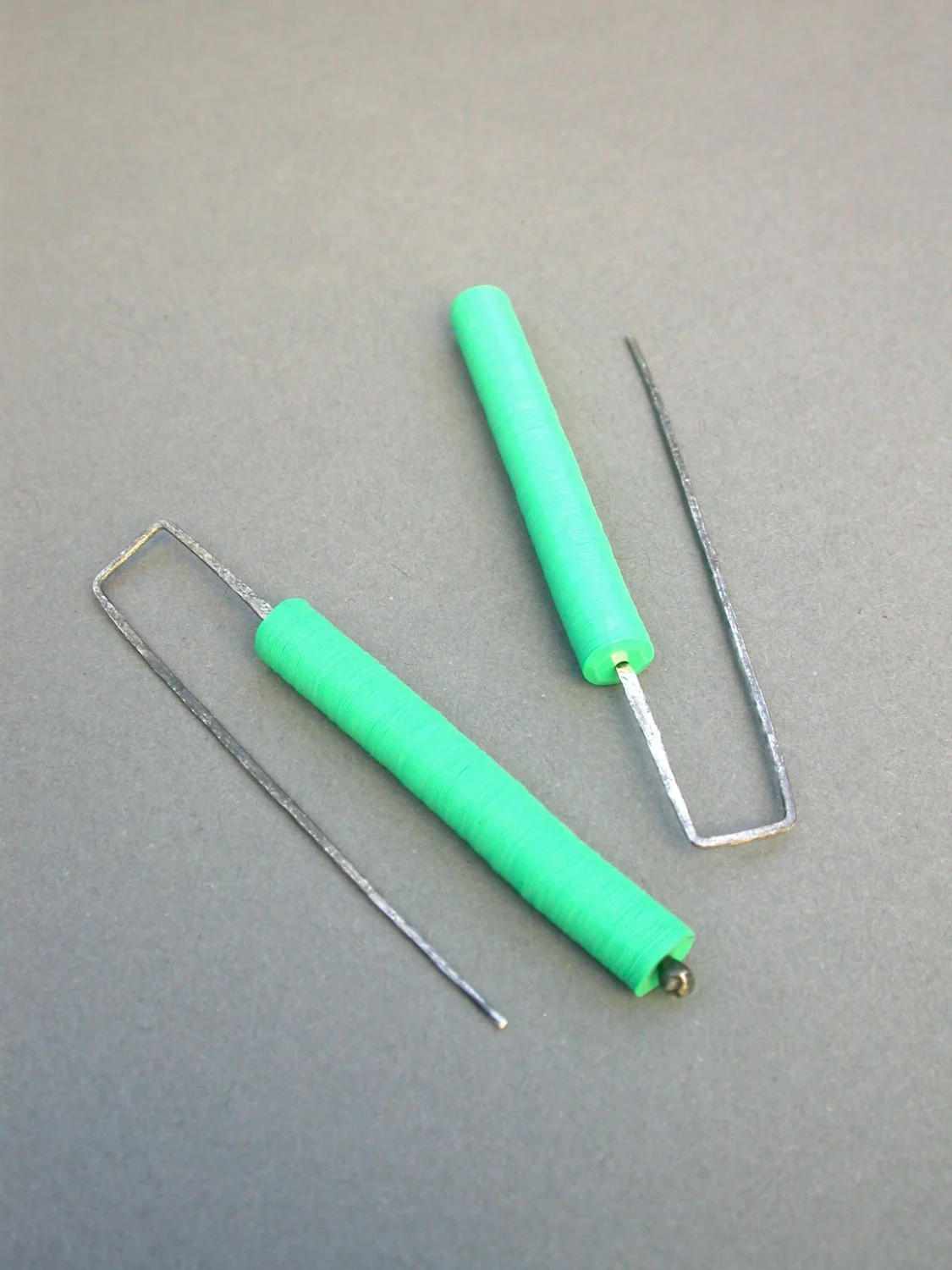 these earrings are all hand fabricated by me in my studio in austin, tx. they are made of sterling wire and sheet metal that is manipulated, soldered, sanded, oxidized & sanded again to bring back some of the sterling to the surface.