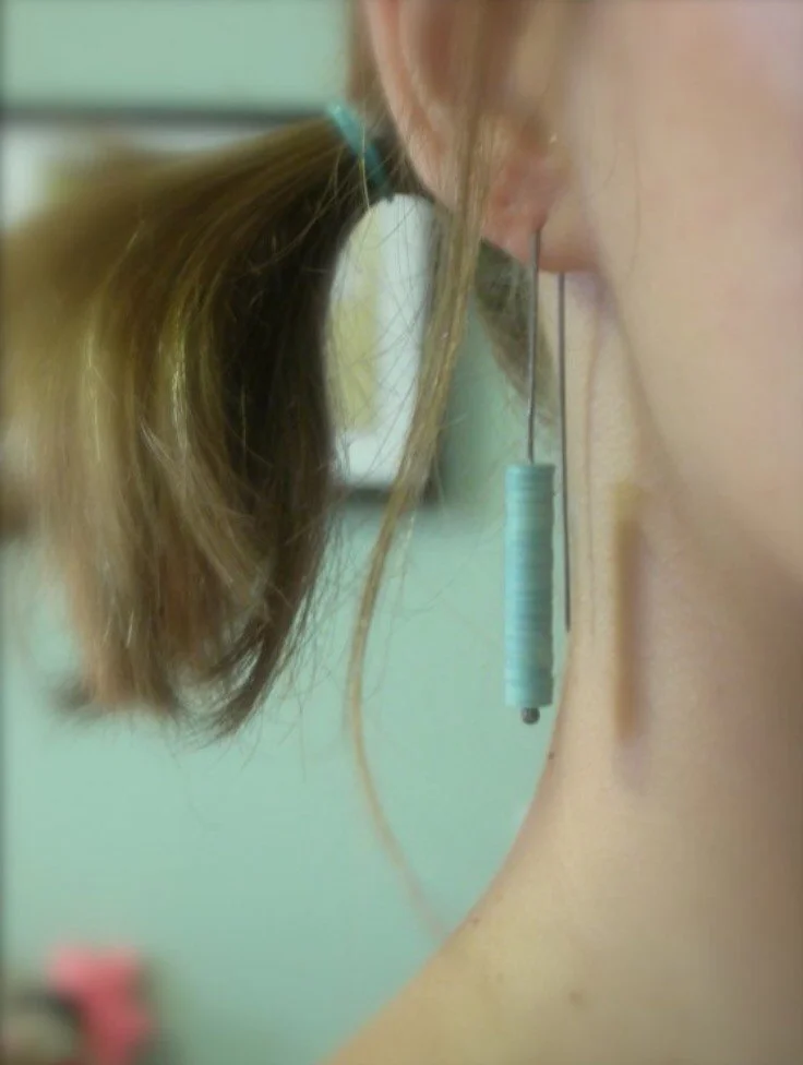these earrings are all hand fabricated by me in my studio in austin, tx. they are made of sterling wire and sheet metal that is manipulated, soldered, sanded, oxidized & sanded again to bring back some of the sterling to the surface.