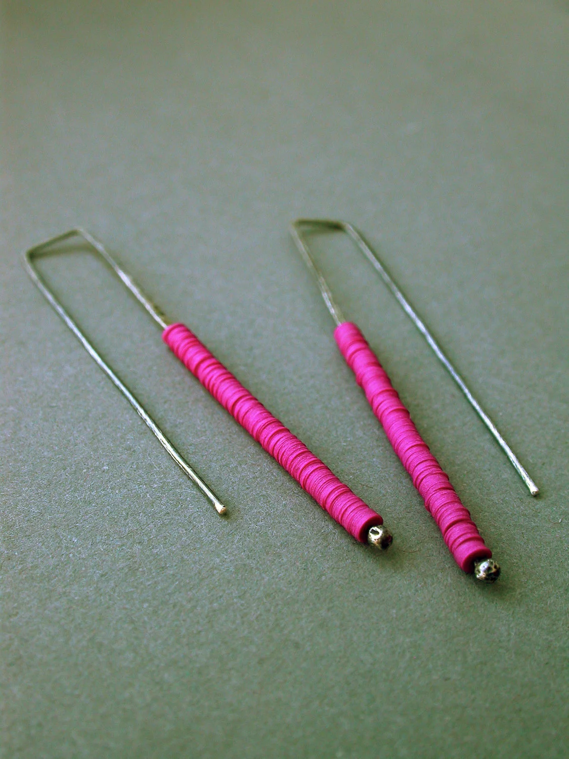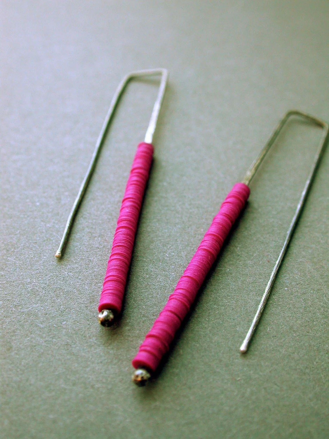 stacked linear column vintage sequin oxidized silver earrings dangle long simple magenta grape fucshia purple everyday jaime jo fisher