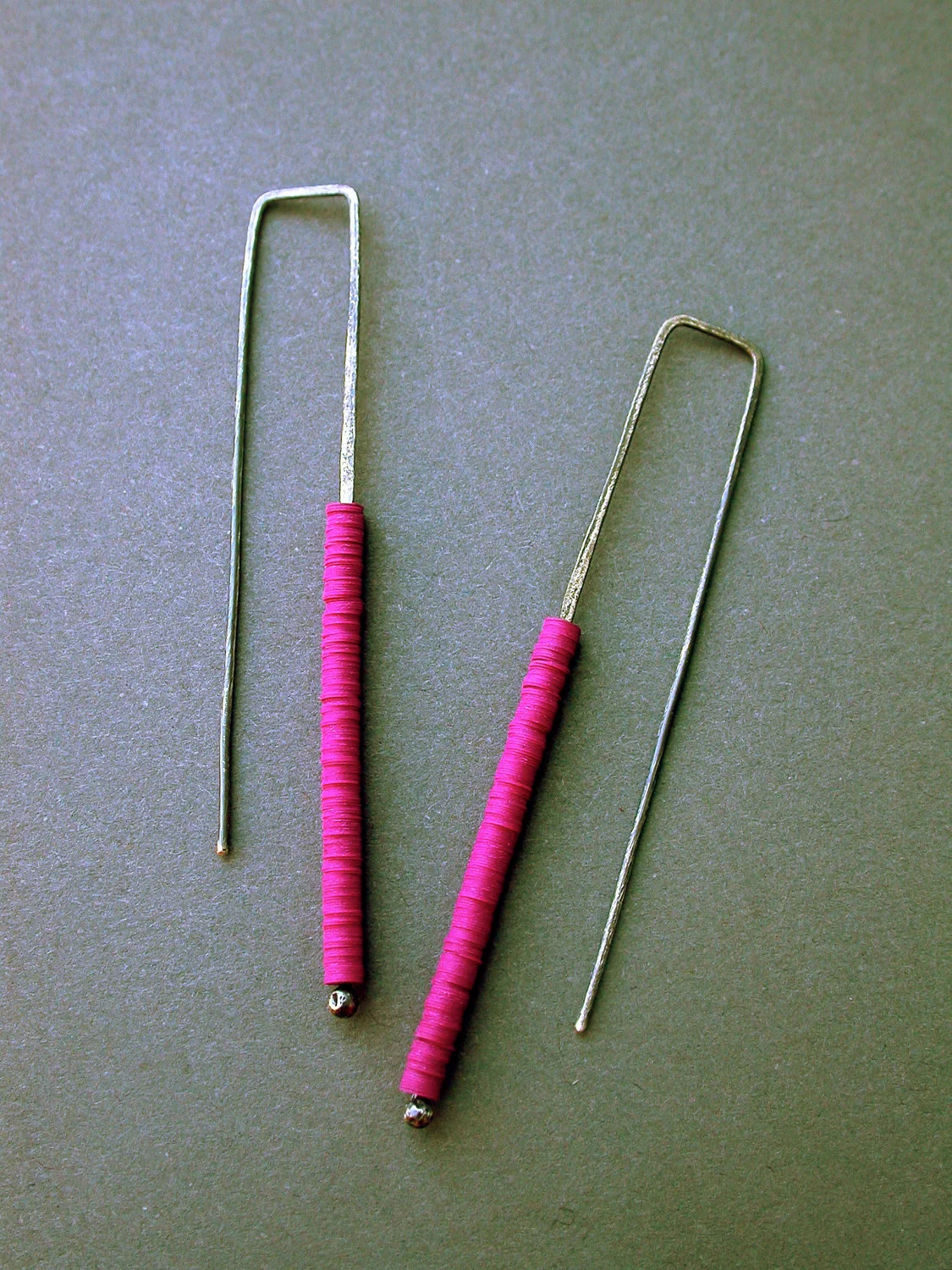 NEW COLOR....these candy stick earrings are a killer magenta color with vintage sequins (very rare color) from france or belgium and oxidized sterling silver. these sweet, yet sleek earrings will add a little sass to any outfit. these are very versatile yet sassy.....good with blue jeans & a black tank or to add that edge to your little black dress. these have a really lovely detail in the tiny stacked sequins.