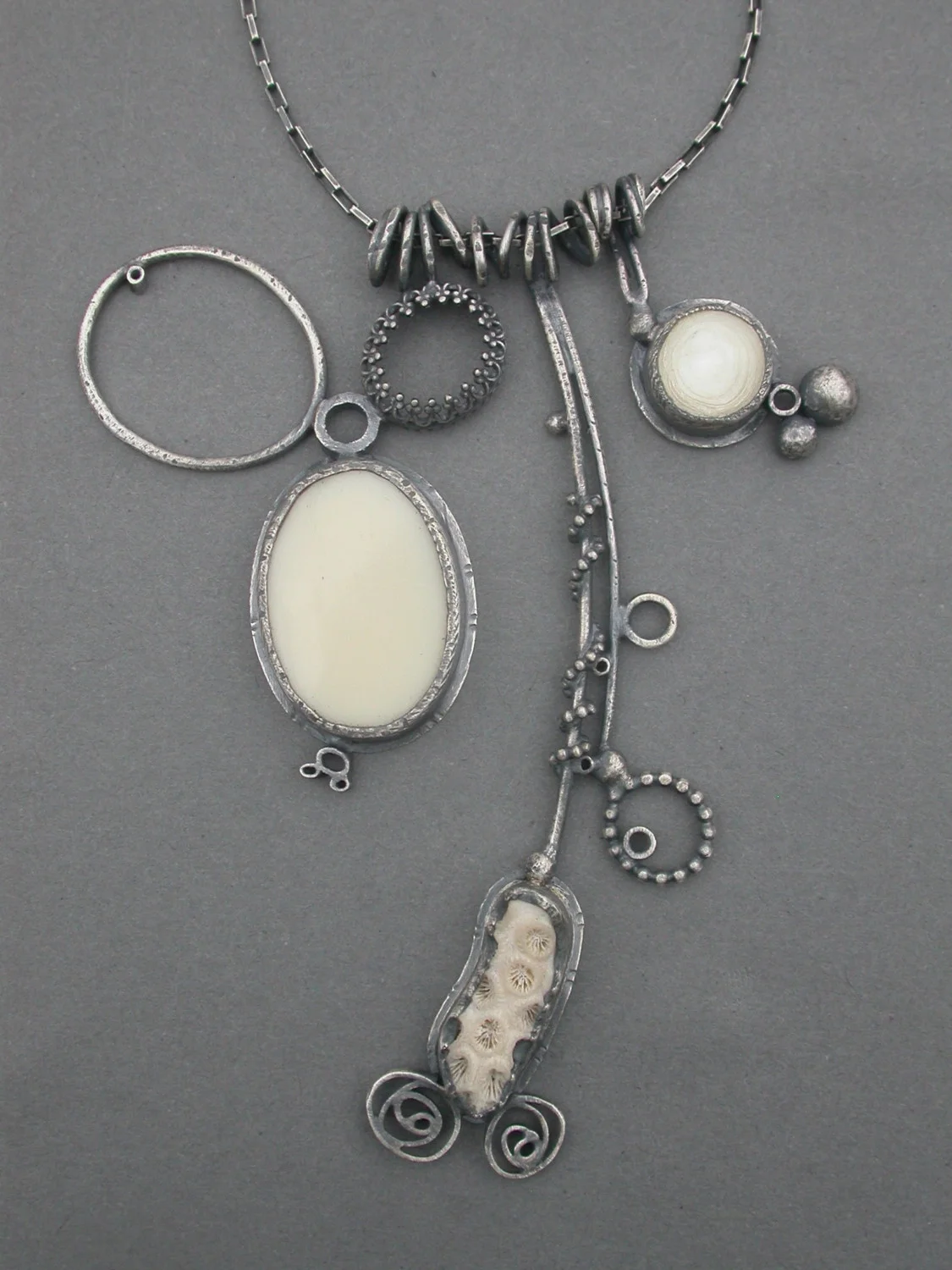 cream creme white nuetral nature necklace sculptural mobile necklace contemporary art necklace oxidized silver found coral opal beach sea