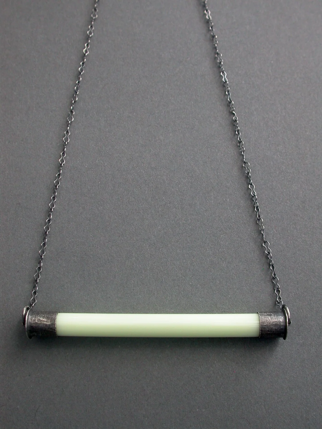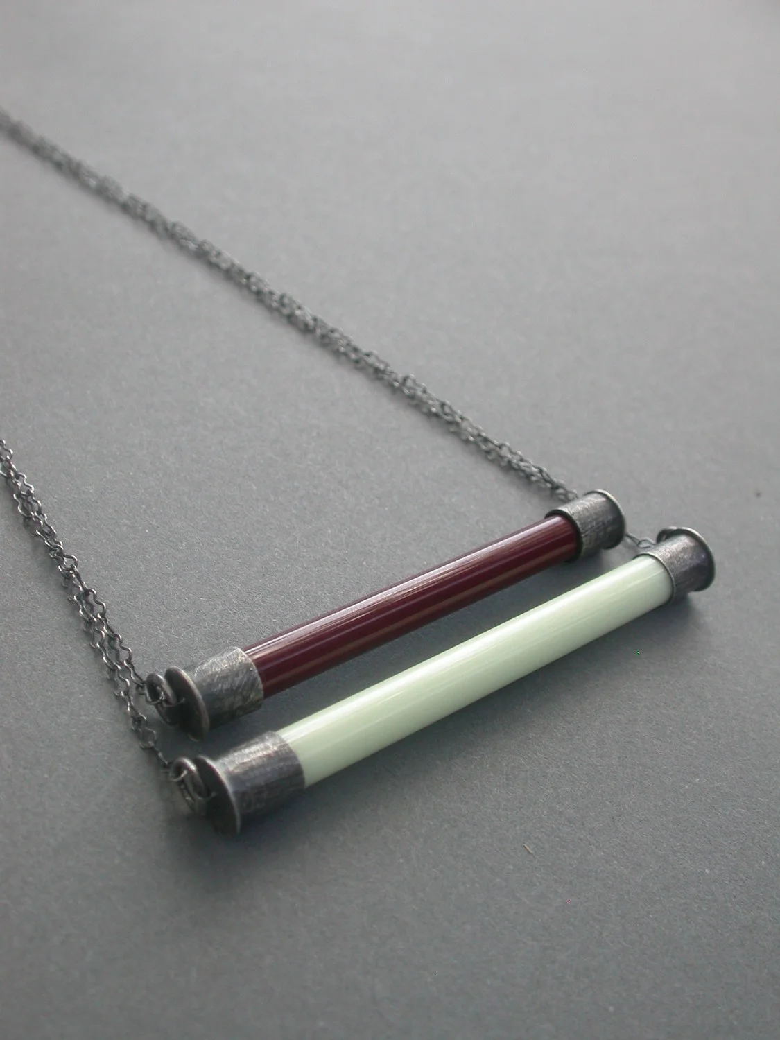 glass necklace glass cane bright oxidized sterling geometric linear modern bold eclectic jewelry seafoam green merlot opal olive wearable