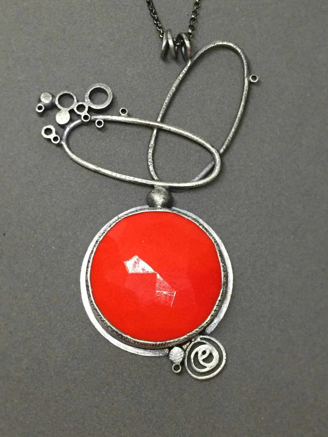 neon red lipstick bright red bright color big necklace oxidized sterling silver necklace pendant vintage glass metalsmith contemporary