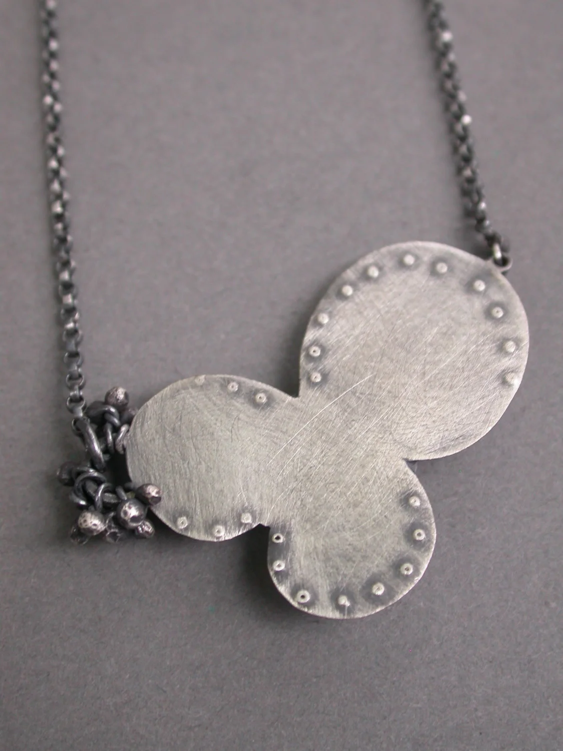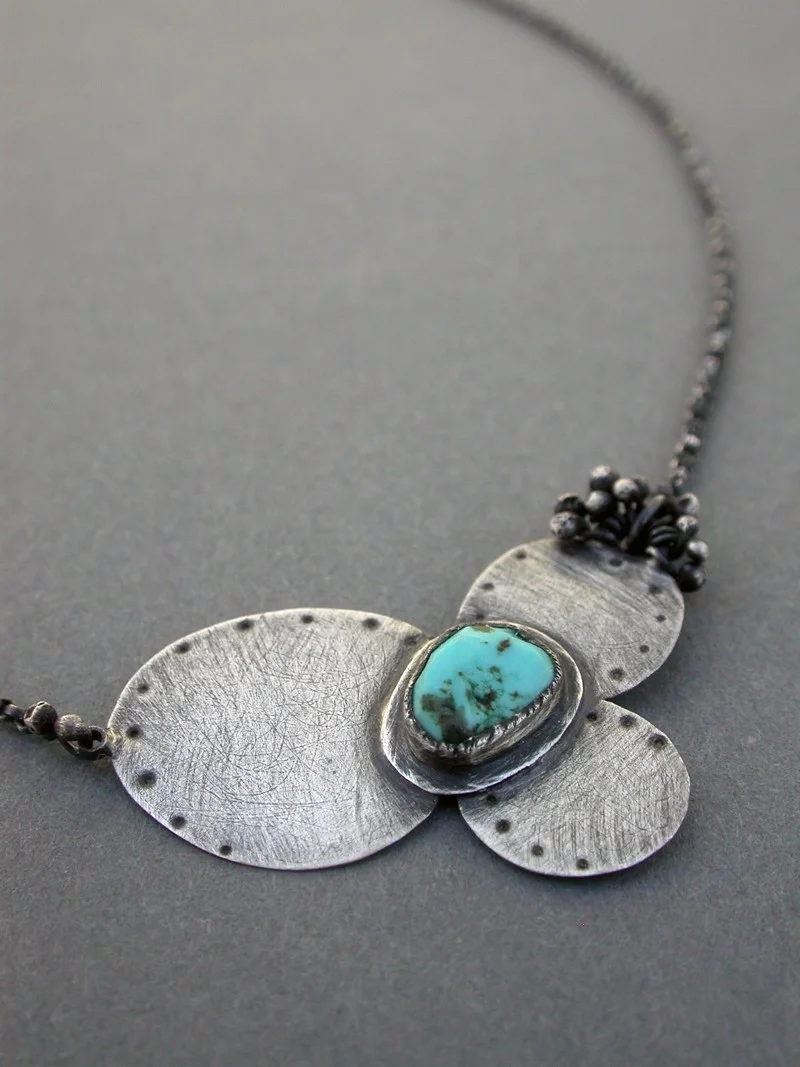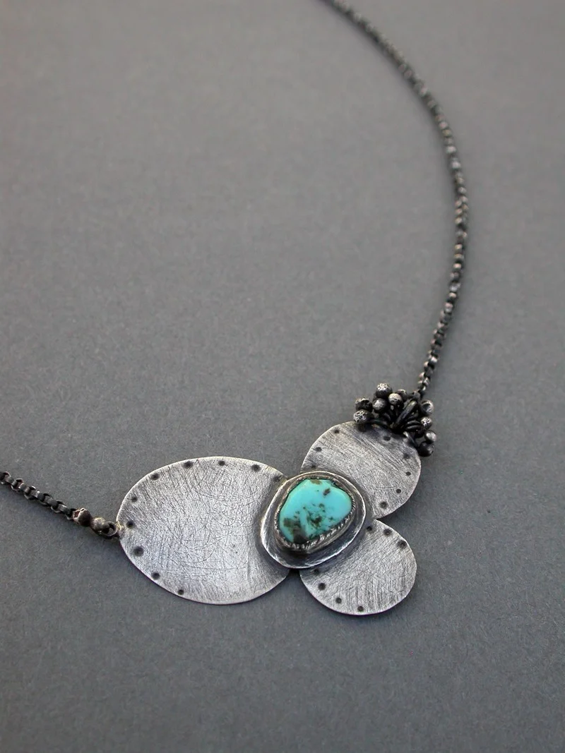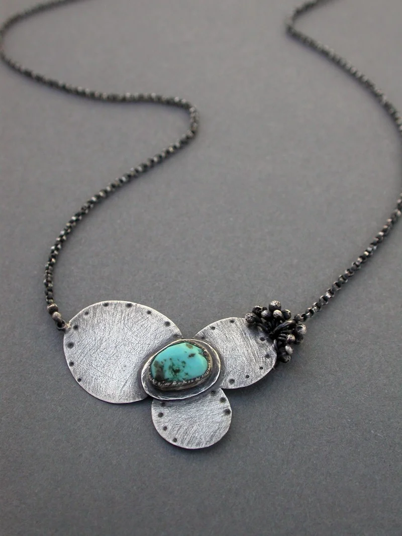 bloom petite is a sweet and simple necklace featuring a lovely little raw turquoise stone as well as a charming & flirty arrangement of a kinetic collage of tiny silver balls. this piece is feminine and fun and could be your everyday-go-to-jewelry. this piece is made of oxidized sterling silver and a raw piece of turquoise.
