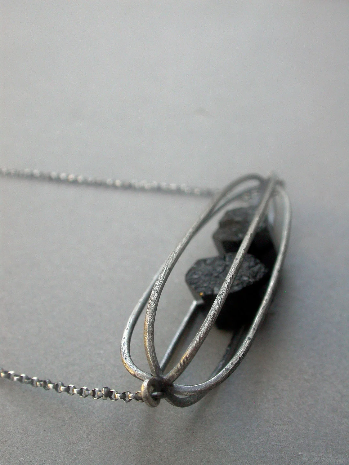 cage pod necklace made of oxidized sterling silver and black tourmaline. please specify chain length in the notes to seller during check out.