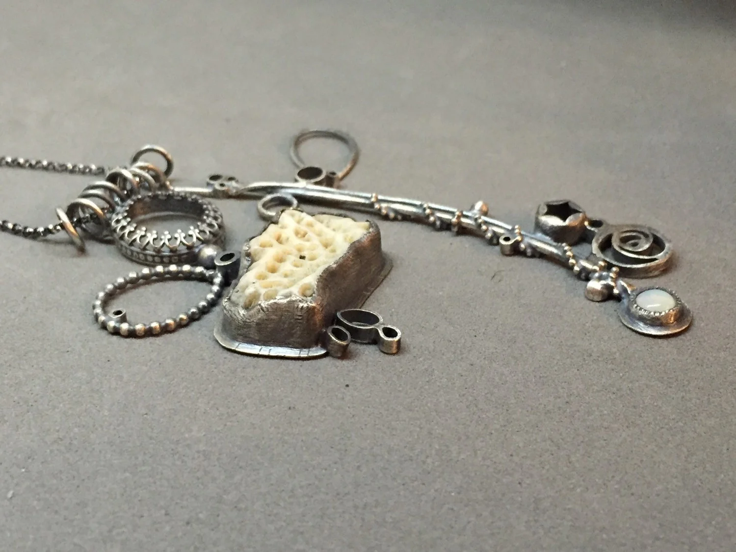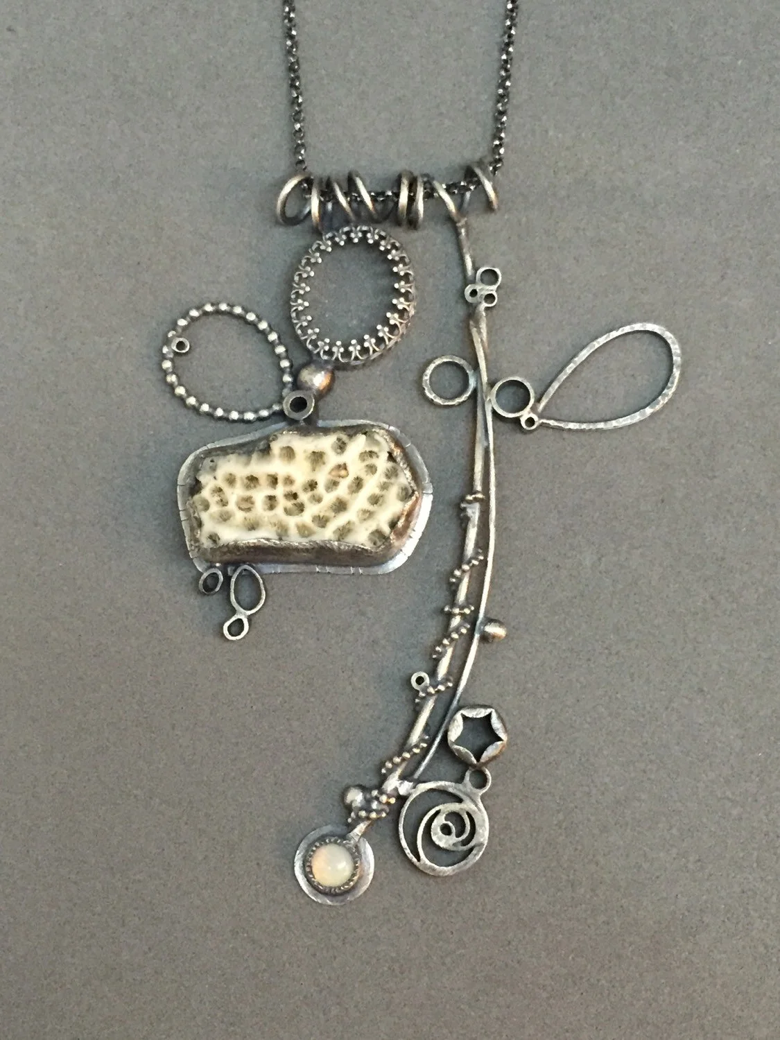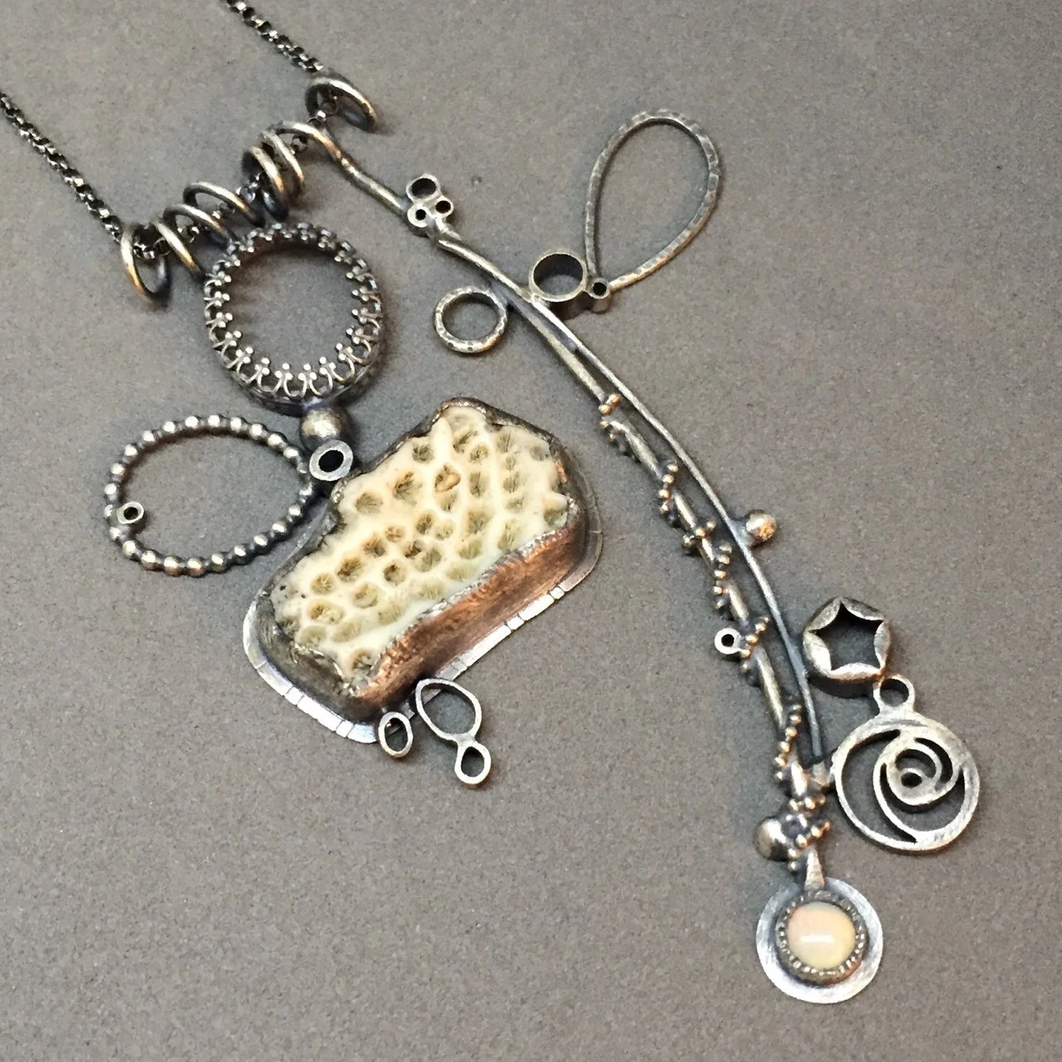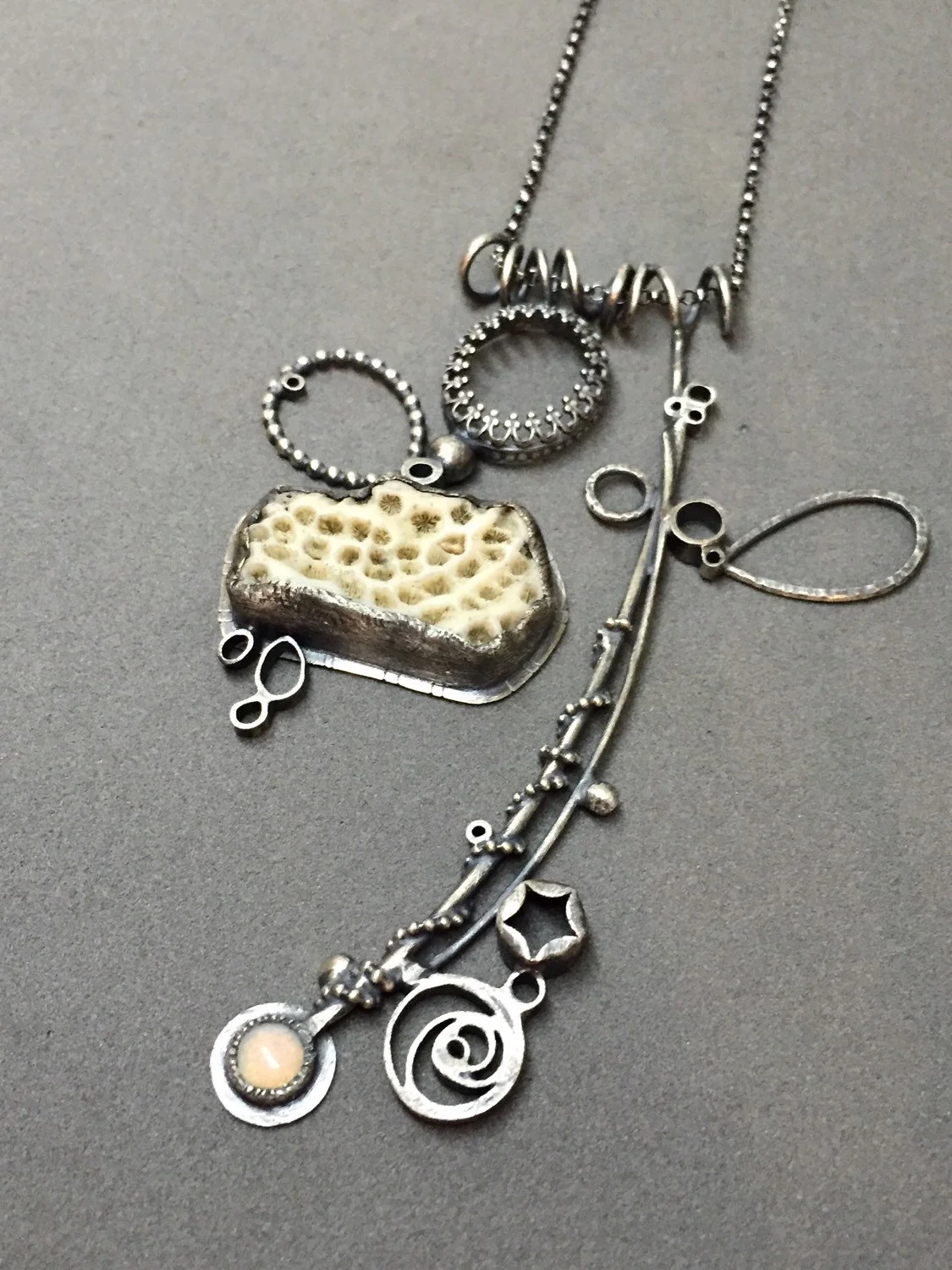 cream creme white nuetral nature necklace sculptural mobile necklace contemporary art necklace oxidized silver found coral opal beach sea