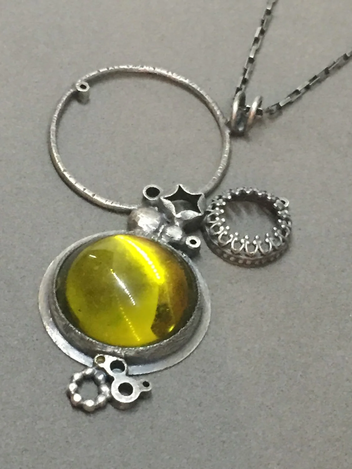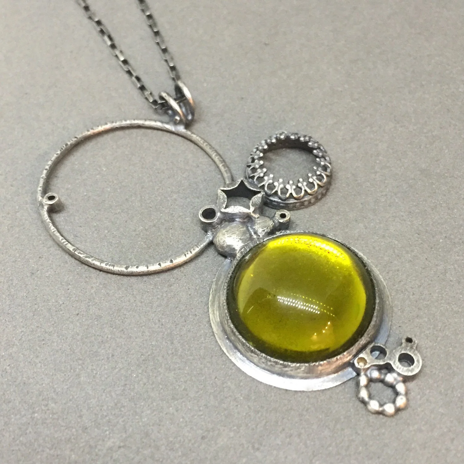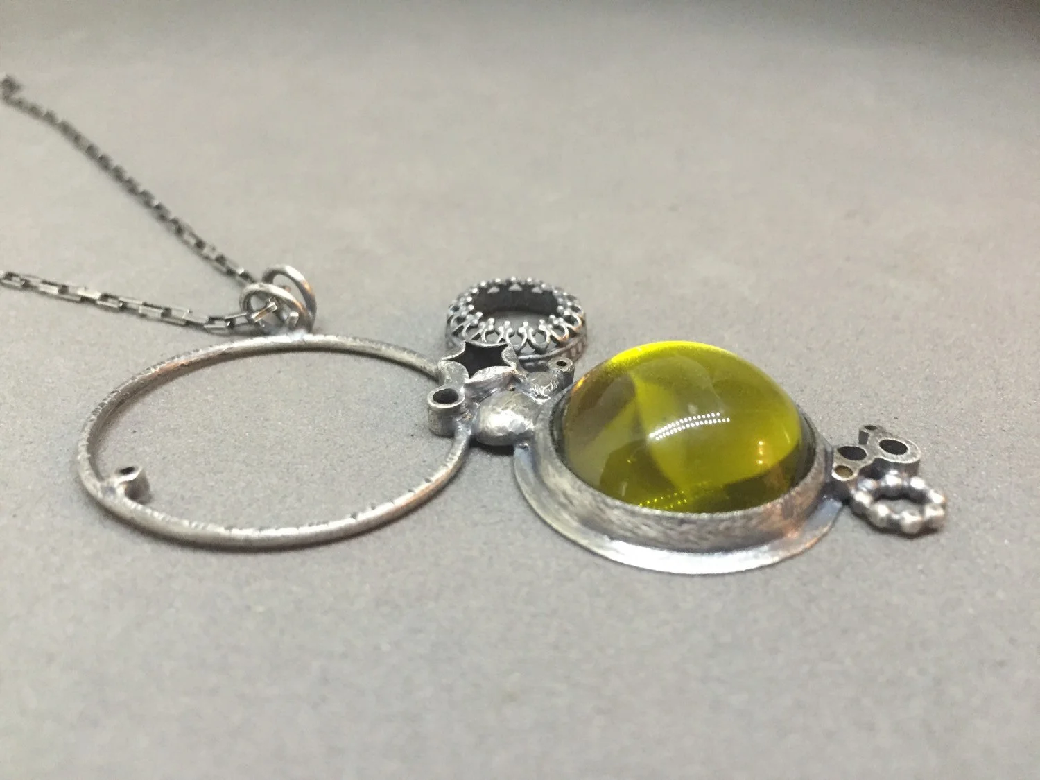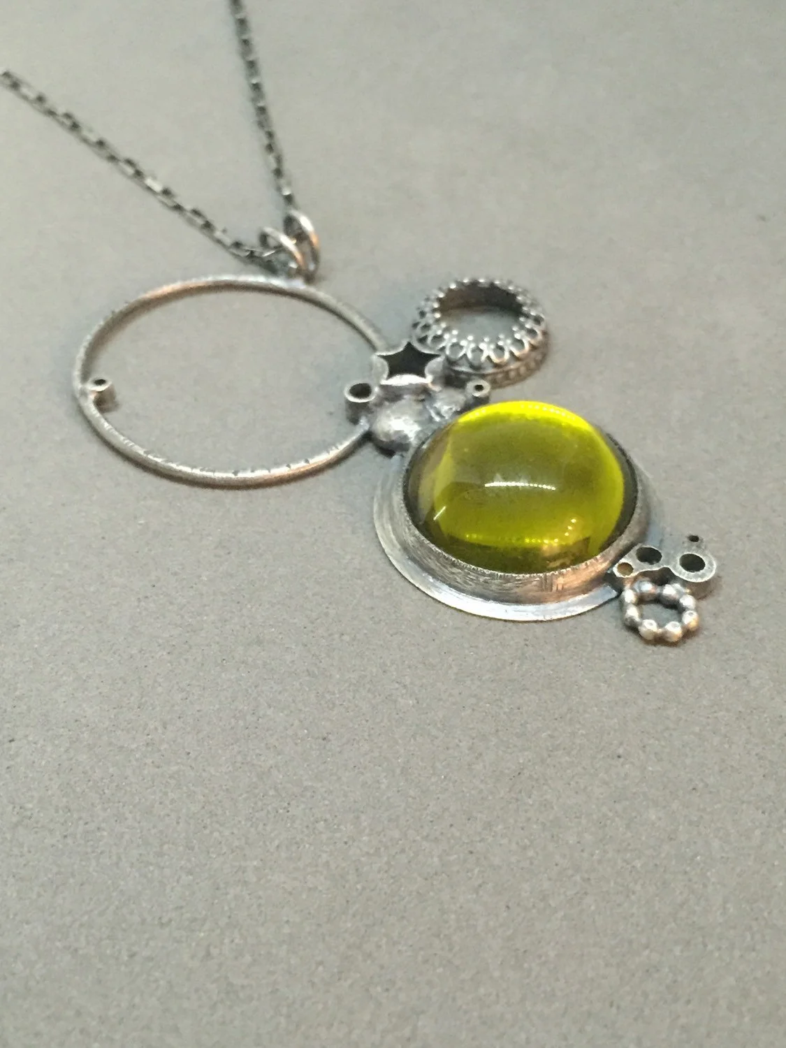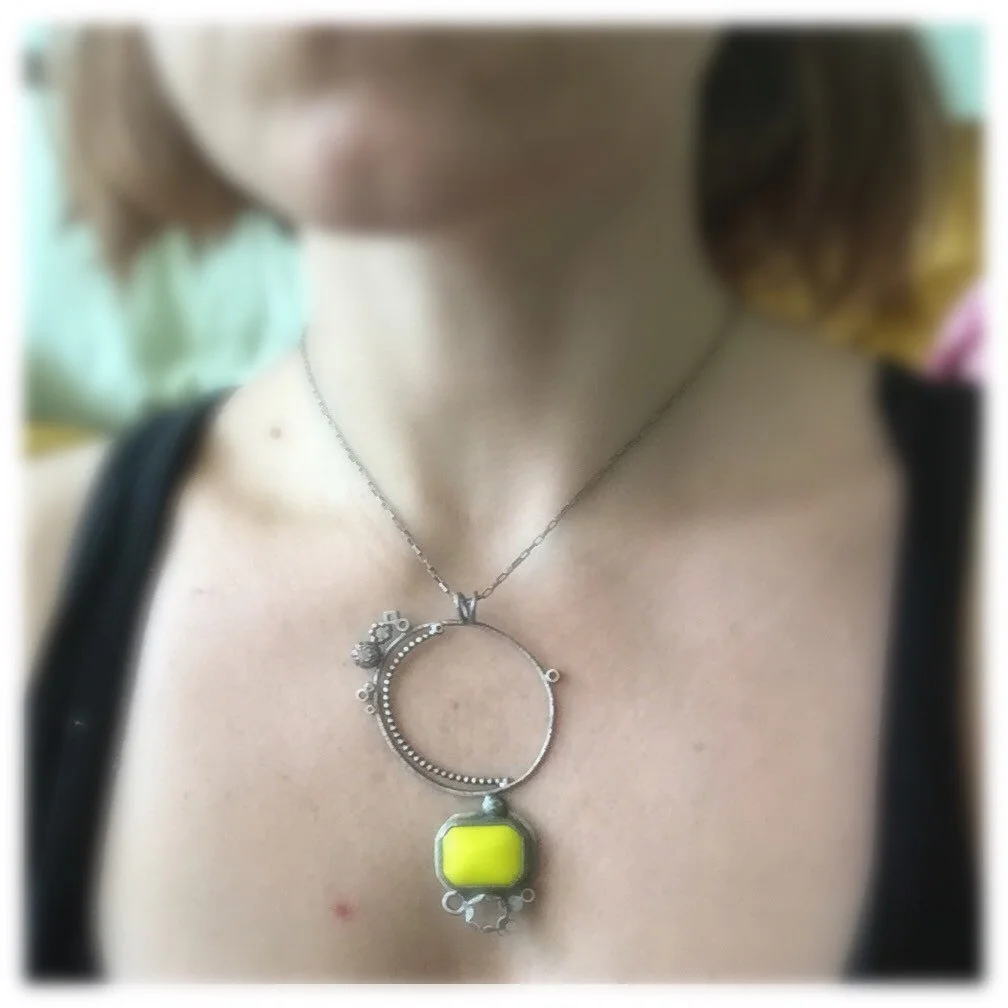 moss acid green necklace pendant everyday charm necklace metalsmith contemporary modern jewelry statement necklace mirror ball carnival