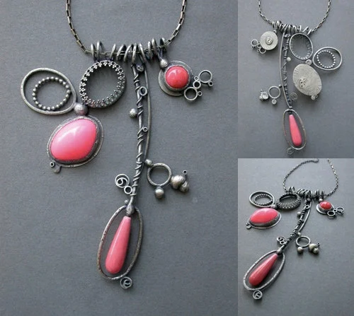 neon pink peach coral necklace sculpture sculptural wearable art modern collage oxidized silver multi pendant large necklace modern art