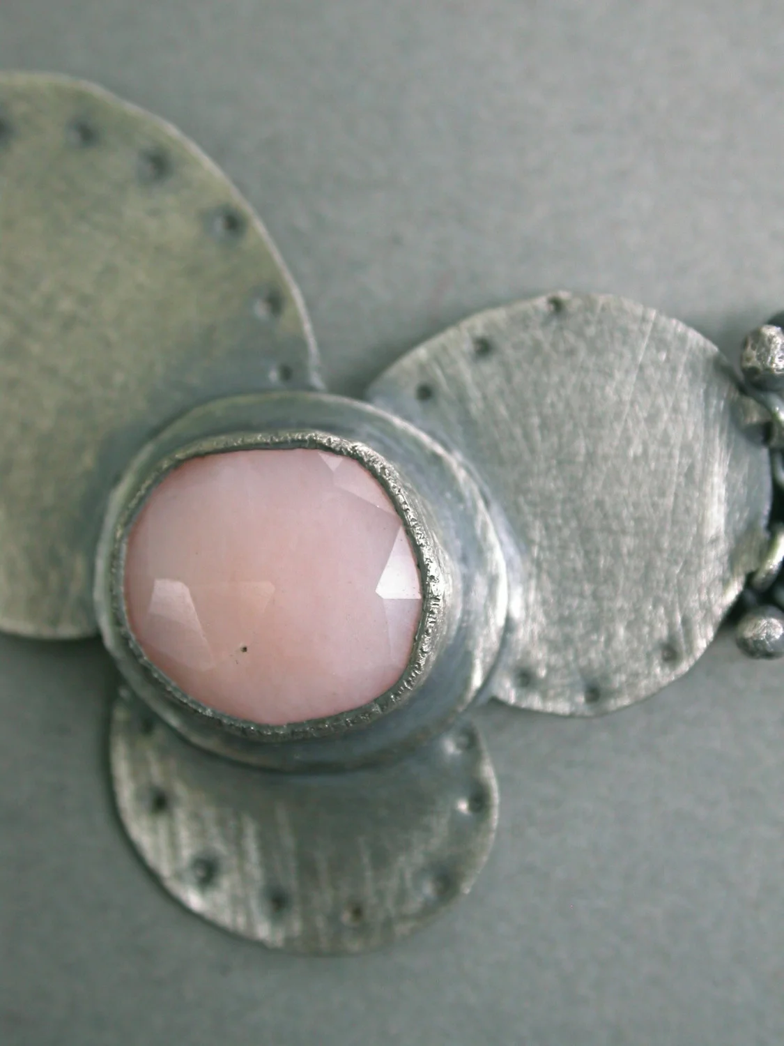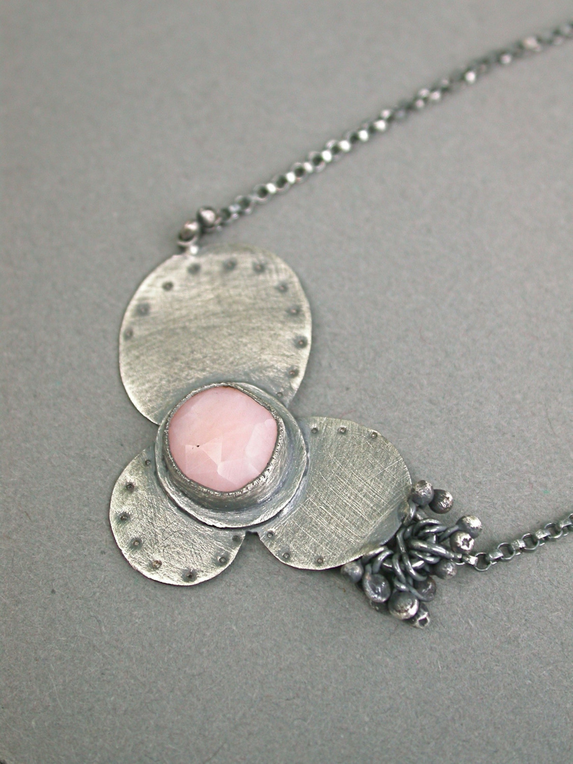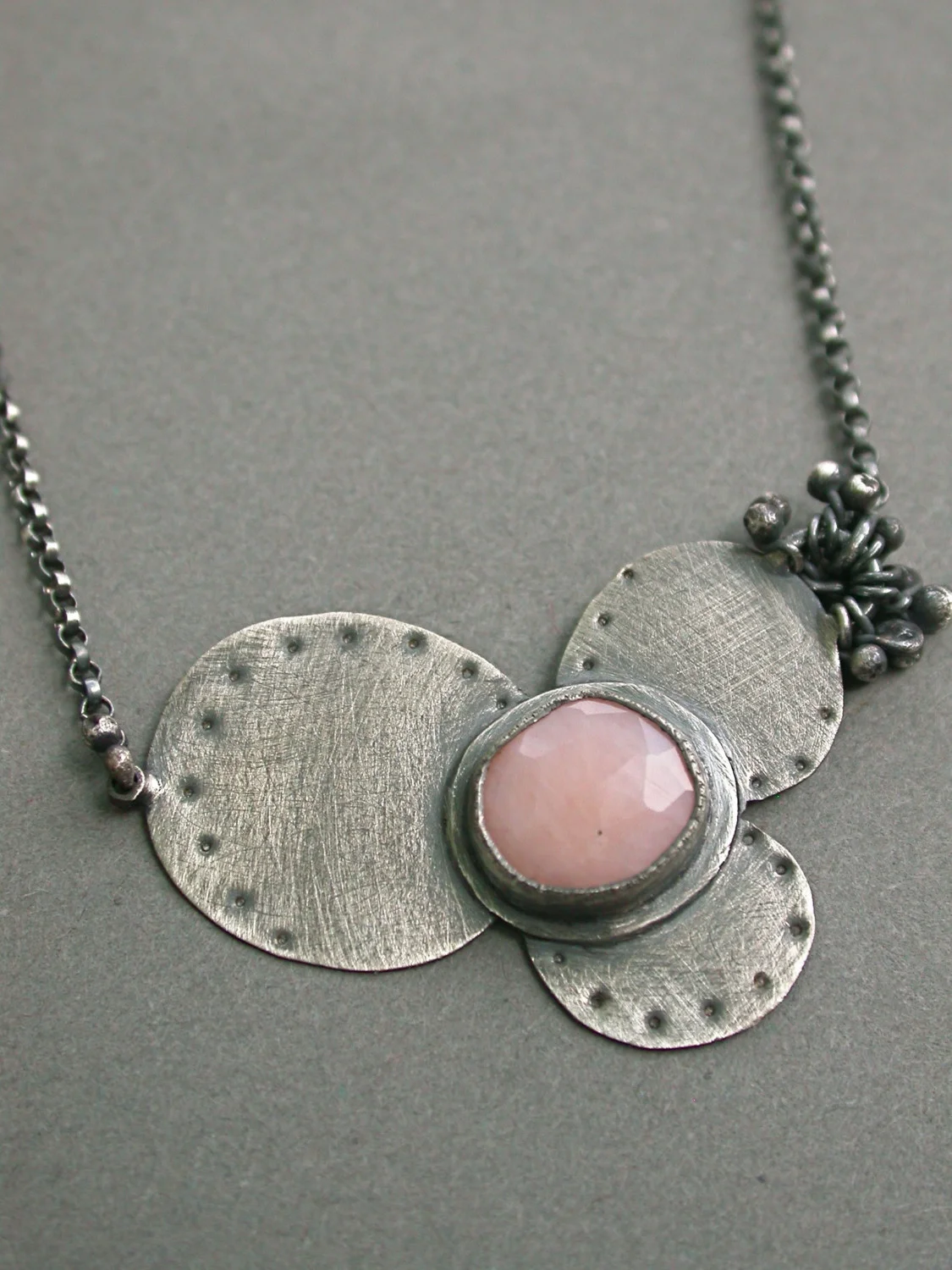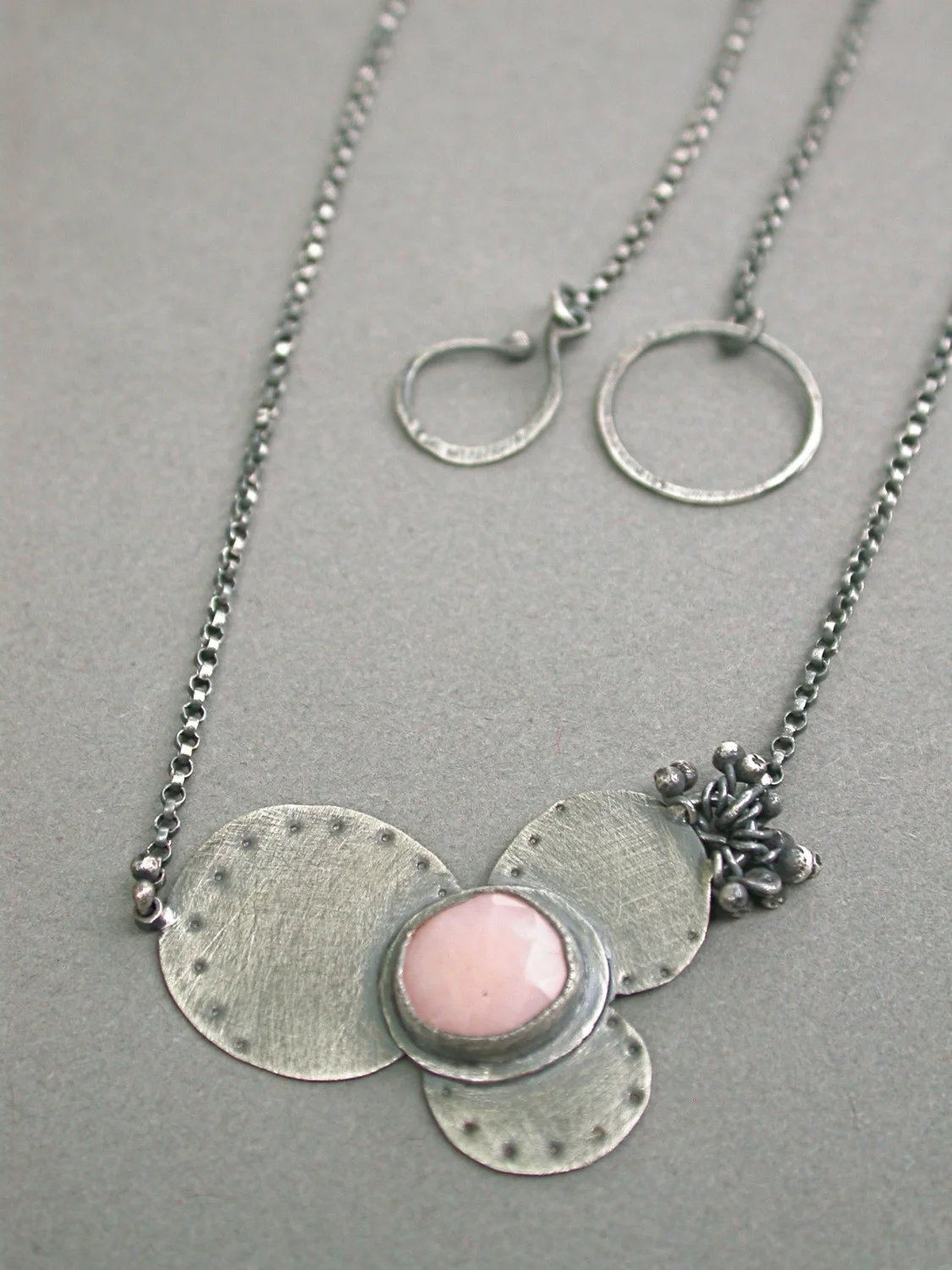 bloom petite is a sweet and simple necklace featuring a a pink opal cabochon with a faceted surface as well as a charming & flirty arrangement of kinetic tiny collage of silver balls. this piece is feminine and fun and will be your everyday-go-to-accessory.