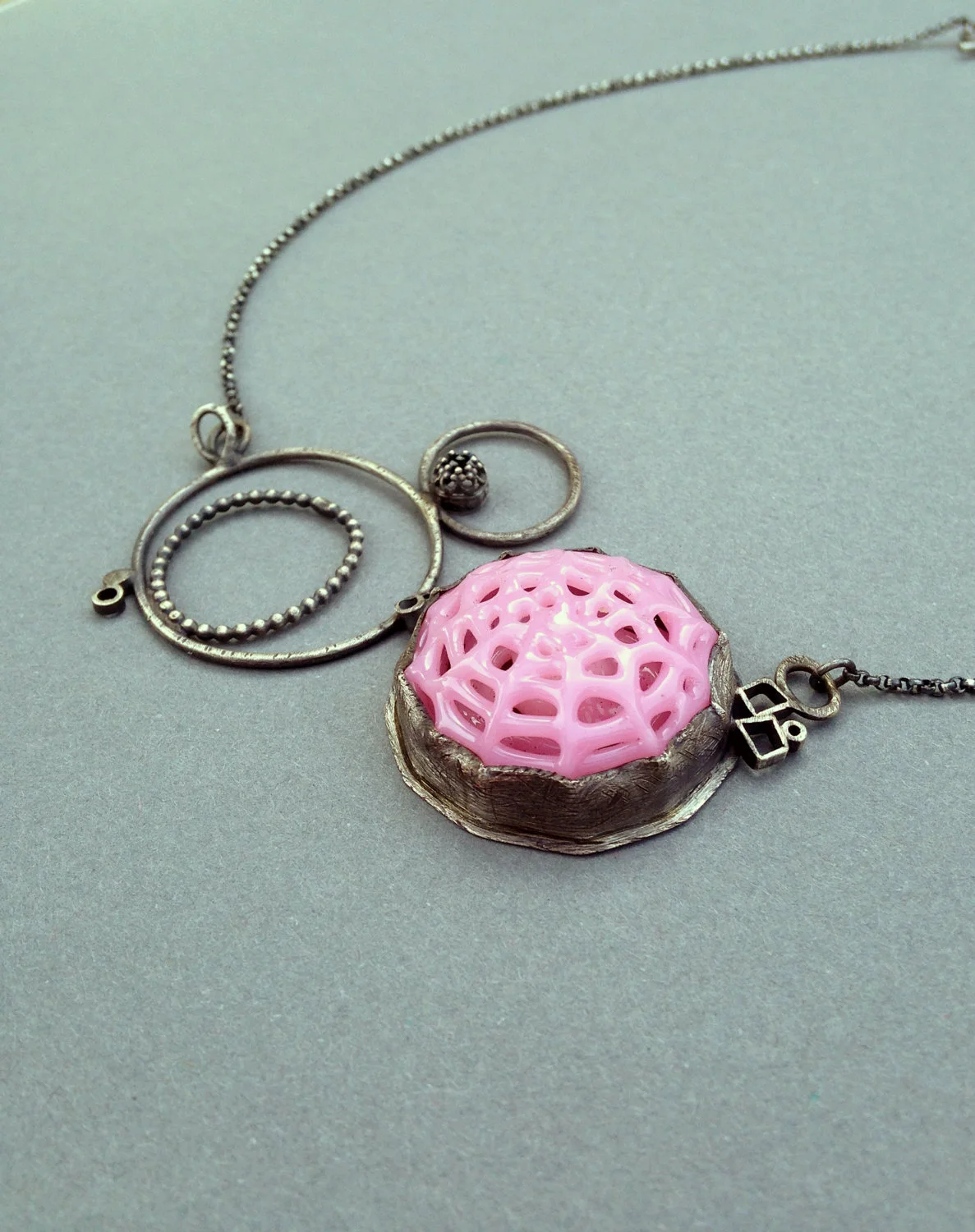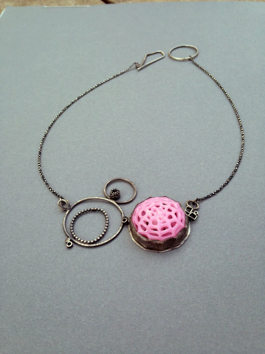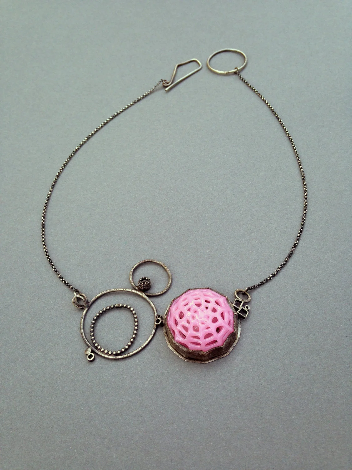 pink spun vintage glass asymmetrical eclectic statement necklace jaime jo fisher bubble gum pink large art jewelry necklace