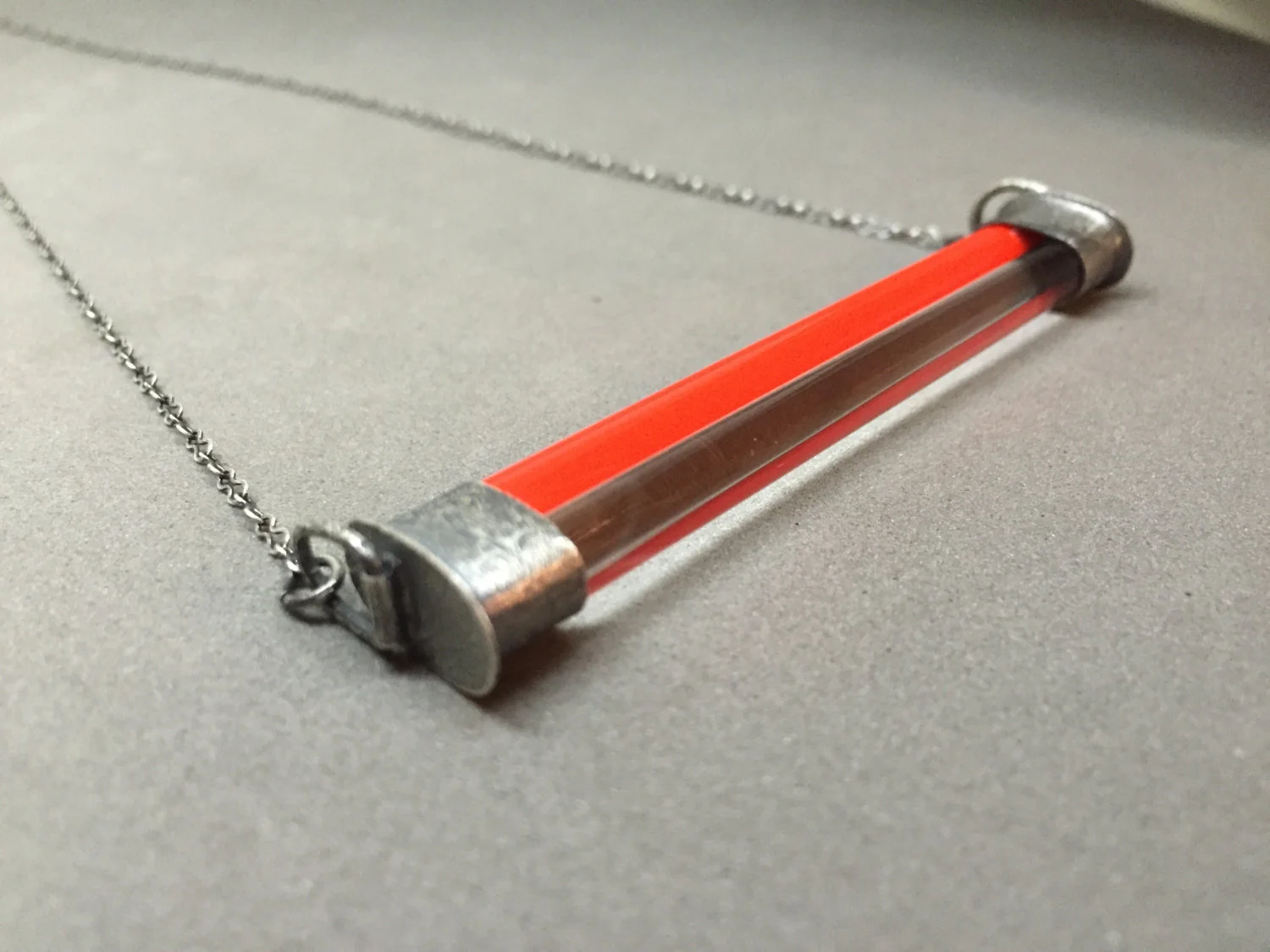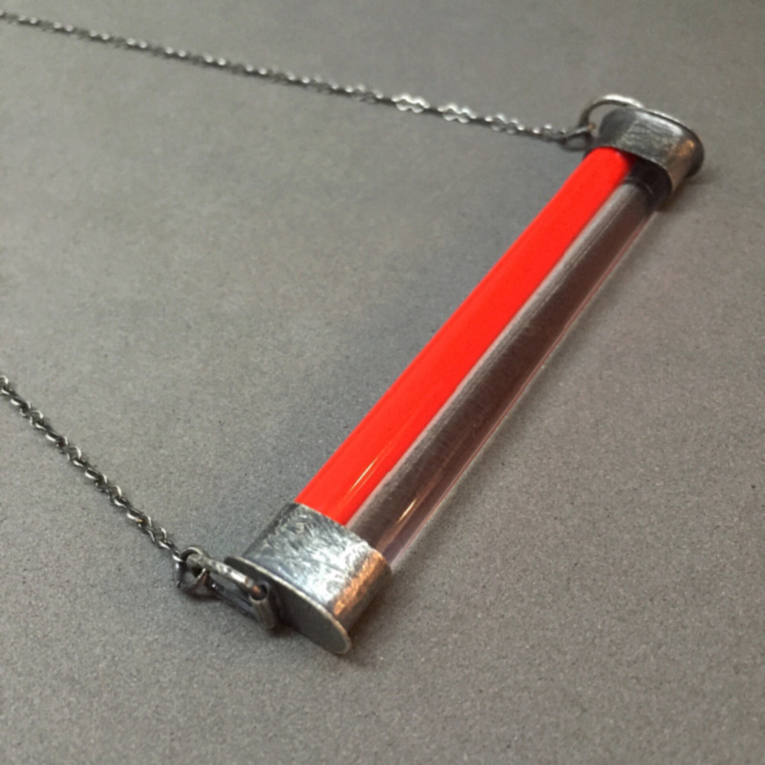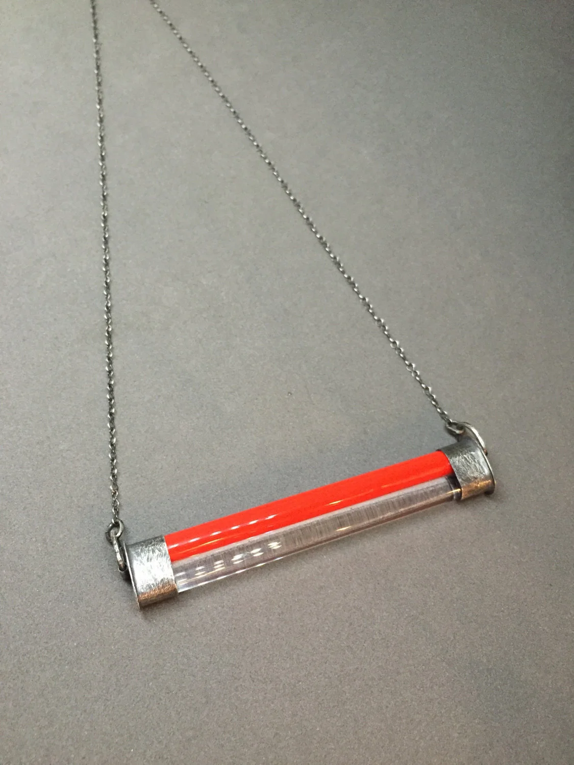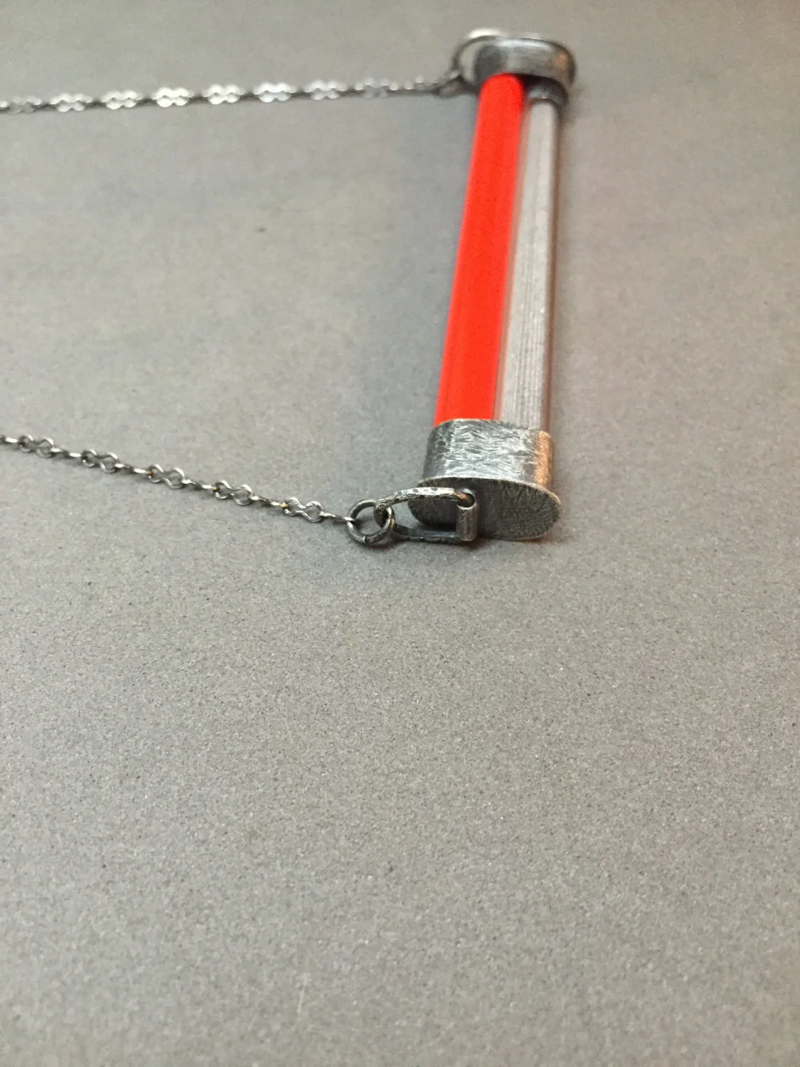 the double color bar pendant in HOT RED ORANGE & CLEAR features a sleek piece of glass in a delicious neon red & ice clear color as well as handmade end caps in oxidized sterling silver. this piece is finished with a krinkle chain and handmade clasp. the double color bar pendant is my latest design. this piece is simple, versatile and quite unique.
