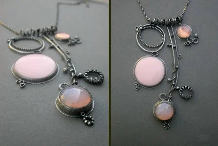 soft pale pink sculptural large necklace wearable art jewelry modern vintage glass necklace oxidized silver multi pendant jaime jo fisher