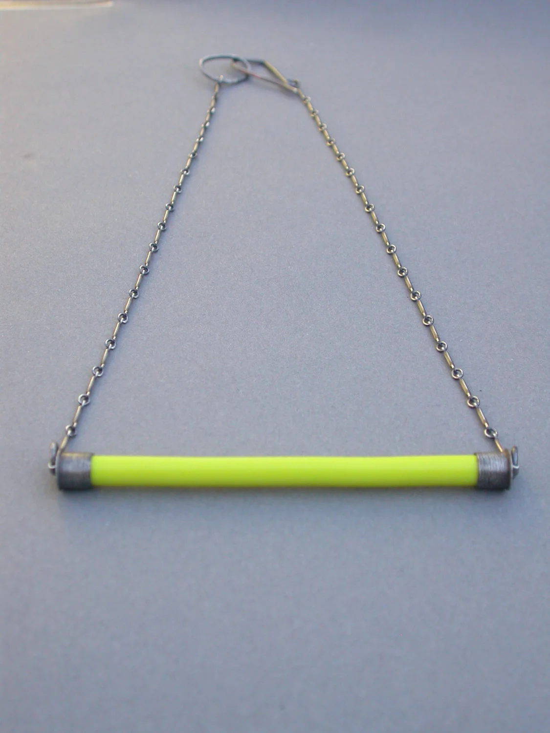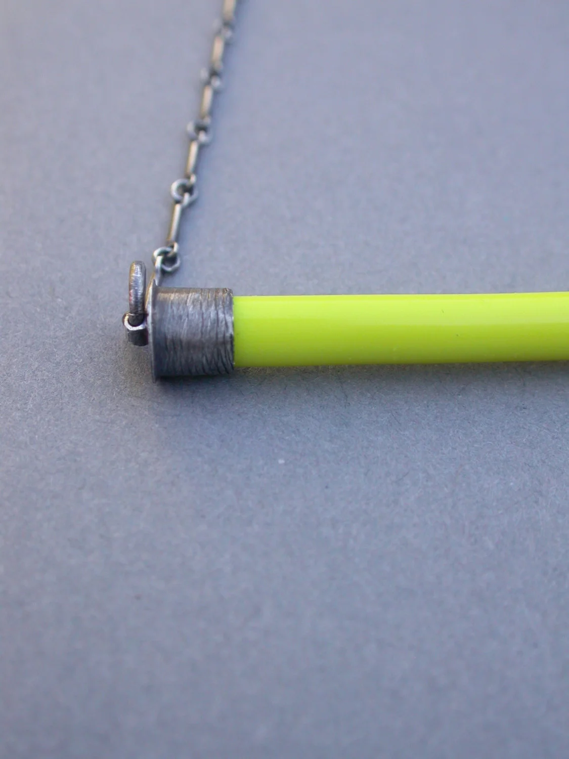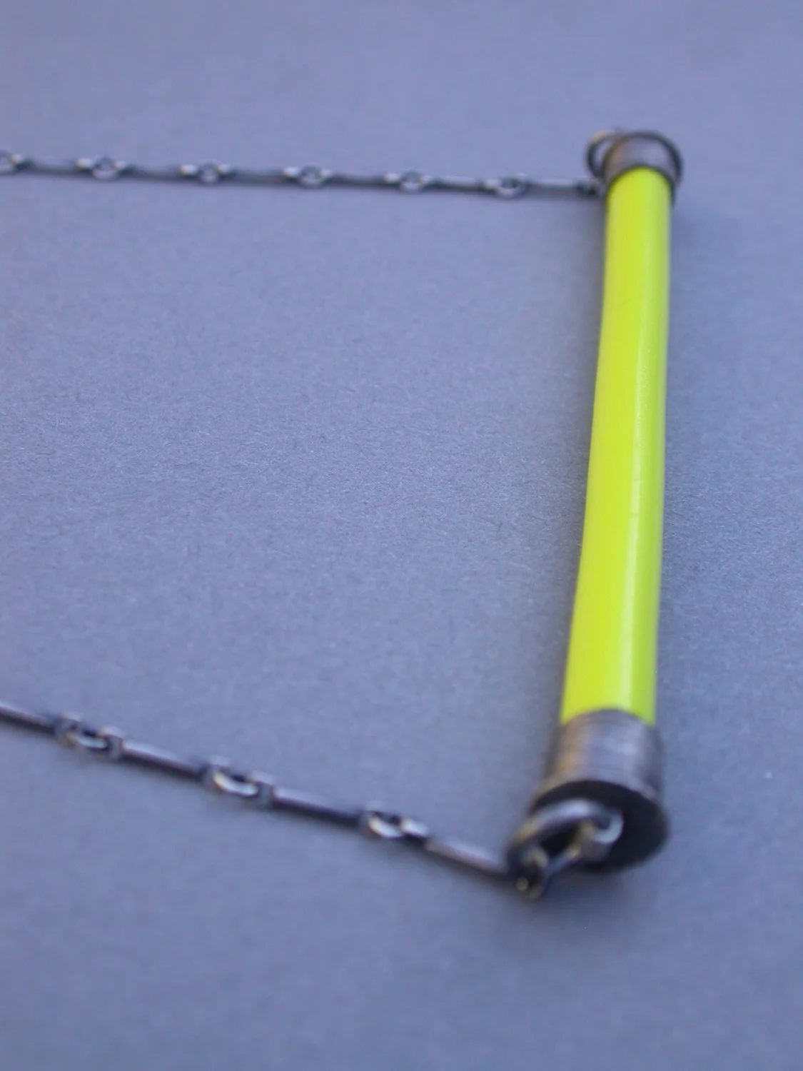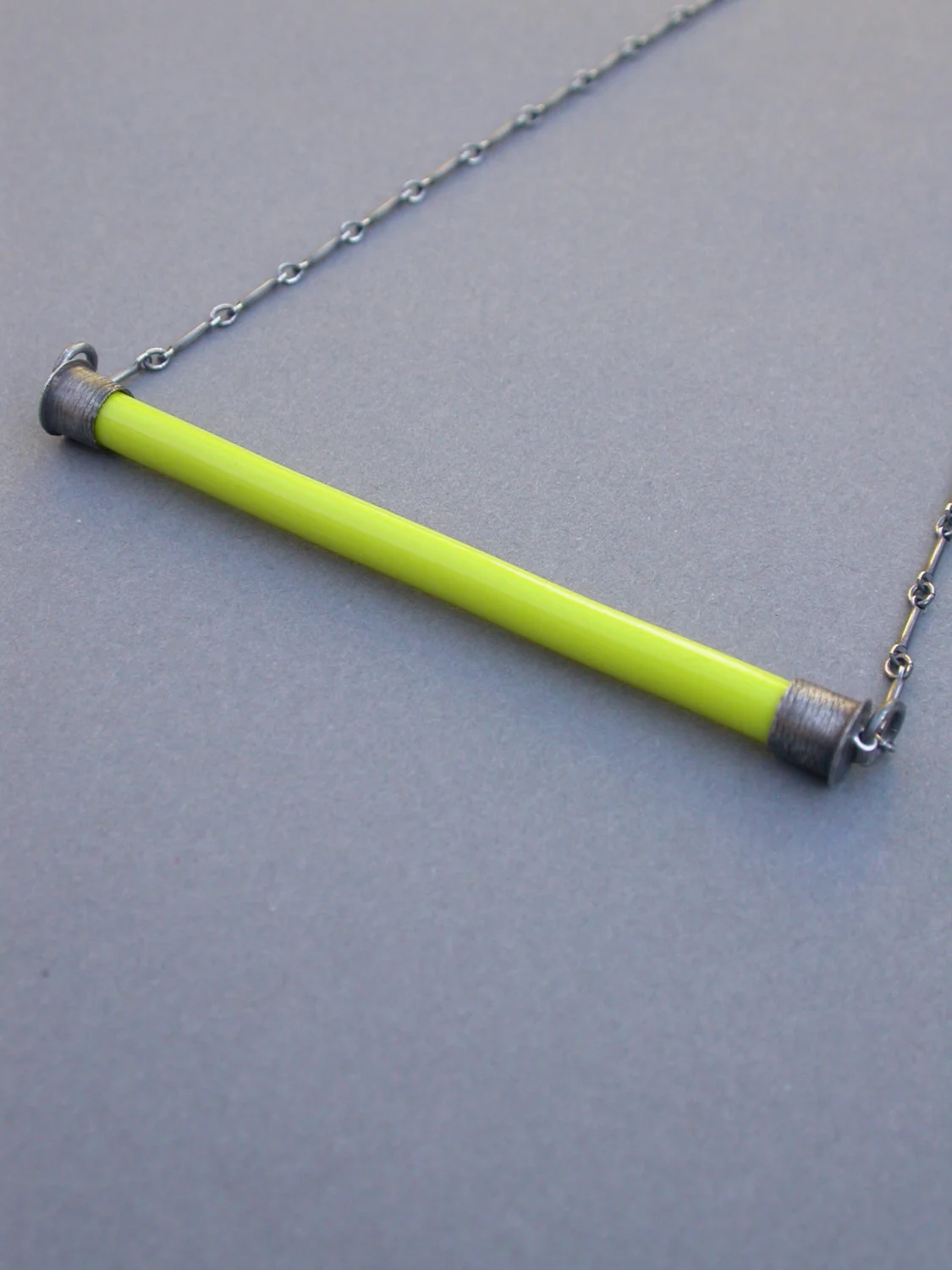 the color bar pendant in BRIGHT YELLOW features a sleek piece of glass in a delicious vibrant yellow color as well as handmade end caps in oxidized sterling silver. this piece is finished with a krinkle chain and handmade clasp. the color bar pendant is my latest design. this piece is simple, versatile and quite unique.