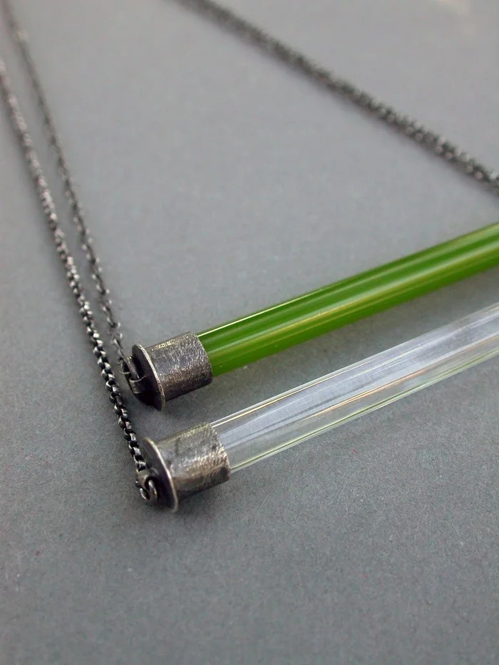 the color bar pendant in GRASS features a sleek piece of glass with a modern grass green piece of glass as well as handmade end caps in oxidized sterling silver. this piece is finished with a rolo chain and handmade clasp. the color bar pendant is my latest design. this piece is simple, versatile and quite unique.
