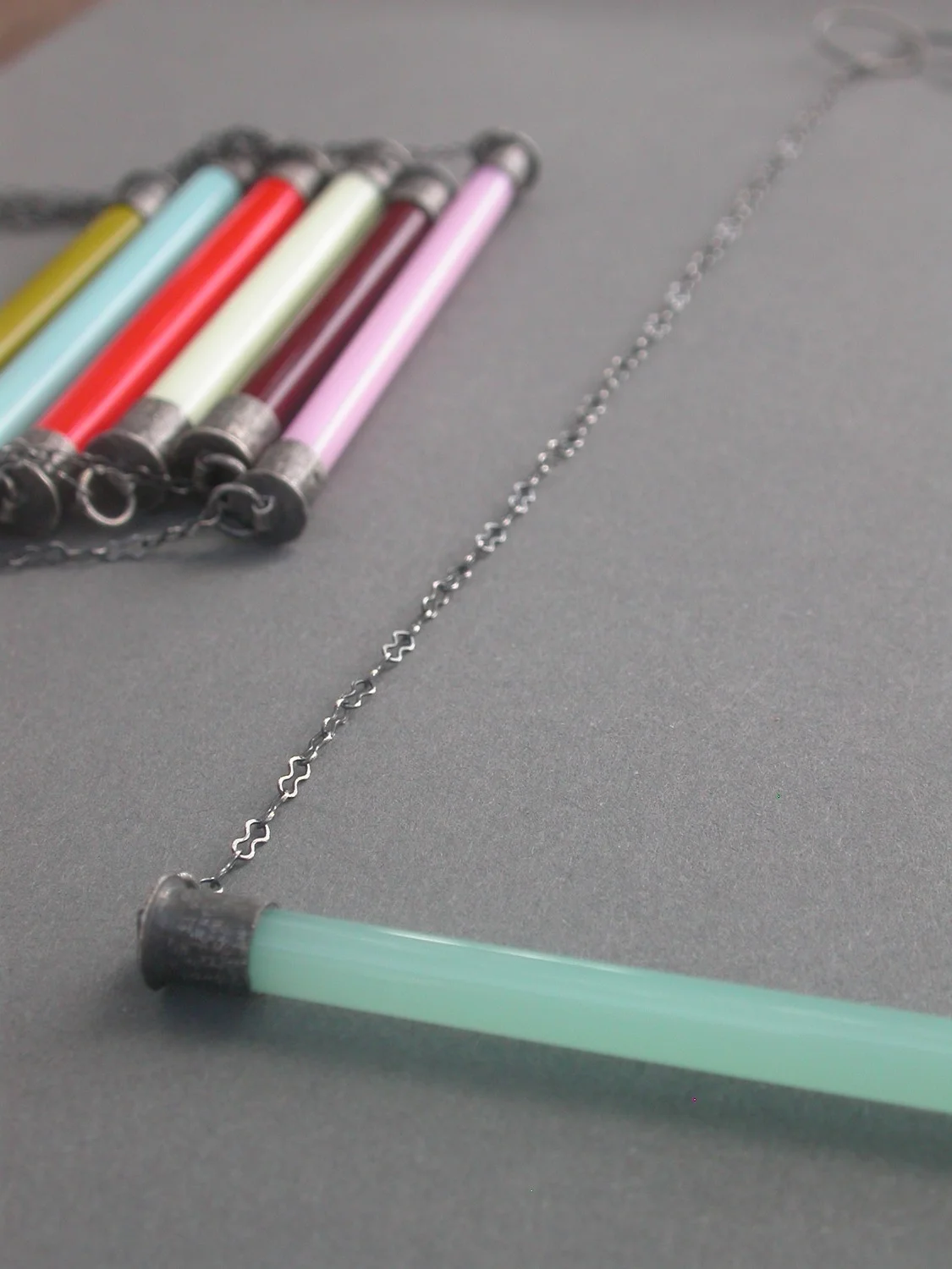 the color bar pendant is made to order. due to the handmade nature there may be subtle differences between the necklace you receive and the pictures in the listing. each piece is made carefully with love and attention to detail. this listing is for the color bar pendant in GRASS only unless other wise specified in the notes to seller. other color bar pendants pictured in images are available in other listings. convo me if you don't see the color listed you wish for. please mention chain length desired in the notes to seller.