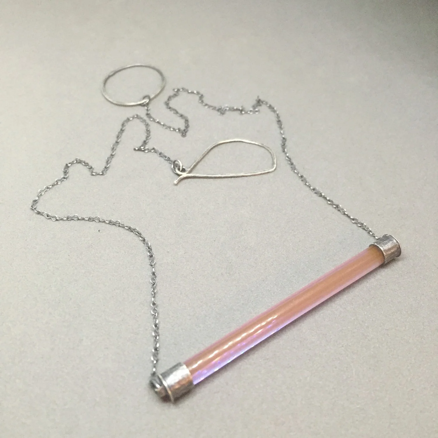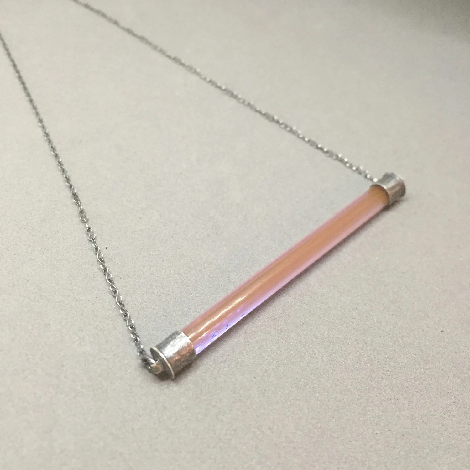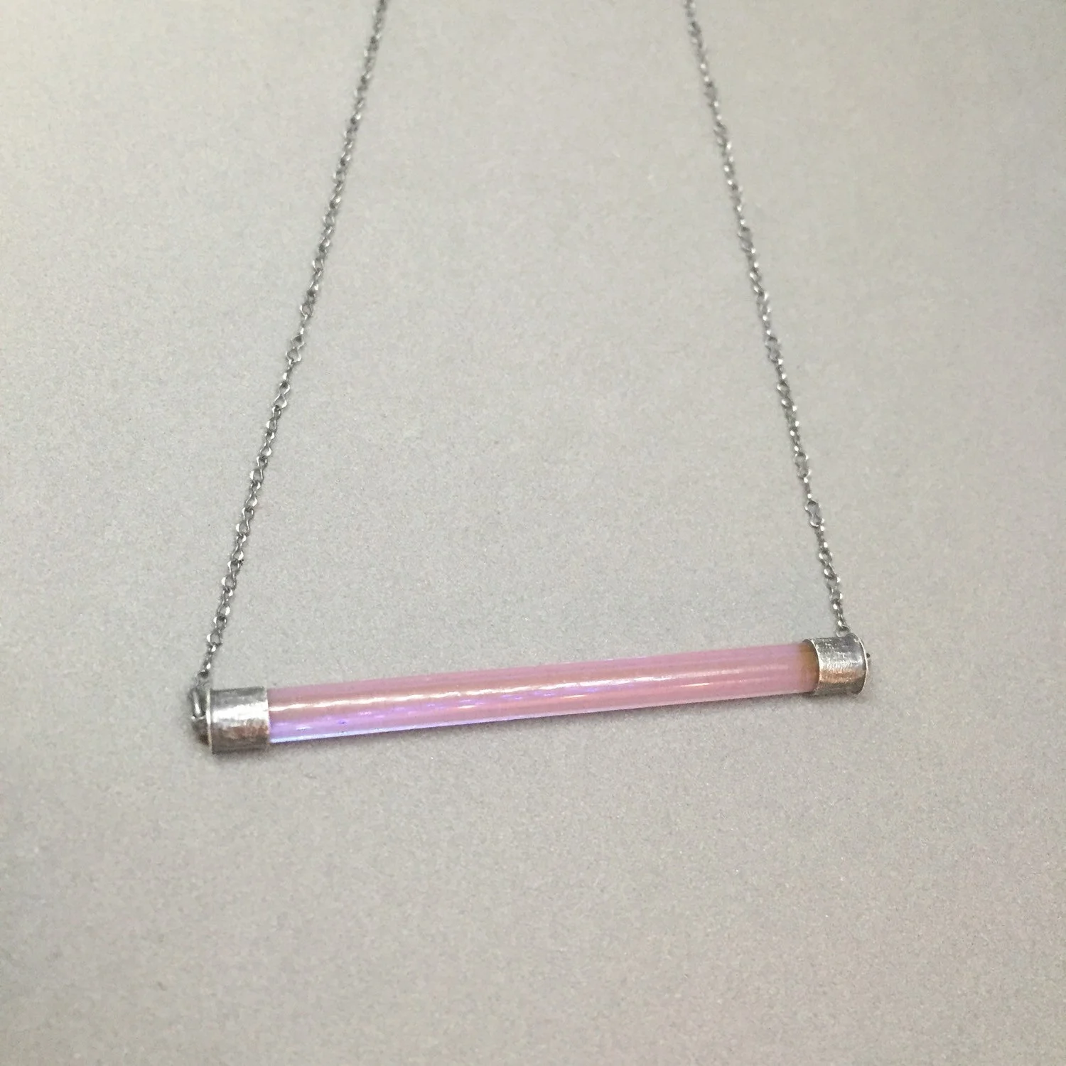 the color bar pendant in PINK OPAL features a sleek piece of glass in a delicious pink/purple iridescent opal color as well as handmade end caps in oxidized sterling silver. this piece is finished with a krinkle chain and handmade clasp. the color bar pendant is my latest design. this piece is simple, versatile and quite unique.