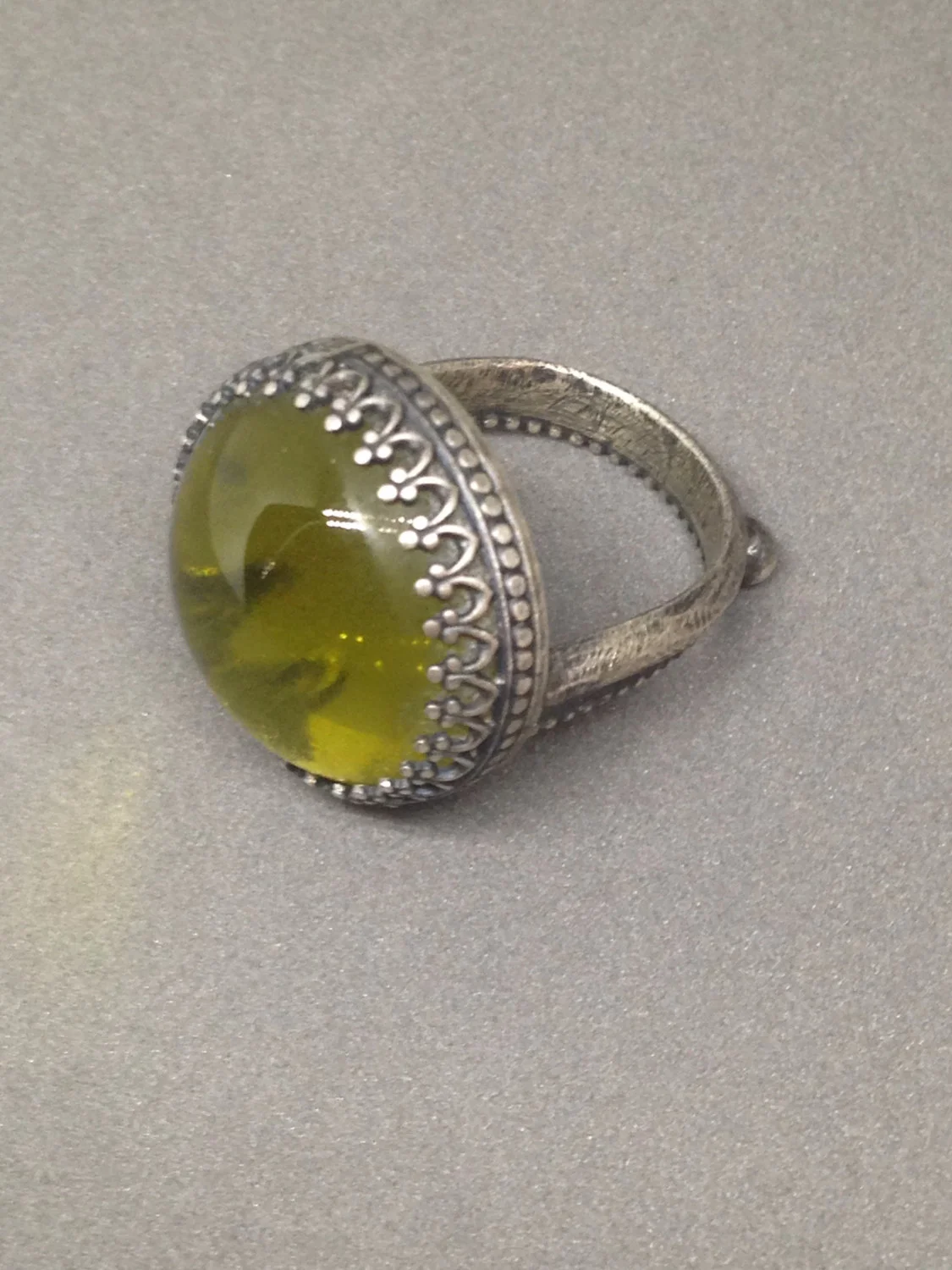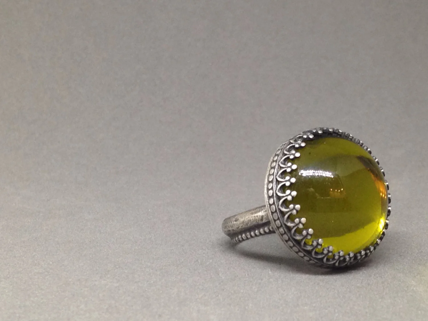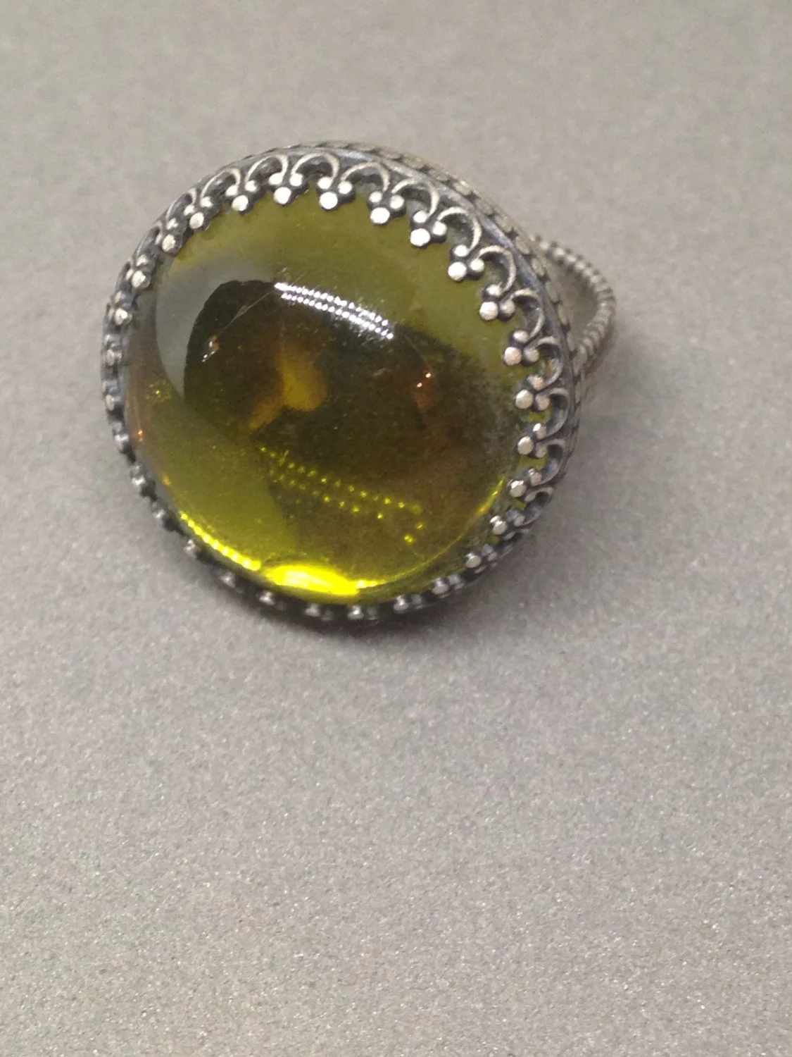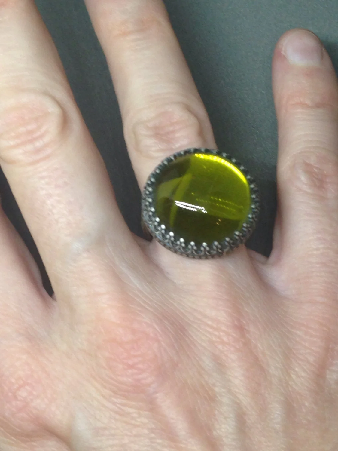 Acid moss green filigree vintage glass statement ring modern mystical mirror ball carnival ring gypsy eclectic old world style jewelry