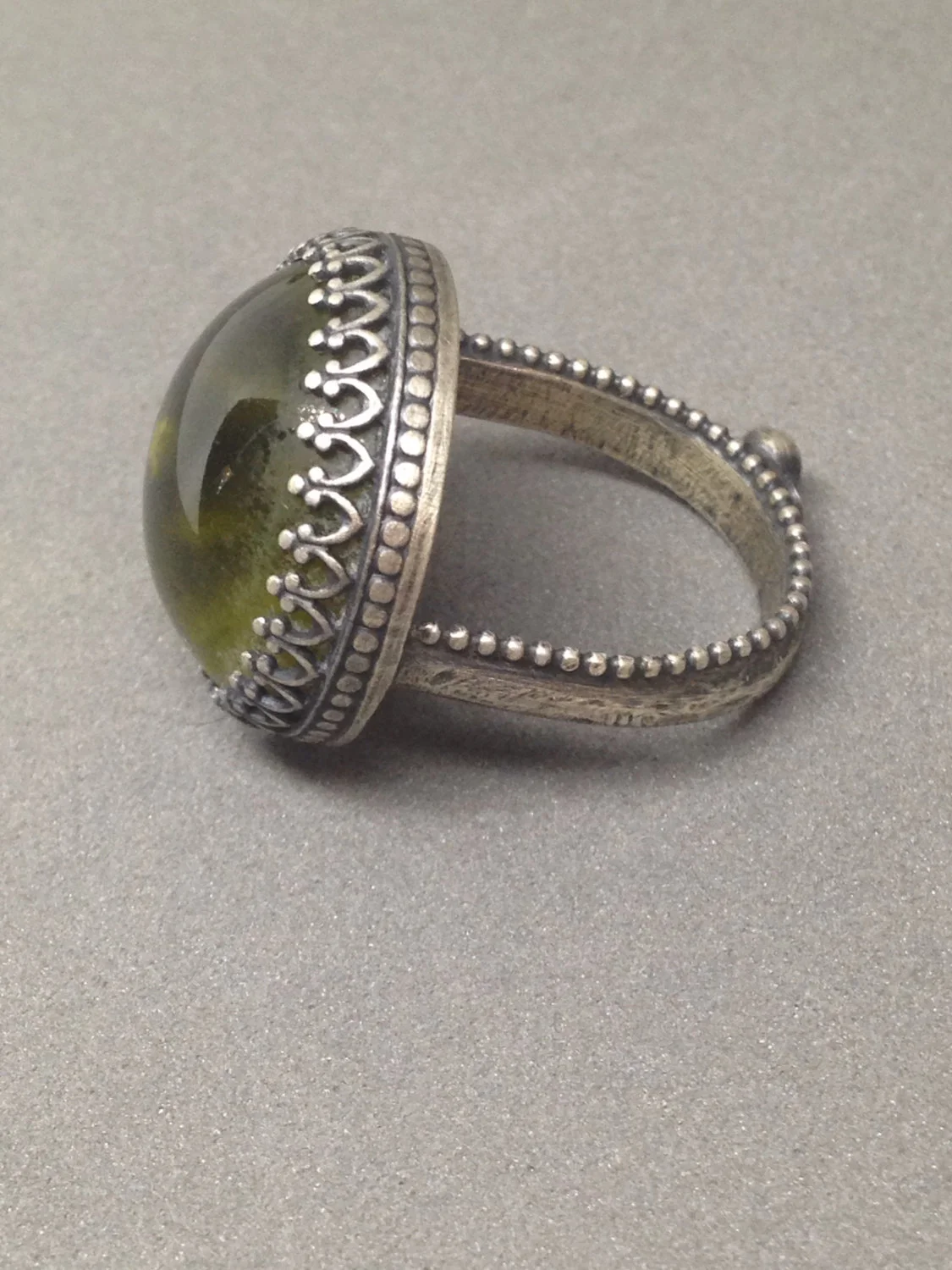 Old world style ring made with oxidized sterling silver and a vintage glass cabochon. Approximately 3/4" wide with filigree accented setting and a unique horseshoe shaped band.