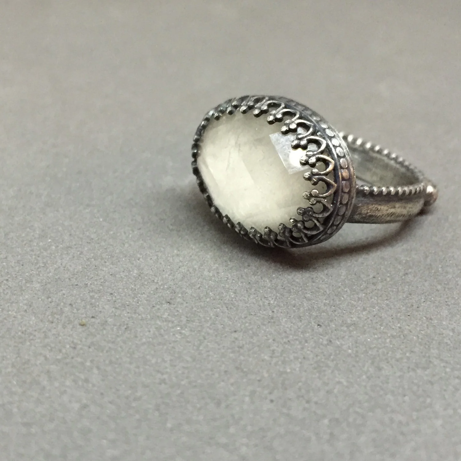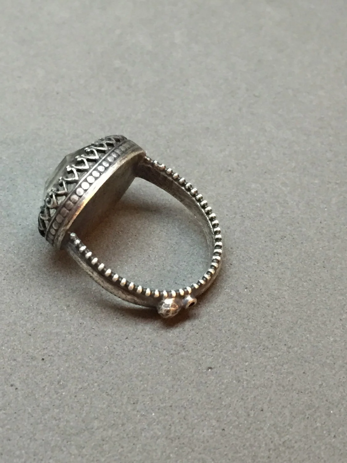 fancy cocktail ring in clear vintage faceted is made with oxidized sterling silver. these rings are luscious and have a flattering shape on any hand....vintage inspired. the band is uniquely u-shaped complete with beaded detail along one side and a few metal bobs and nubs on the bottom of the band.