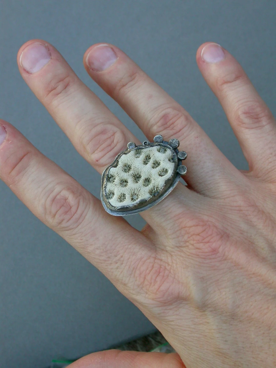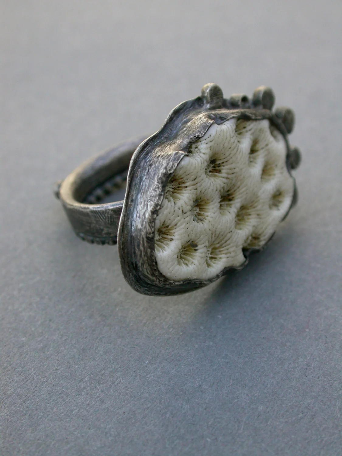 Statement ring made with oxidized sterling silver and found coral. This coral was found in St. Petersburg, FL washed up on the beach. This beautiful gift from nature is highlighted in this wearable modern art ring. It's eclectic, earthy, rustic in person. This piece is made to order. All pieces of coral used will vary slightly in shape, size and texture. Approximately 1"-1.5" wide. If you have a particular size in mind please leave interested width in the notes section during checkout.