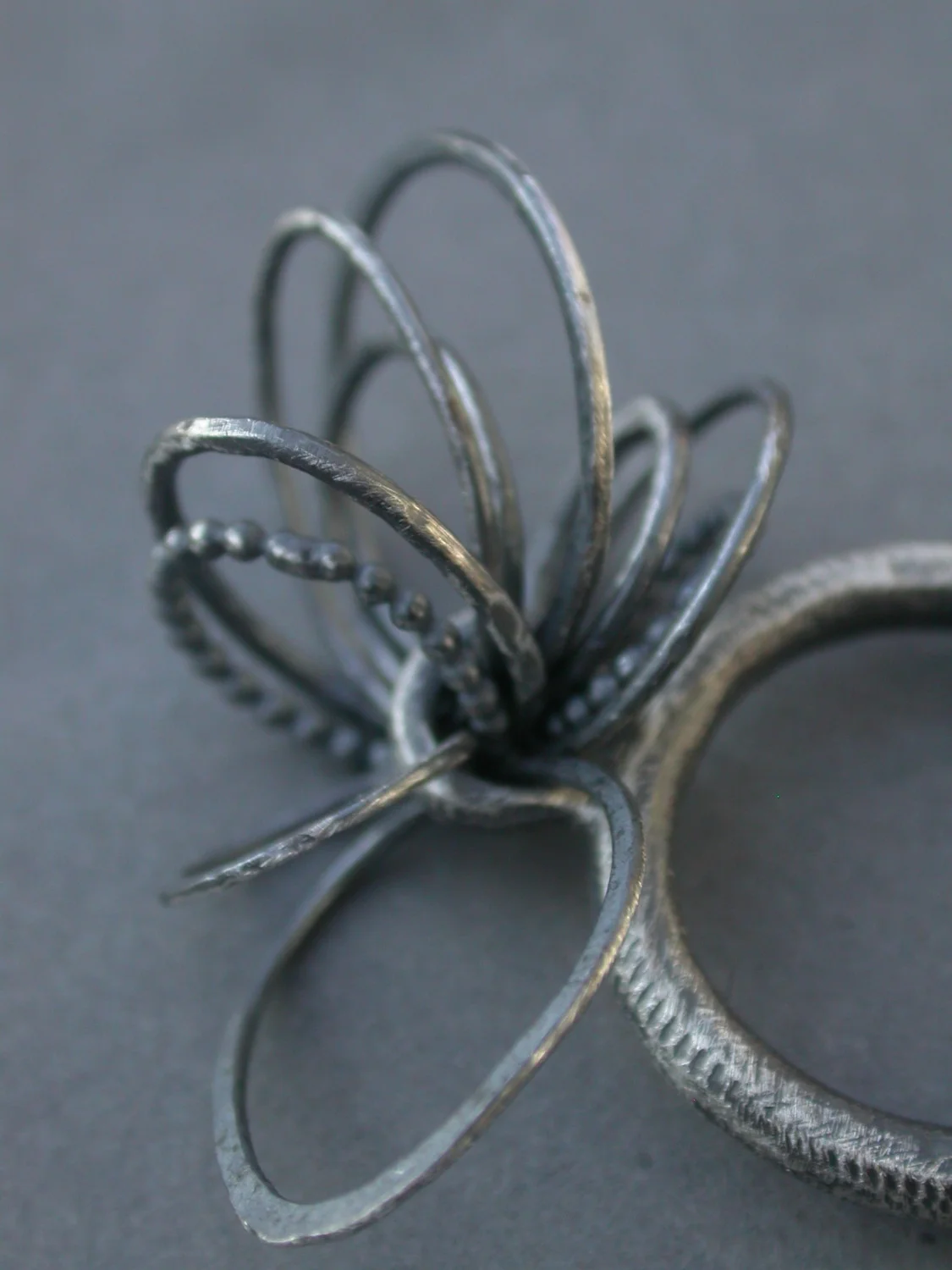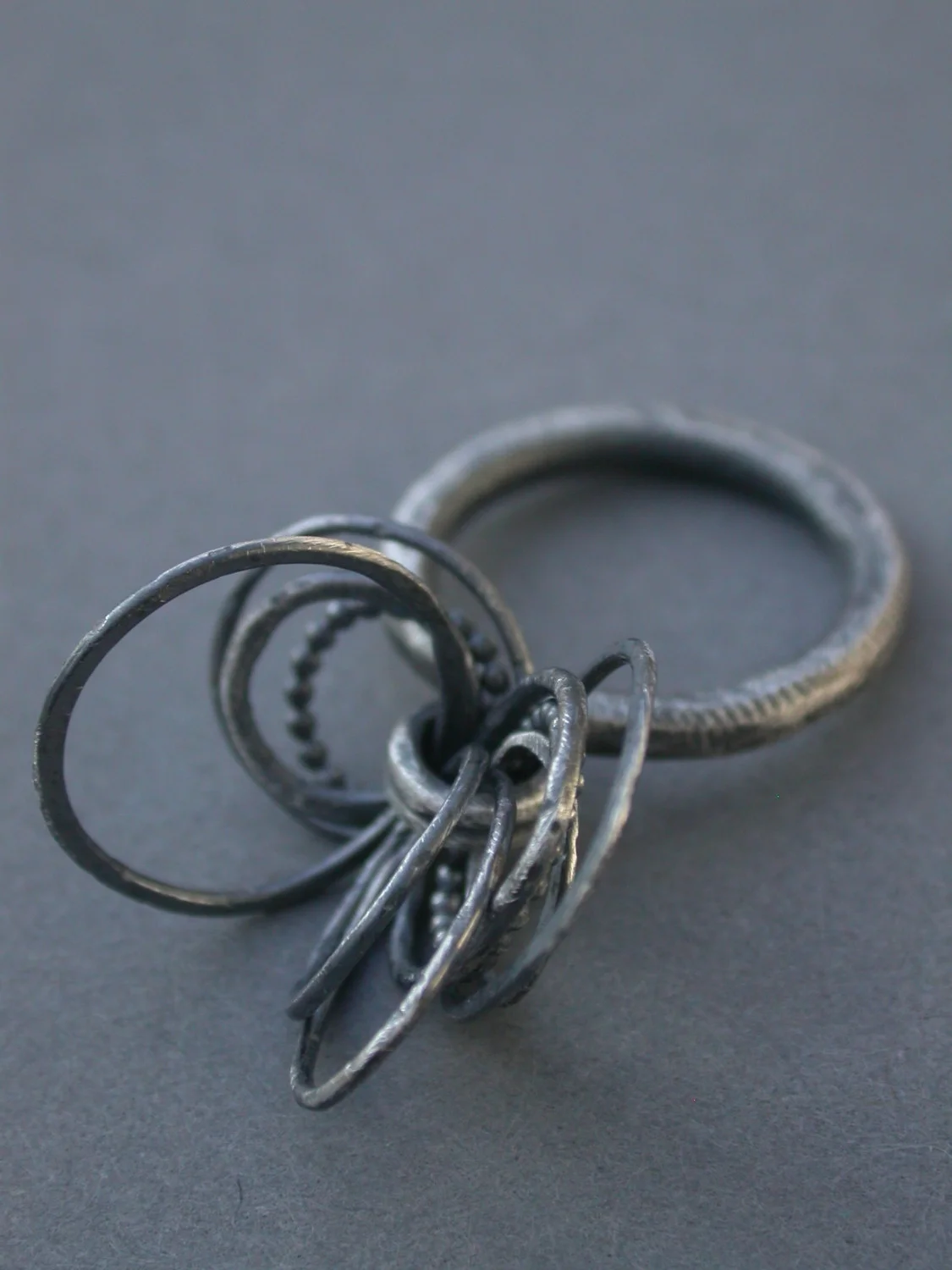 the "toy (denise) ring" is a piece i created for my awesome mom. it's a reinterpretation of a ring i made her 9 or 10 years ago. it's completely made of sterling silver: formed, soldered sanded, textured then oxidized and sanded once again to finish out this fun and unique kinetic ring. as each loop is independent and moves freely about as you motor thru your busy day. a nice conversation piece...