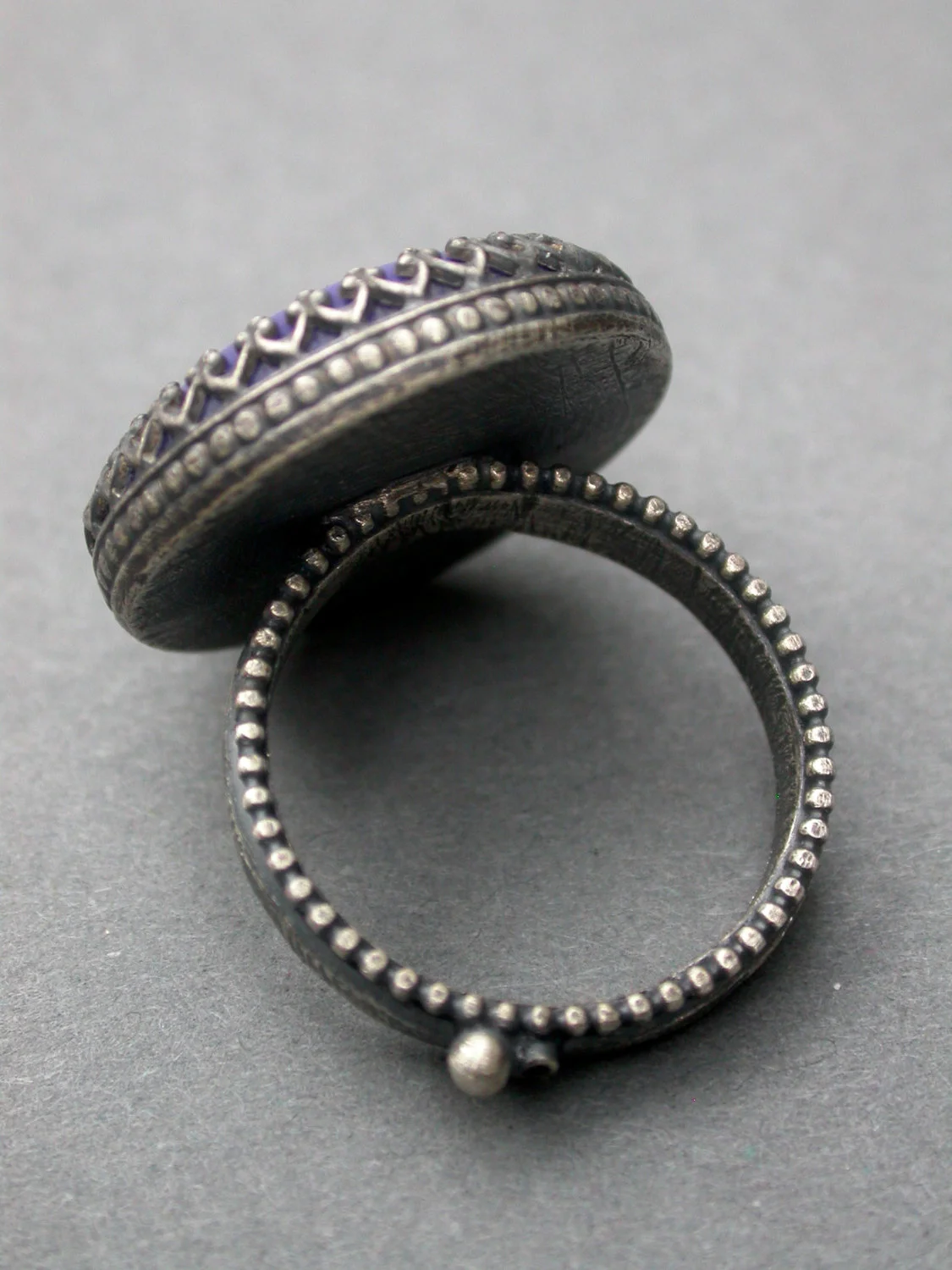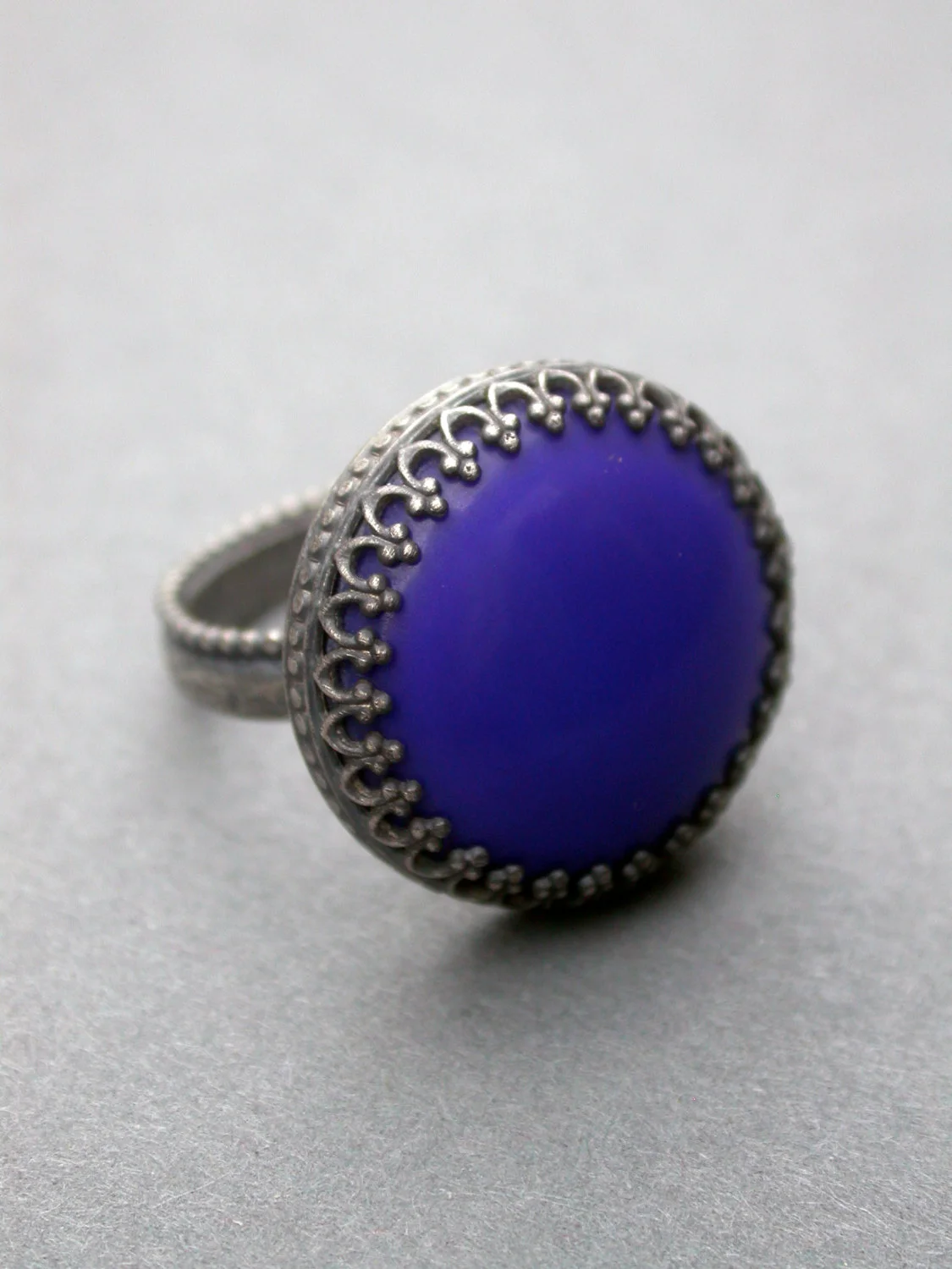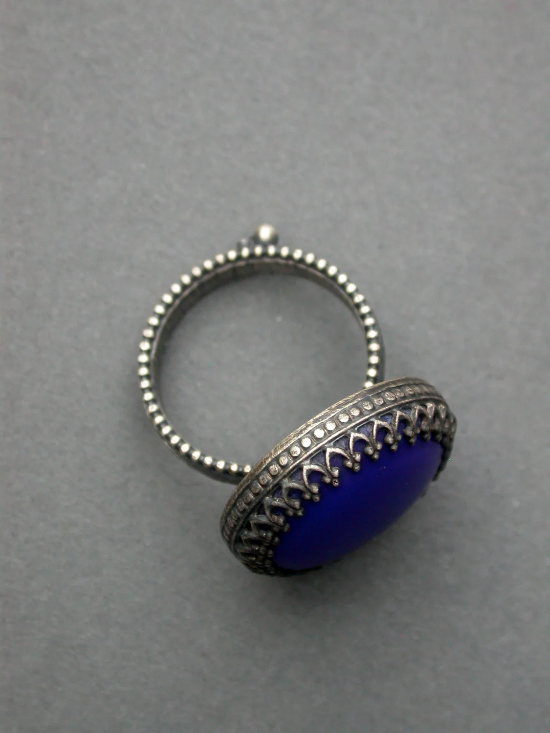 the "filigree cocktail ring" is made with oxidized sterling silver and a wonderful deep lapis blue piece of vintage glass. these rings are luscious and have a flattering shape on any hand....vintage inspired. this particular band is round and complete with beaded detail along one side and a few metal bobs and nubs on the bottom of the band. the glass piece is around 3/4" wide