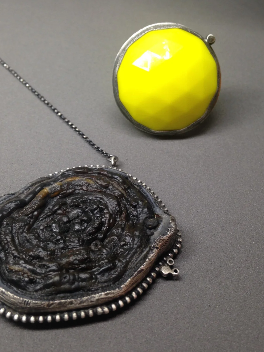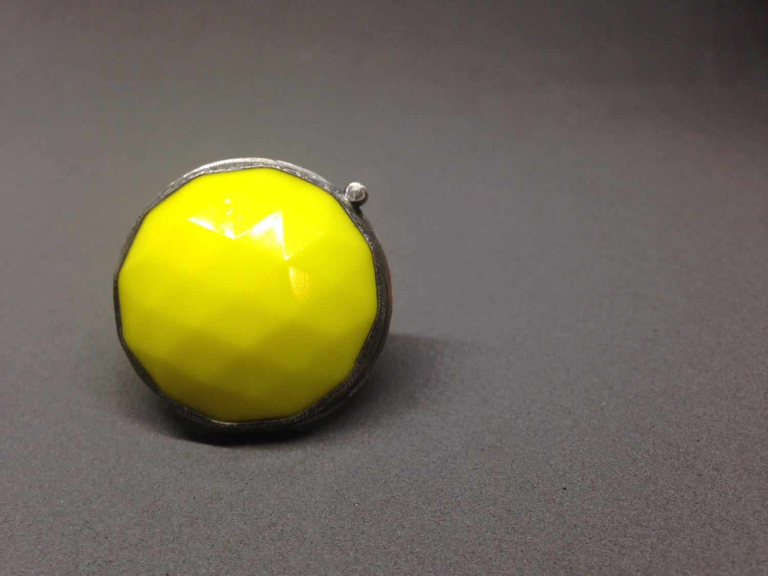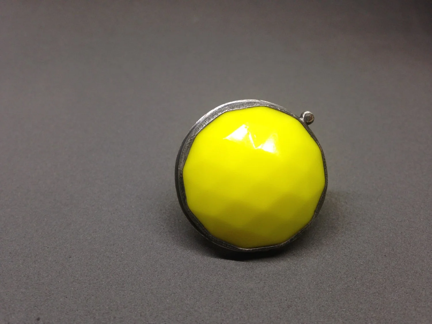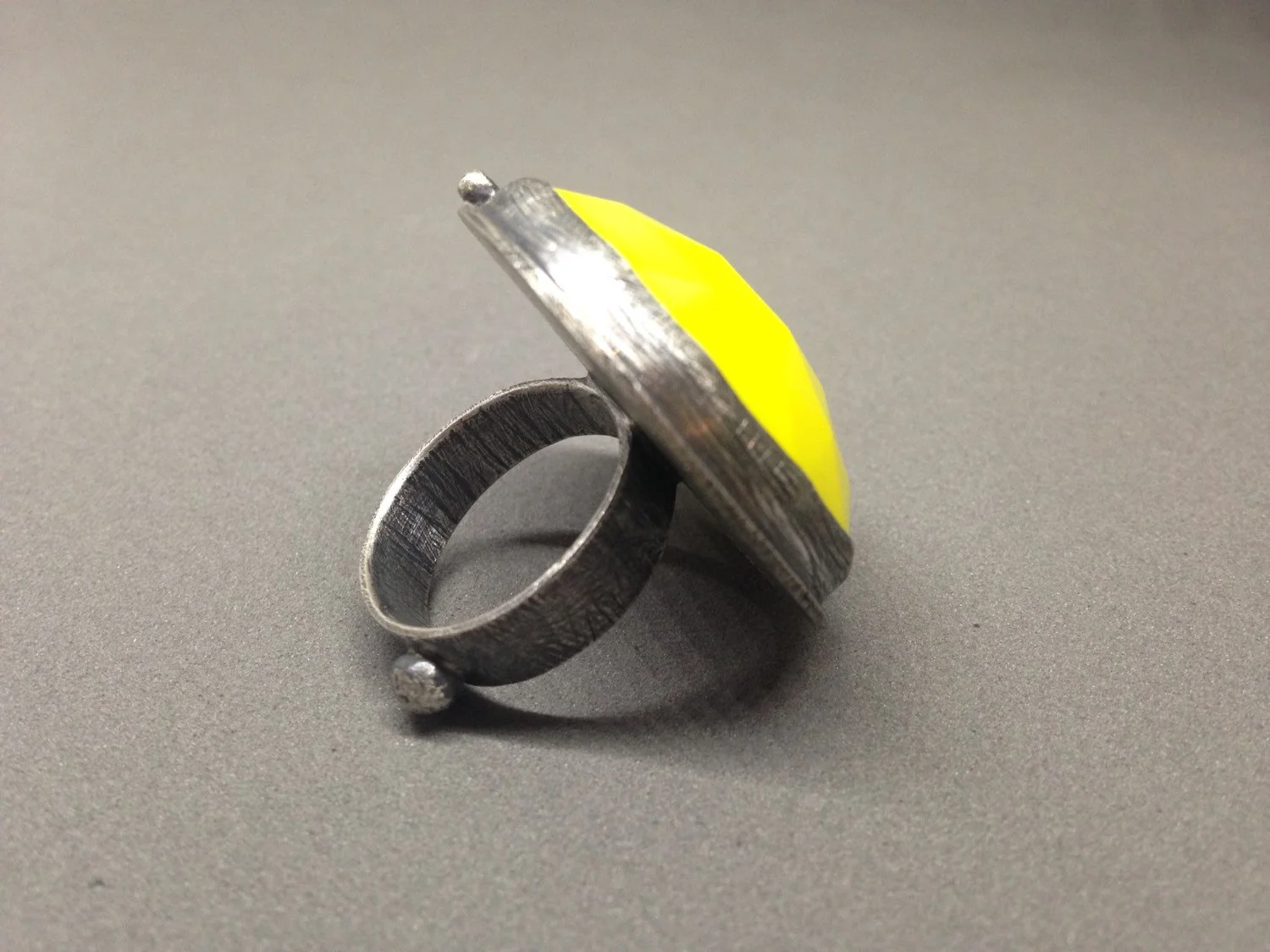 Statement ring made with oxidized sterling silver and a large neon yellow vintage glass piece.