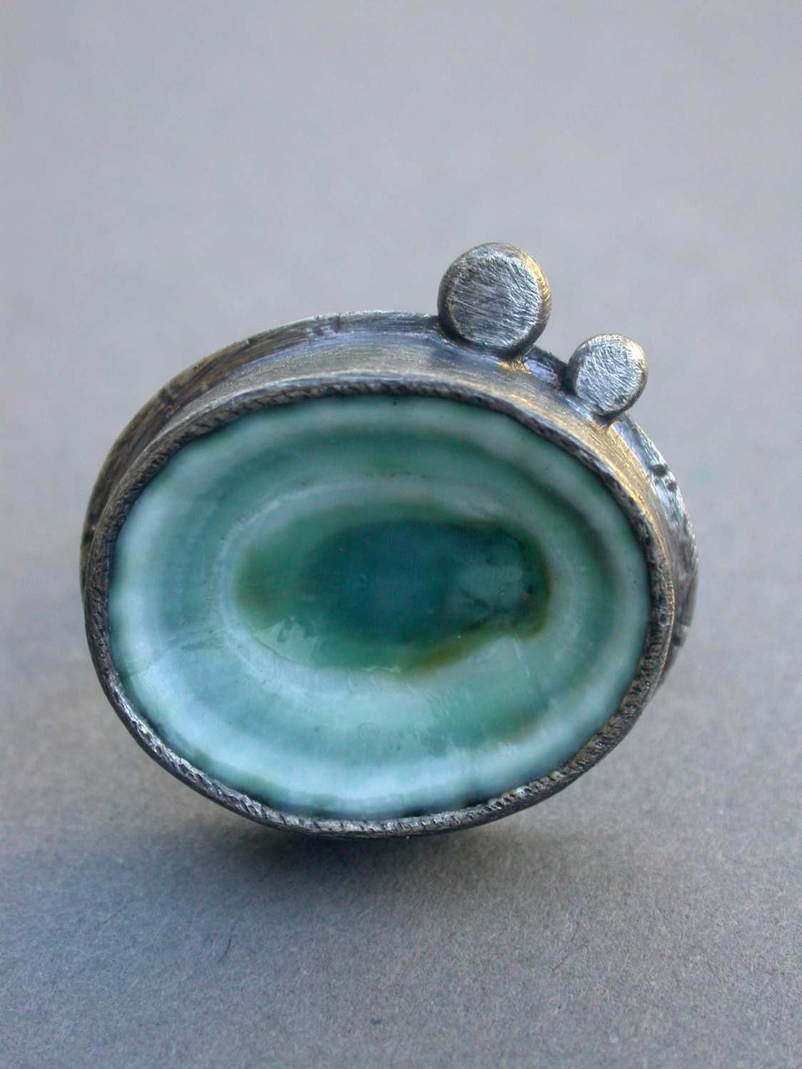 the "limpet ring" is made with oxidized sterling silver and a limpet shell. the exposed side of the shell is concave......so the "stone" has a beautiful cupped surface. i have lined the back portion of the shell to make the "stone" very durable. the images show three different limpet rings so you can see some variety in the limpet shells.