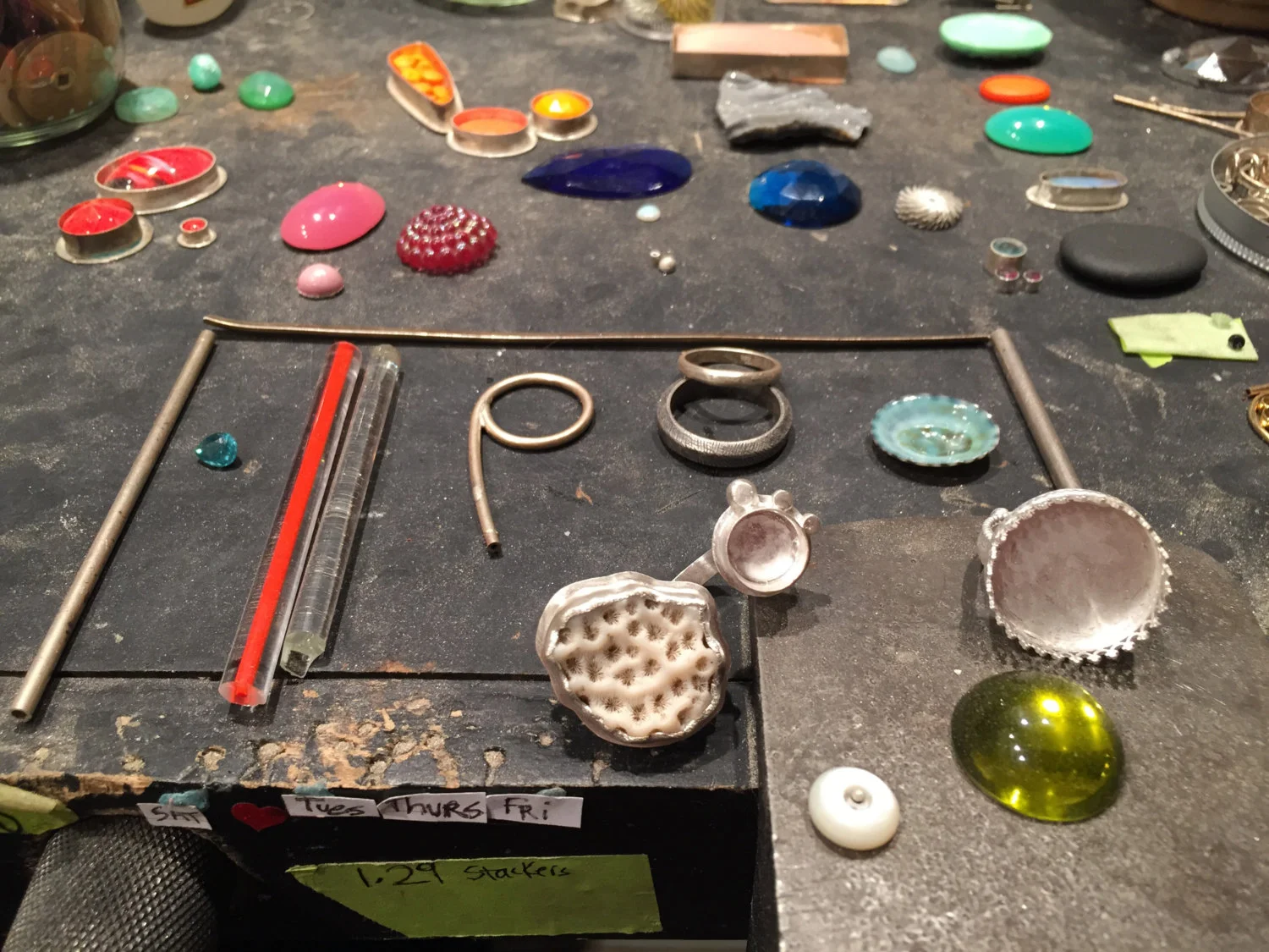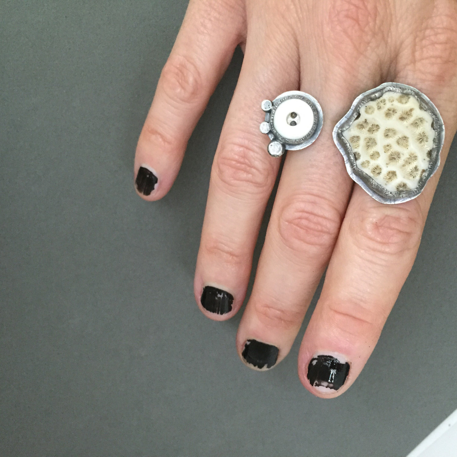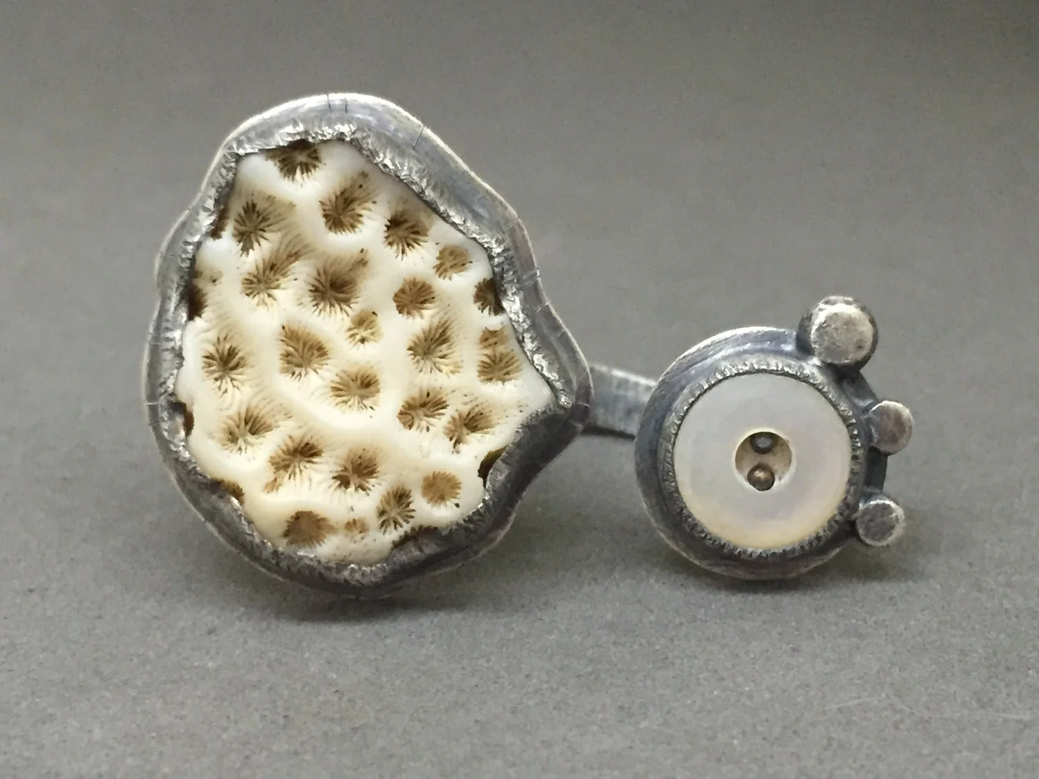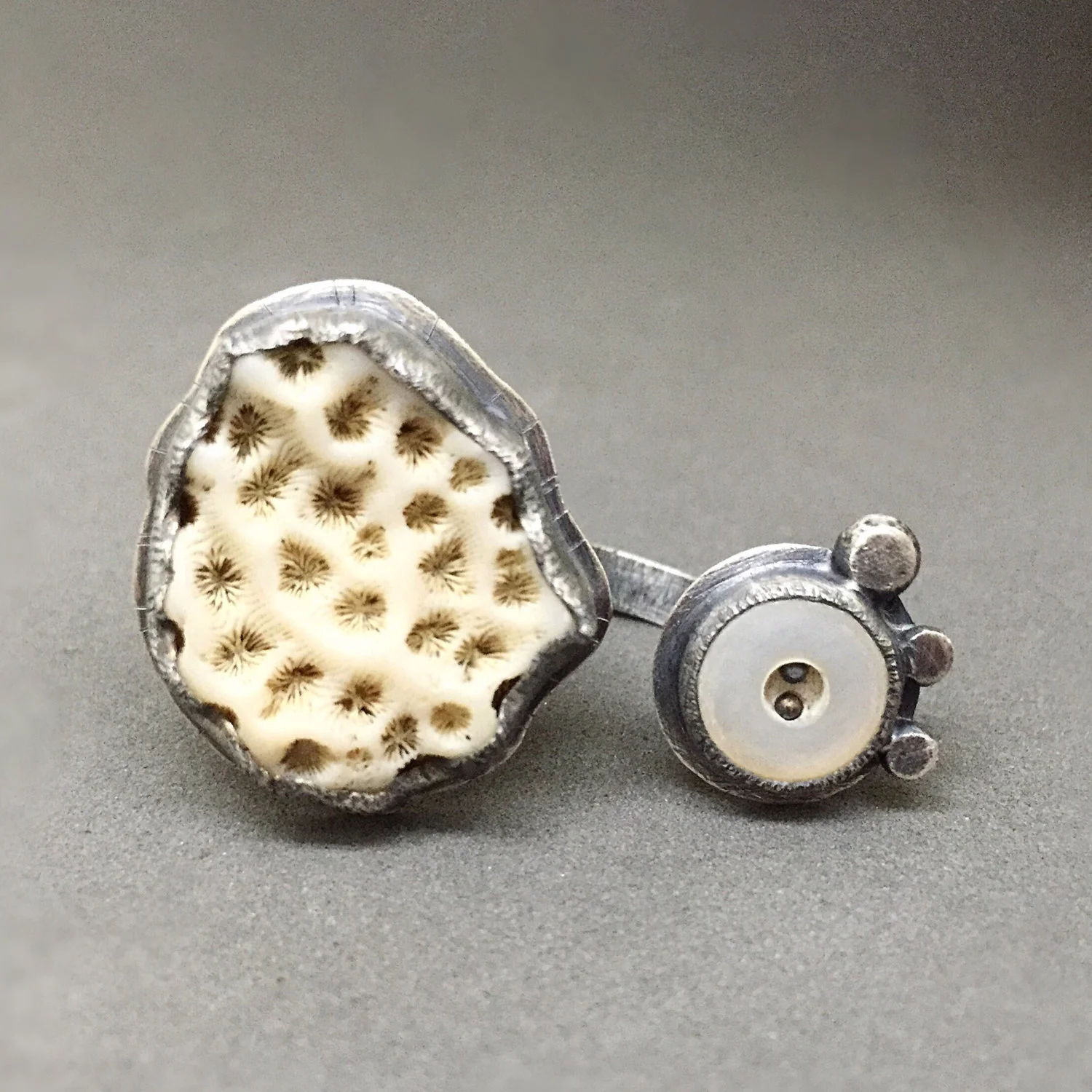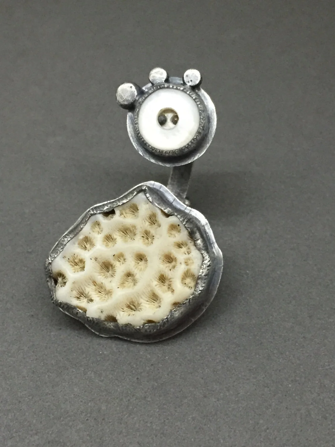 OOAK found coral and mother of pearl ring. this ring is a conversation piece. artfully made featuring a wonderful found piece of coral and a mother of pearl button from my grandma's button collection. i remember sitting at her kitchen table sifting through her tin. she didn't think anything of it but to me it was like christmas morning.