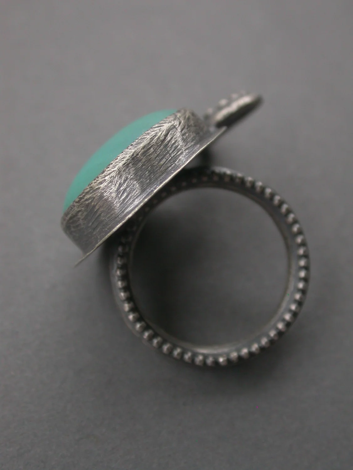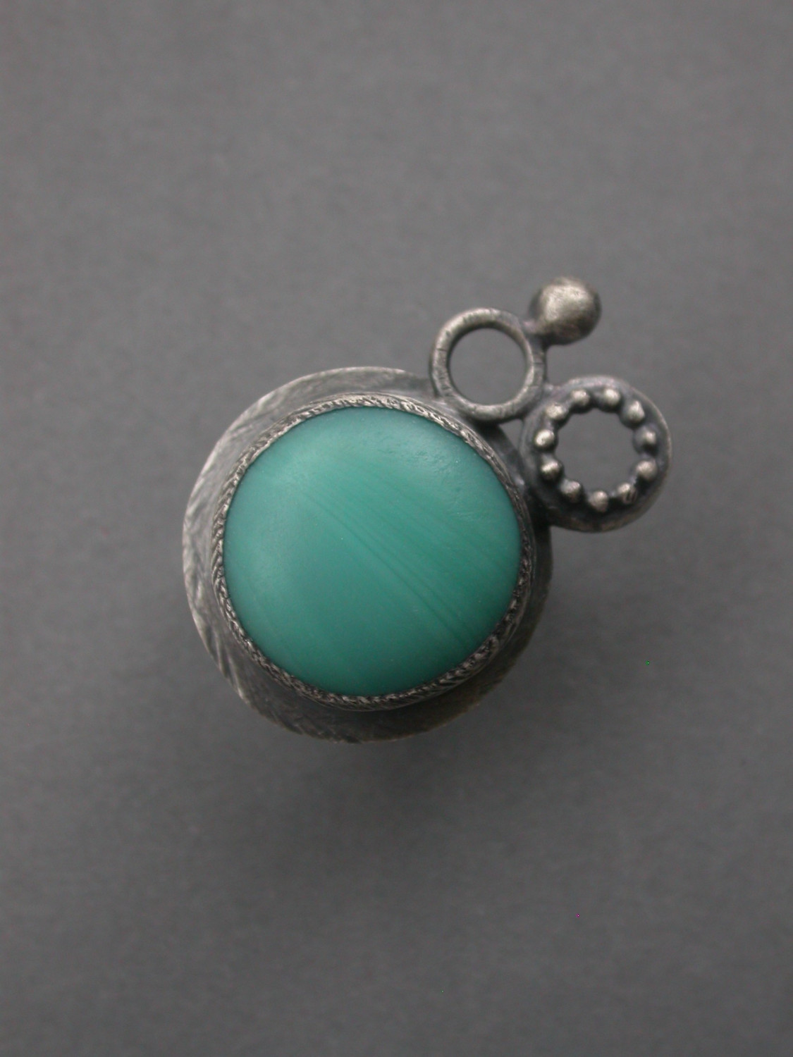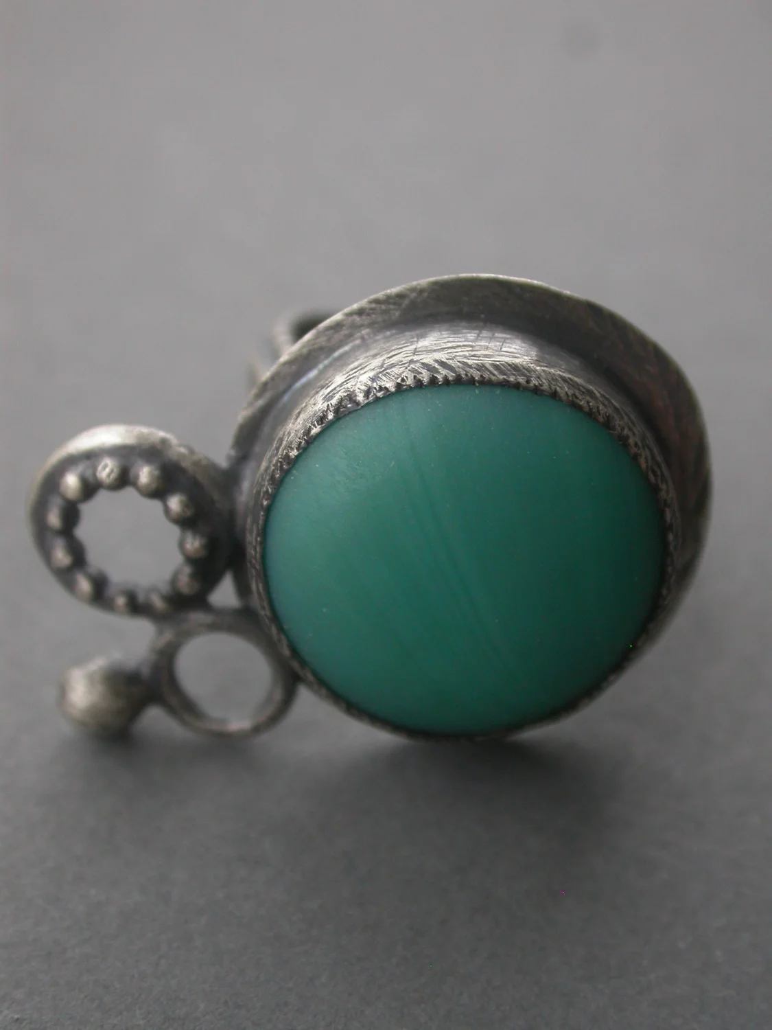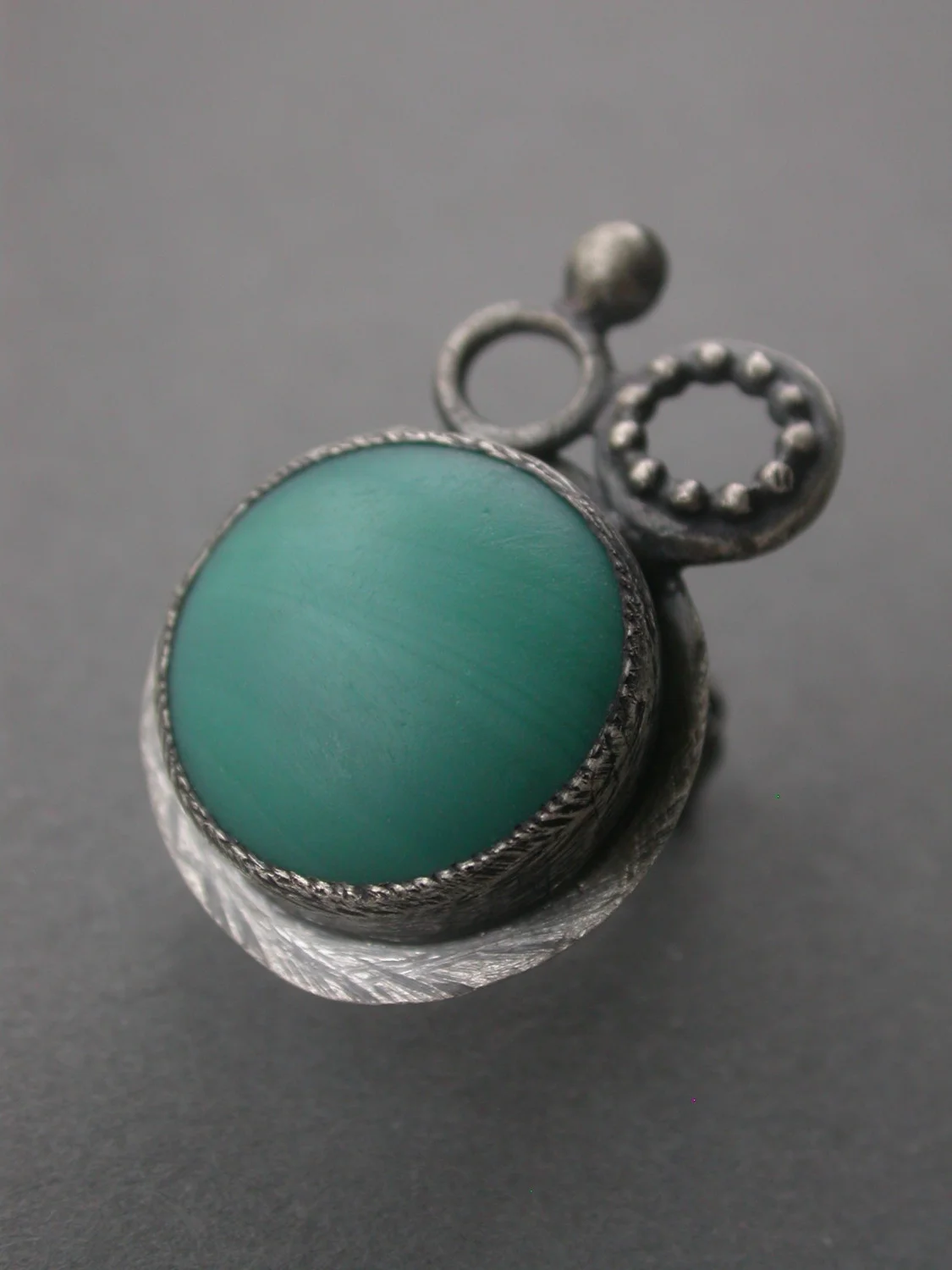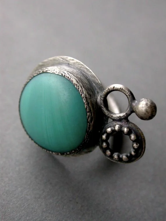 the "peacock ring" is made with a piece of peacock blue green glass that i have sanded to a luscious matte surface and set in an oxidized sterling silver setting accented with an edgy and funky asymmetrical circle pattern .
