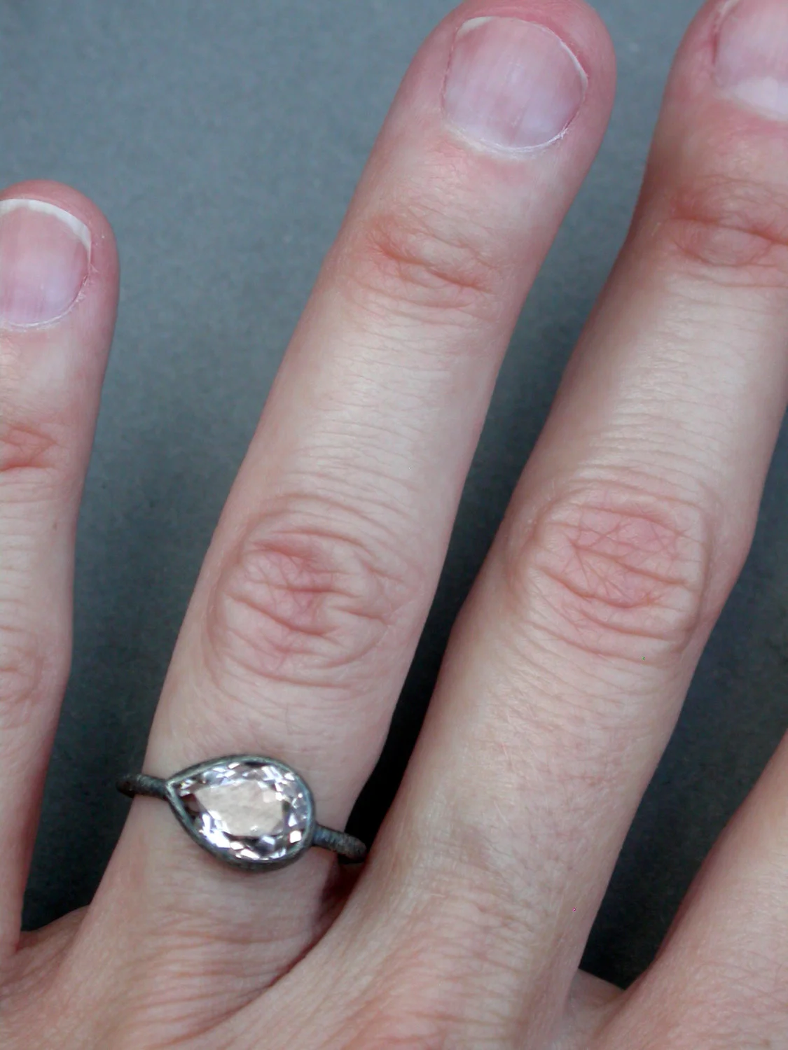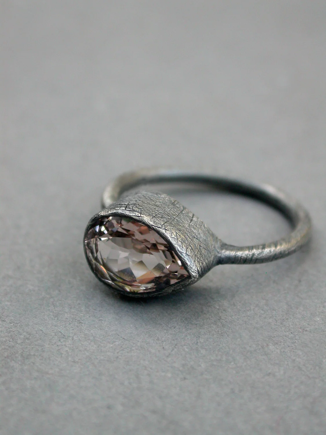morganite engagement ring wedding ring modern rustic eclectic raw organic oxidized sterling diamond alternative modern wedding pear shaped