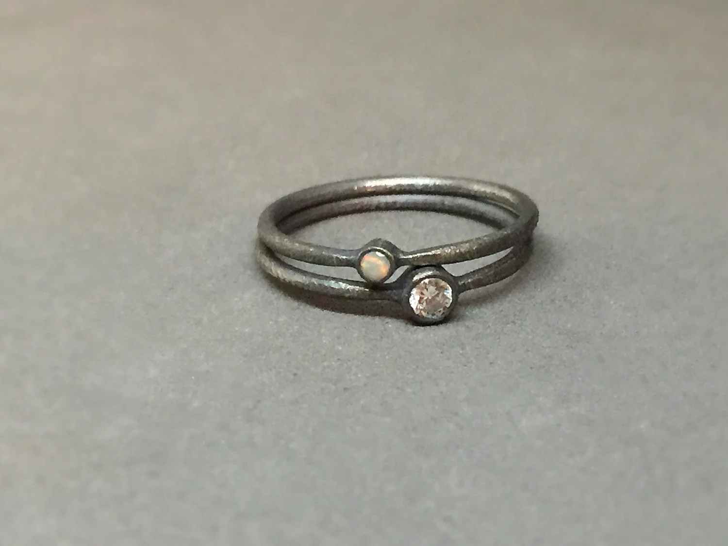 white diamond opal wedding ring engagement ring stackable wedding modern rings simple oxidized sterling silver october april birthstone ring
